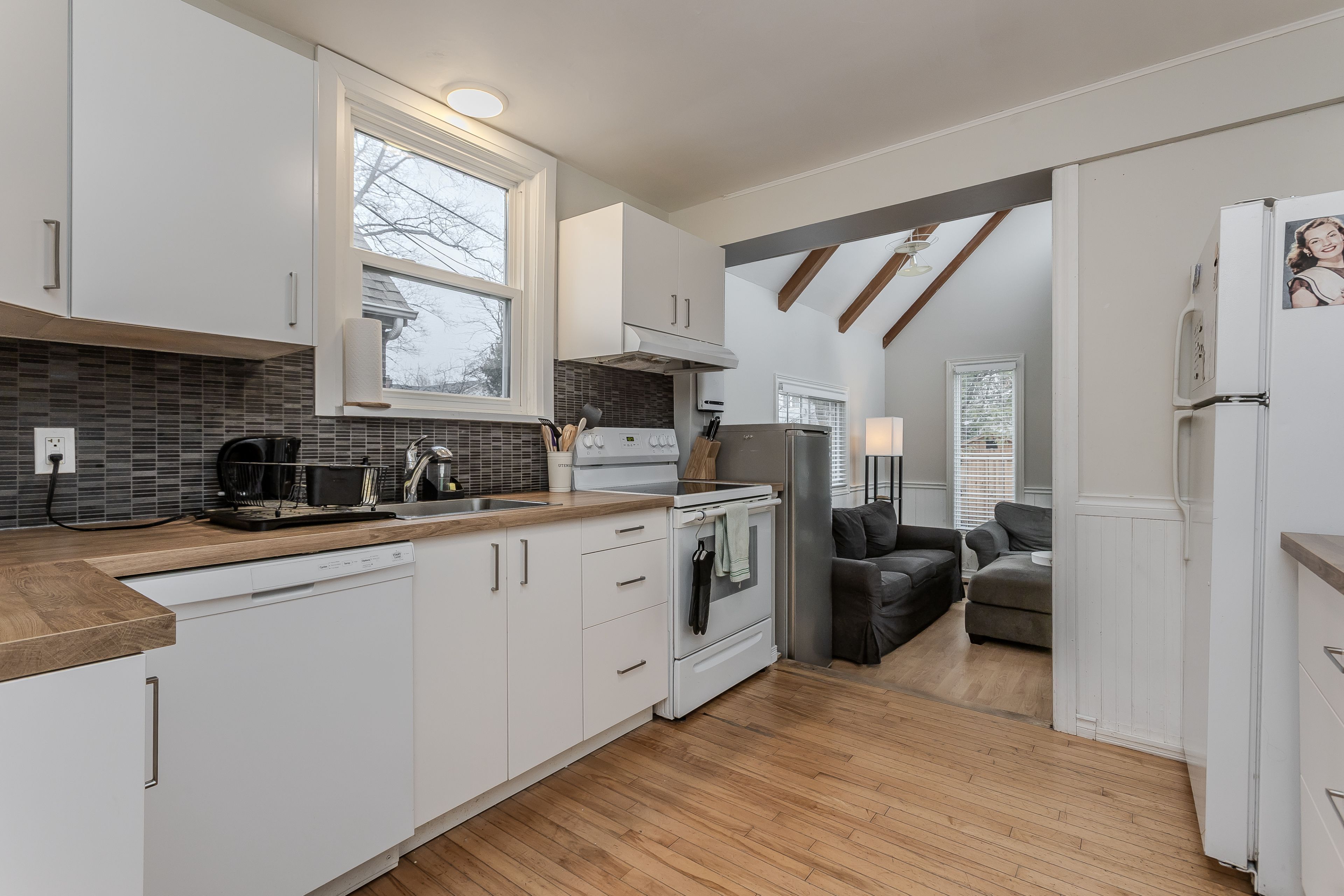 • Functional kitchen with new appliances and a large window overlooking the yard.