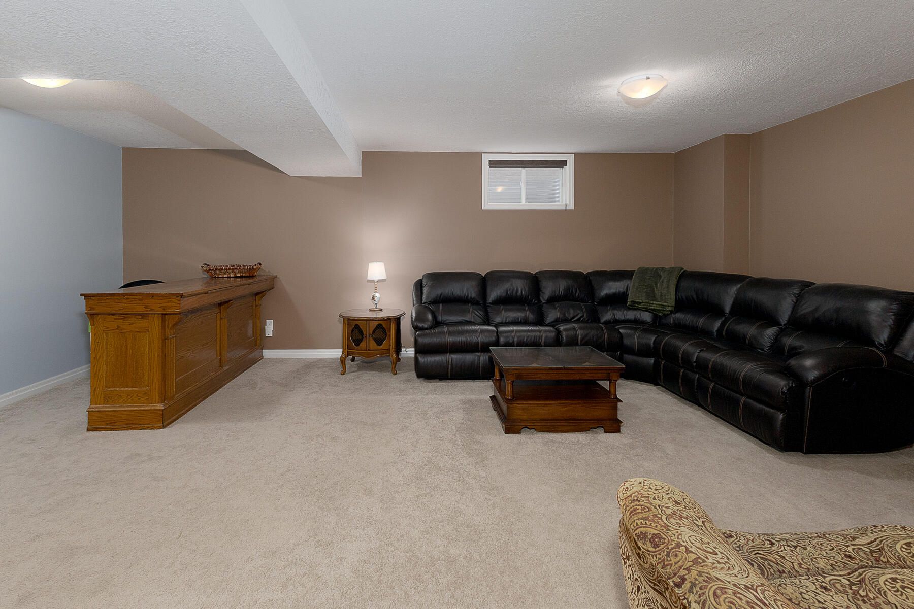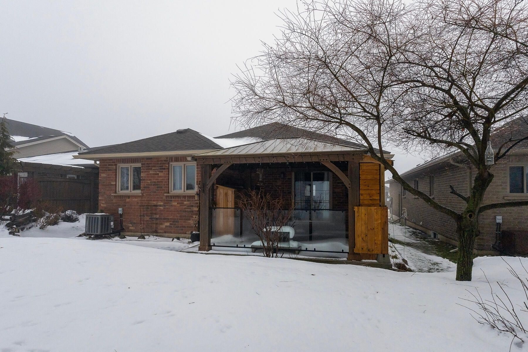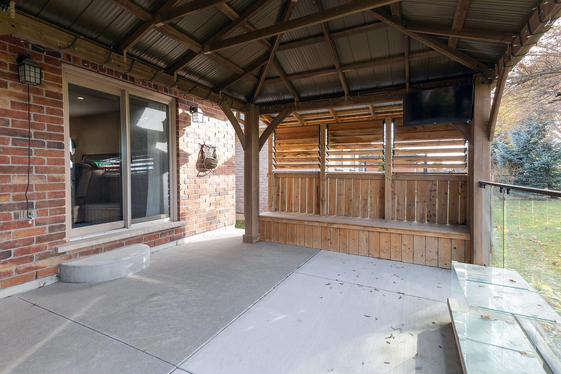 Nestled in a highly sought-after location, this well-maintained brick bungalow offers exceptional comfort and convenience on a quiet cul-de-sac, just a short walk to little falls public school. The main floor features an inviting open-concept layout with a bright kitchen, centre island with breakfast bar seating, and a seamless flow through the dining and living areas-complete with a cozy gas fireplace. From here, step out to the private backyard where a spacious covered poured-concrete patio awaits, showcasing a solid wood gazebo with a metal roof, built-in bench seating with storage, a mounted outdoor tv, and sleek glass railings overlooking the soccer fields behind-providing both peace and privacy. Originally designed with three bedrooms, the home currently uses one as a generous main-level laundry, though it can easily be converted back to a bedroom with a lower-level laundry option. The main level is complete with two bathrooms and two additional well-sized bedrooms. The partially finished basement extends the living space with a large recreation room, office area, 3-piece bath, and abundant storage-offering opportunities for future expansion or customization. Additional features include an attached garage with interior access, and a prime location close to amenities, walking trails, the pyramid recreation centre, friendship centre and much more. A wonderful blend of comfort, functionality, and an ideal setting for any lifestyle.