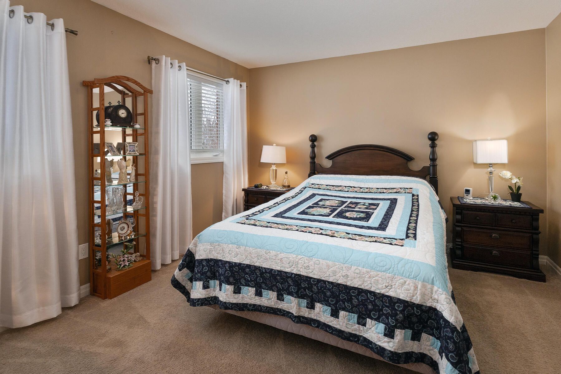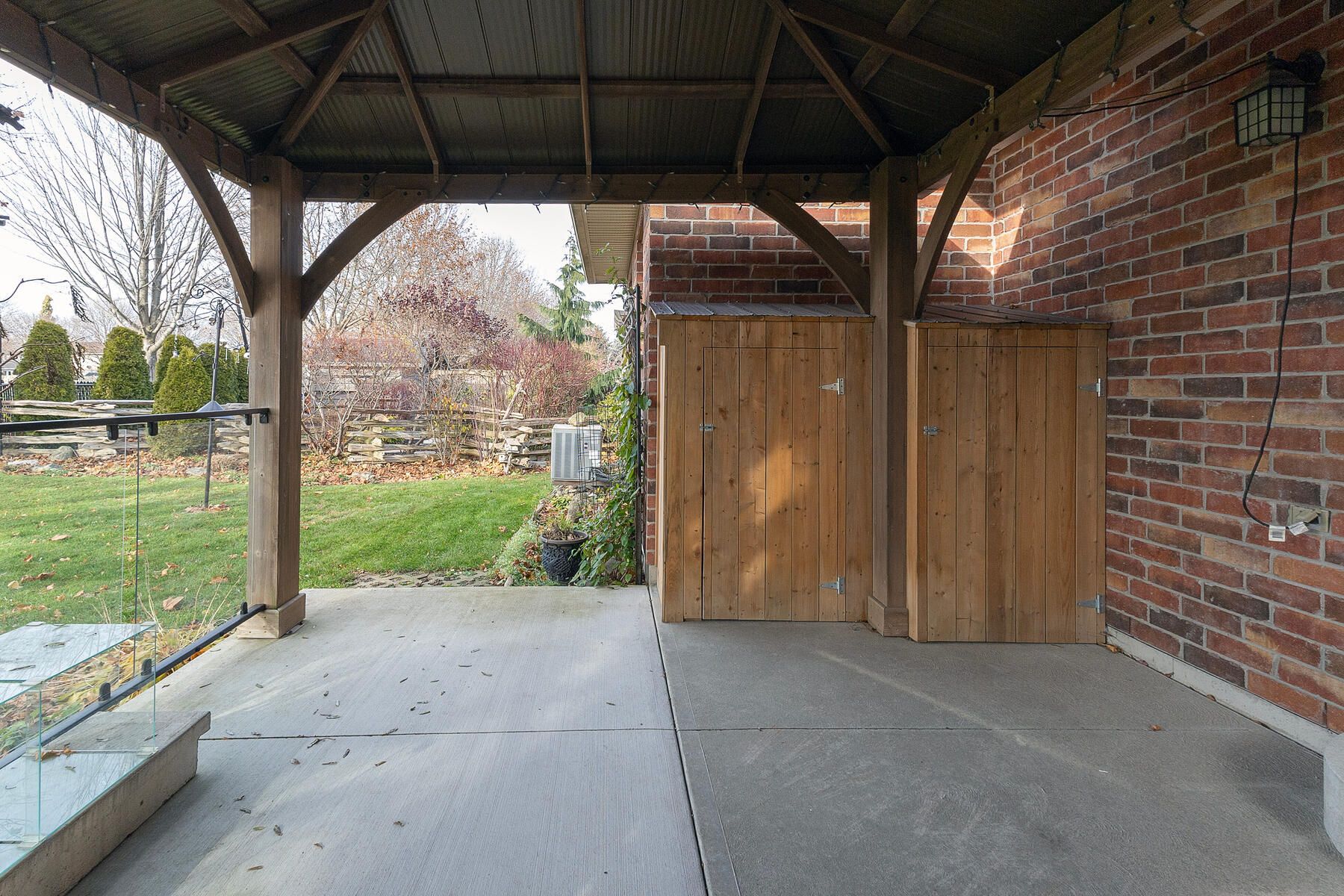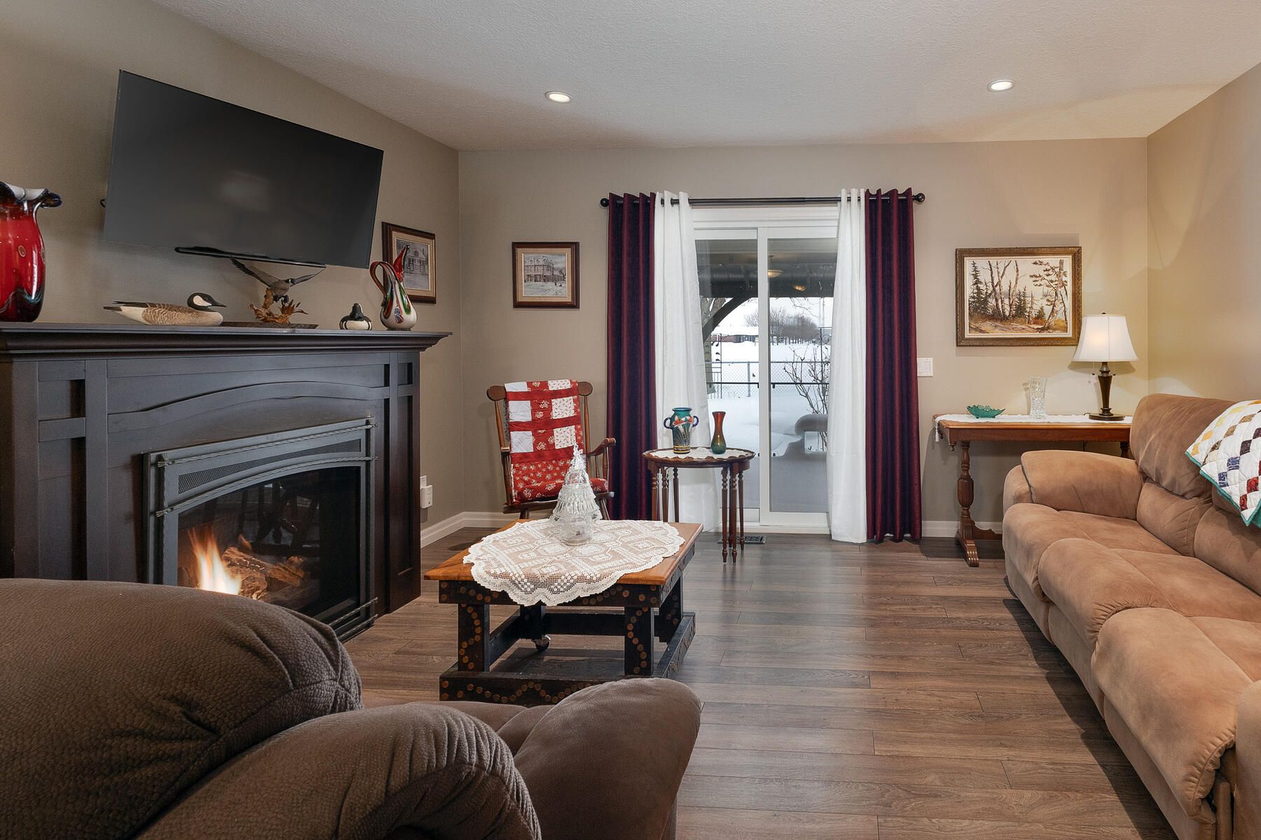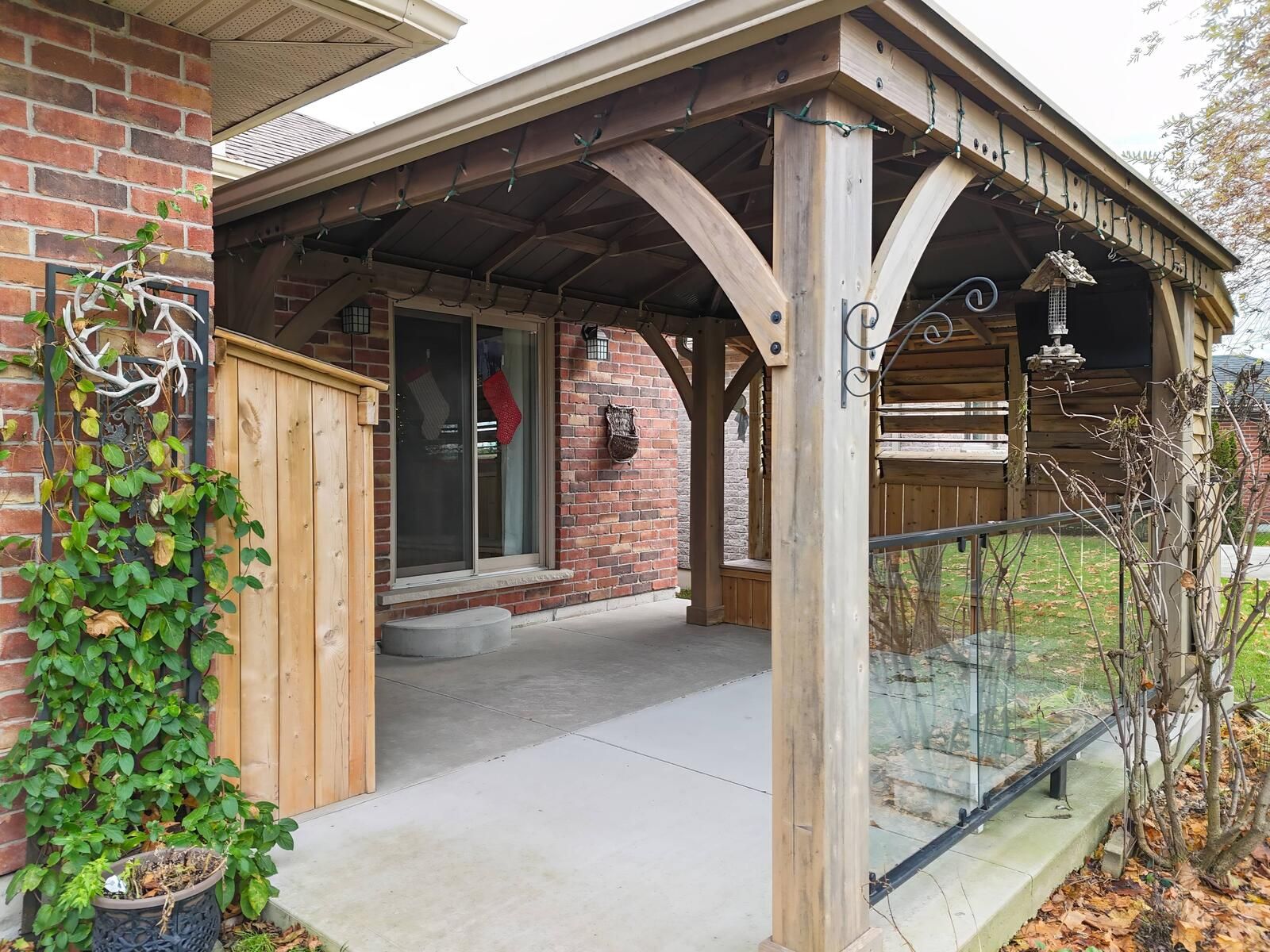 Nestled in a highly sought-after location, this well-maintained brick bungalow offers exceptional comfort and convenience on a quiet cul-de-sac, just a short walk to little falls public school. The main floor features an inviting open-concept layout with a bright kitchen, centre island with breakfast bar seating, and a seamless flow through the dining and living areas-complete with a cozy gas fireplace. From here, step out to the private backyard where a spacious covered poured-concrete patio awaits, showcasing a solid wood gazebo with a metal roof, built-in bench seating with storage, a mounted outdoor tv, and sleek glass railings overlooking the soccer fields behind-providing both peace and privacy. Originally designed with three bedrooms, the home currently uses one as a generous main-level laundry, though it can easily be converted back to a bedroom with a lower-level laundry option. The main level is complete with two bathrooms and two additional well-sized bedrooms. The partially finished basement extends the living space with a large recreation room, office area, 3-piece bath, and abundant storage-offering opportunities for future expansion or customization. Additional features include an attached garage with interior access, and a prime location close to amenities, walking trails, the pyramid recreation centre, friendship centre and much more. A wonderful blend of comfort, functionality, and an ideal setting for any lifestyle.