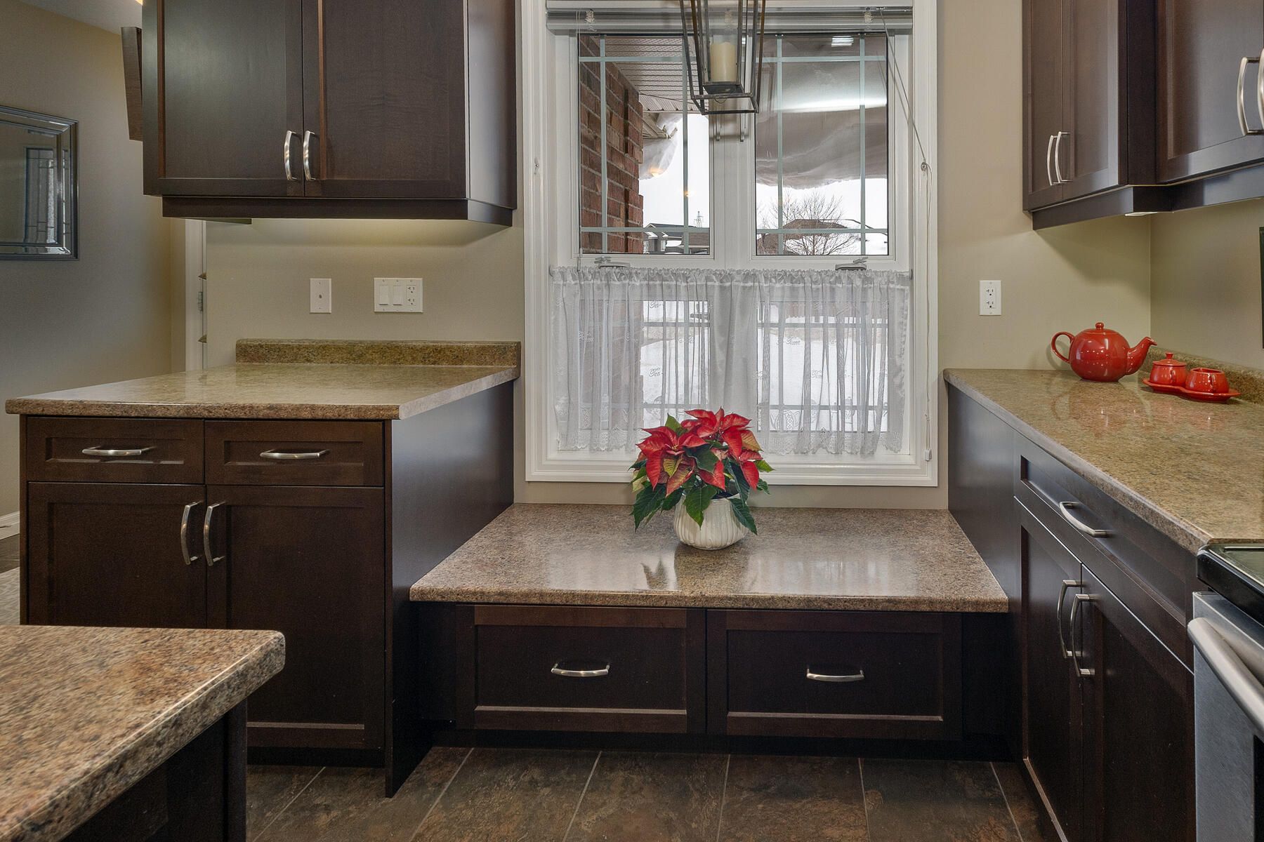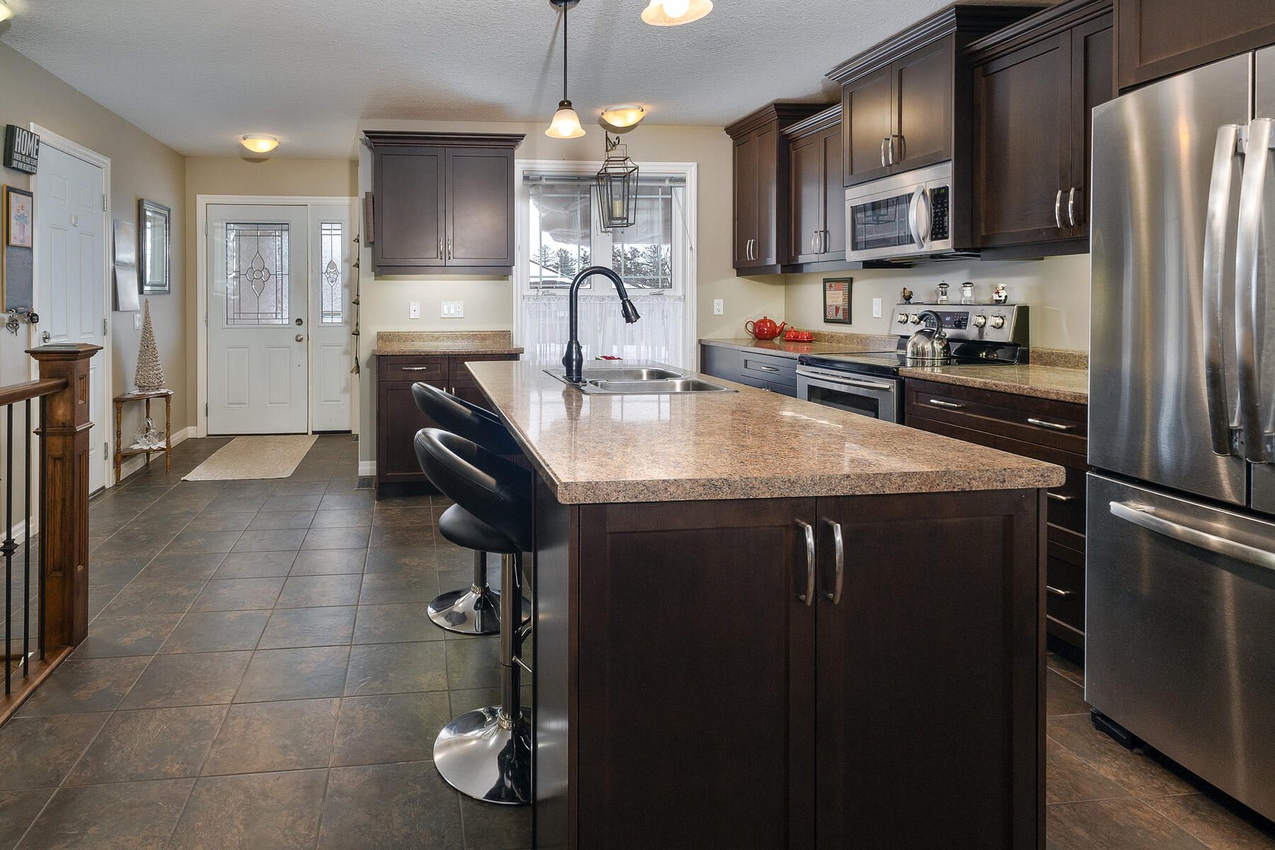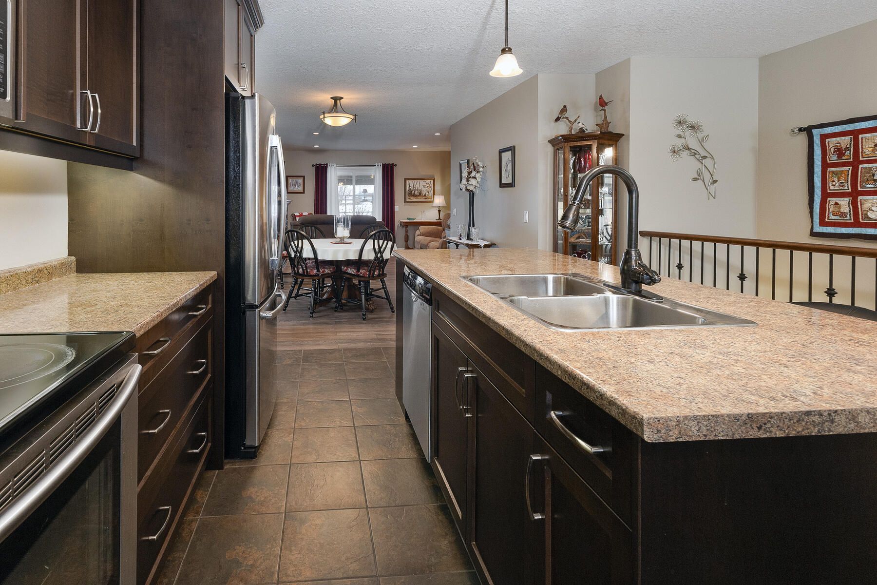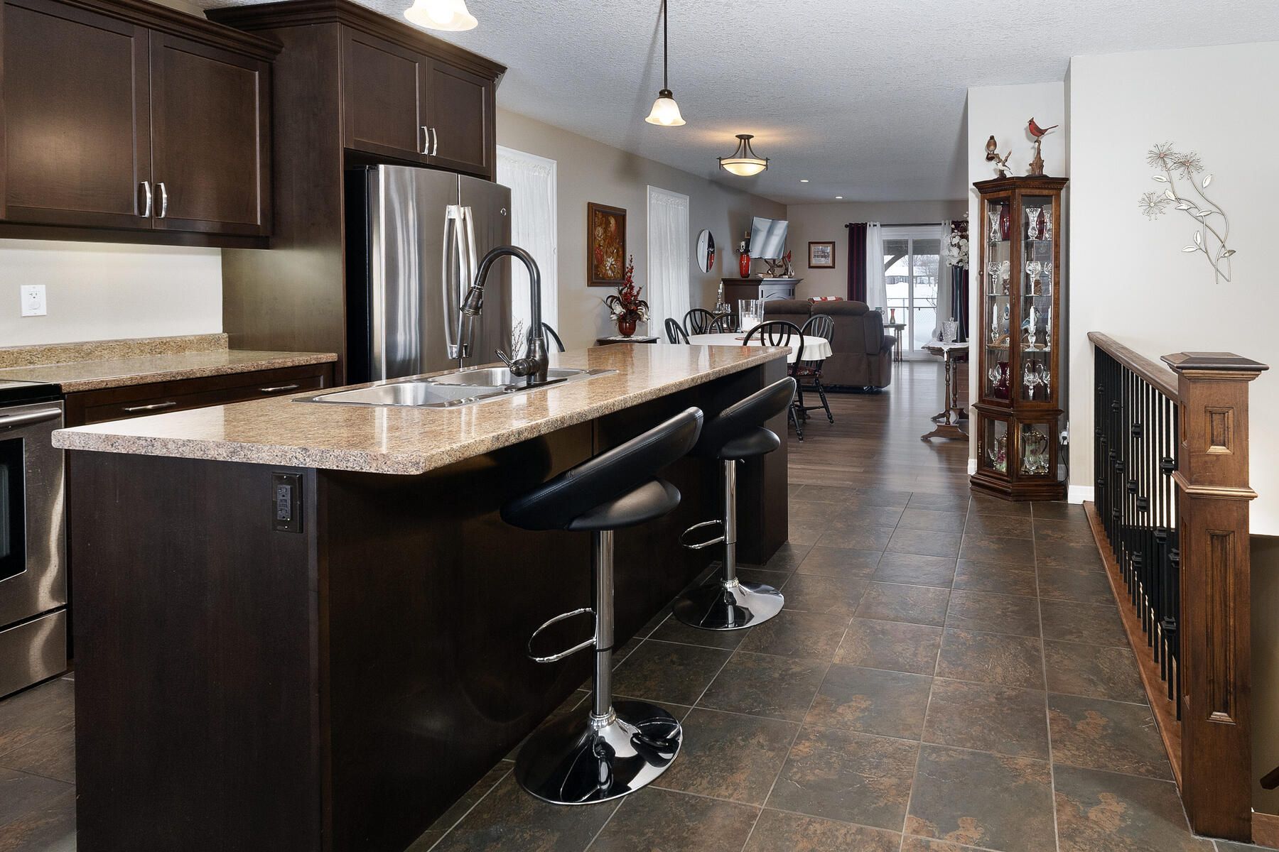 • Open-concept main floor with a bright kitchen and gas fireplace.