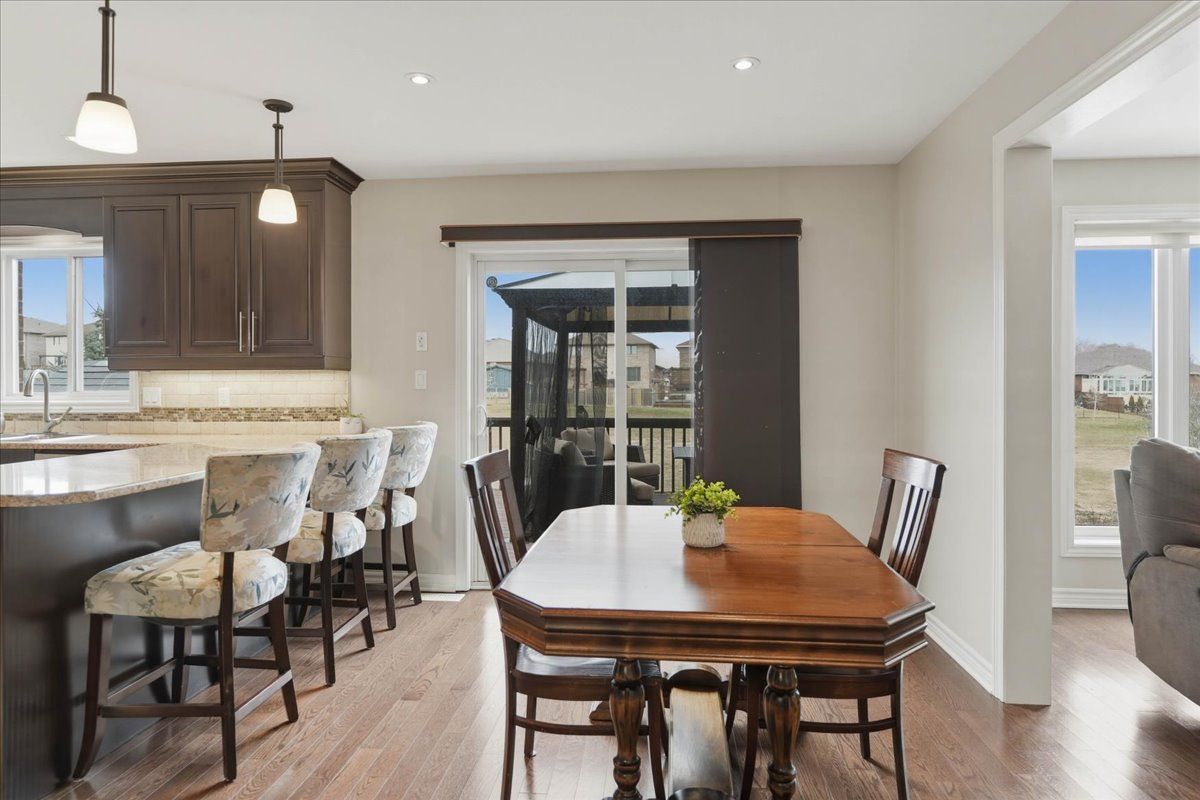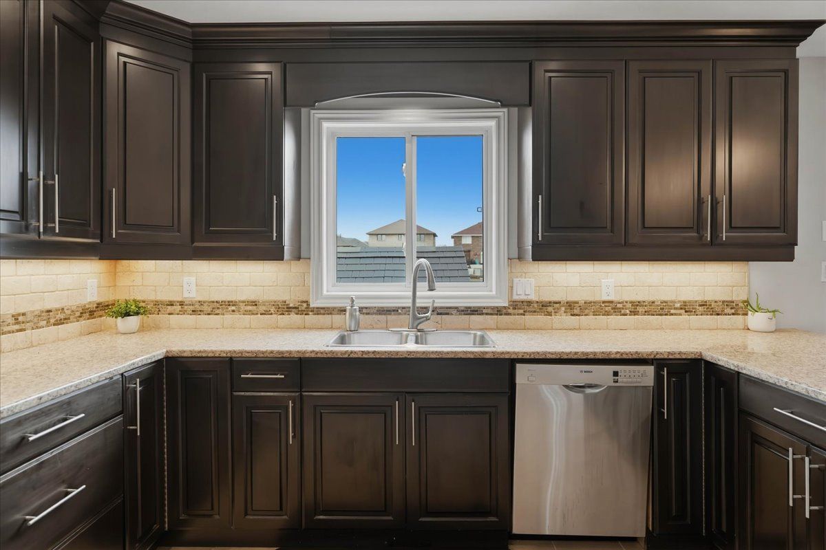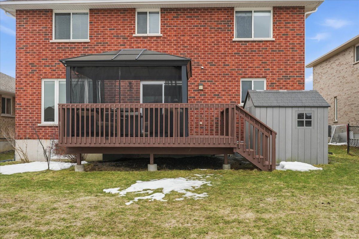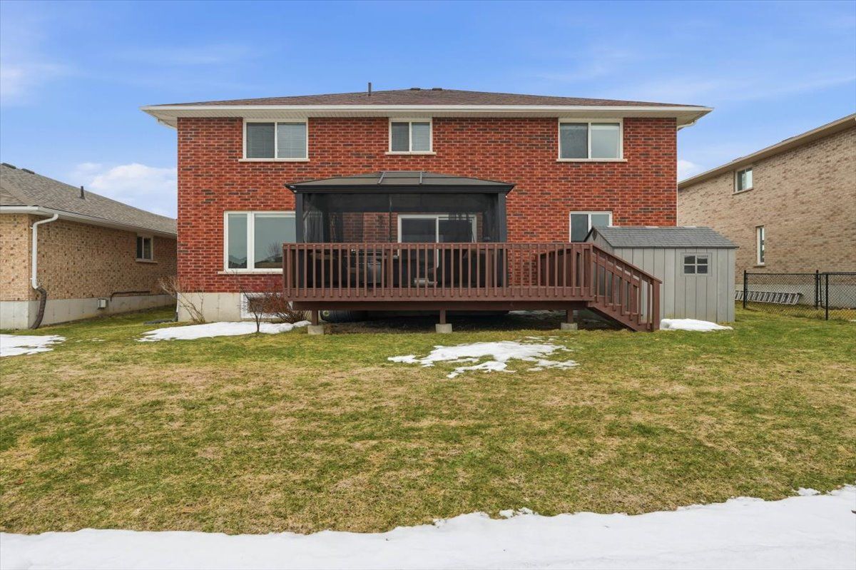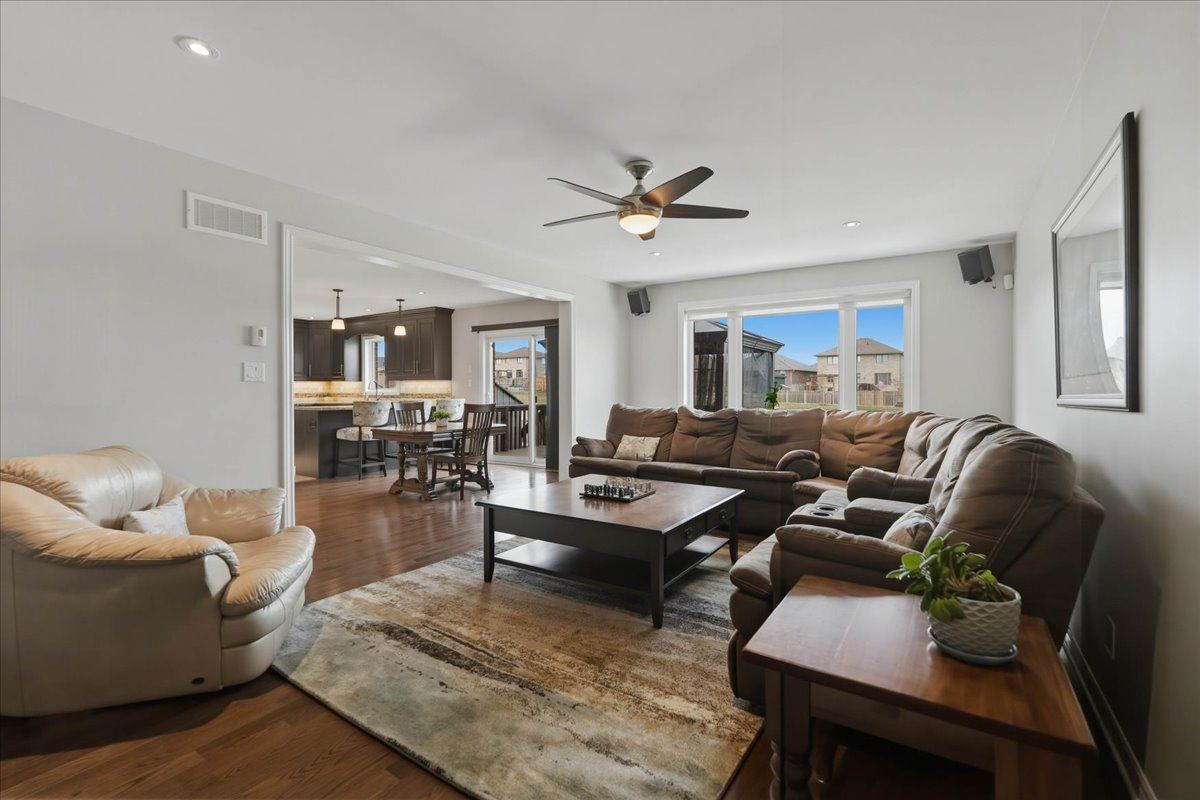 Welcome to this stunning two-storey, all-brick executive home backing onto tranquil green space in a highly sought-after, upscale, family-friendly subdivision. Just minutes from highway 401 and close to a wide range of amenities, this quality-built staikos home offers exceptional curb appeal with its charming covered front porch and beautiful exterior. Step into the spacious foyer, where you are greeted by a warm and inviting layout. The foyer flows seamlessly into the formal living and dining rooms, perfect for hosting gatherings, or leads directly into the well-appointed kitchen,featuring abundant cabinetry, a large peninsula, and a bright eating area. The open-concept family room, adjacent to the kitchen, provides a comfortable and airy space for everyday living. Patio doors from the eating area open onto a generous deck overlooking the private backyard, ideal for outdoor dining or relaxation. Large windows throughout the main level fill the home with natural light, highlighting the hardwood and ceramic flooring. A beautiful stair case leads to the second level, where you'll find the generous primary suite, complete with a walk-in closet and a stunning en-suite showcasing a glass and tile shower. Three additional spacious bedrooms and a well-appointed 4-piece main bathroom provide plenty of room for family or guests. The convenience of second-level laundry completes this floor. The fully finished lower level offers exceptional additional living space, including a large recreation room, two sizeable bedrooms, a full bathroom, and ample storage-ideal for extended family, teens, or guests. Additional features include a two-car garage with inside entry to the mudroom, perfect for busy family life. The subdivision itself offers wonderful lifestyle perks, including a large community park and scenic walking trails for residents to enjoy. This impressive home offers comfort, space, and style in a premier location-everything your family has been looking for!