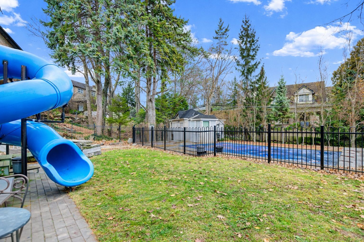 • Private backyard oasis with pool and unique oversized slide for fun.