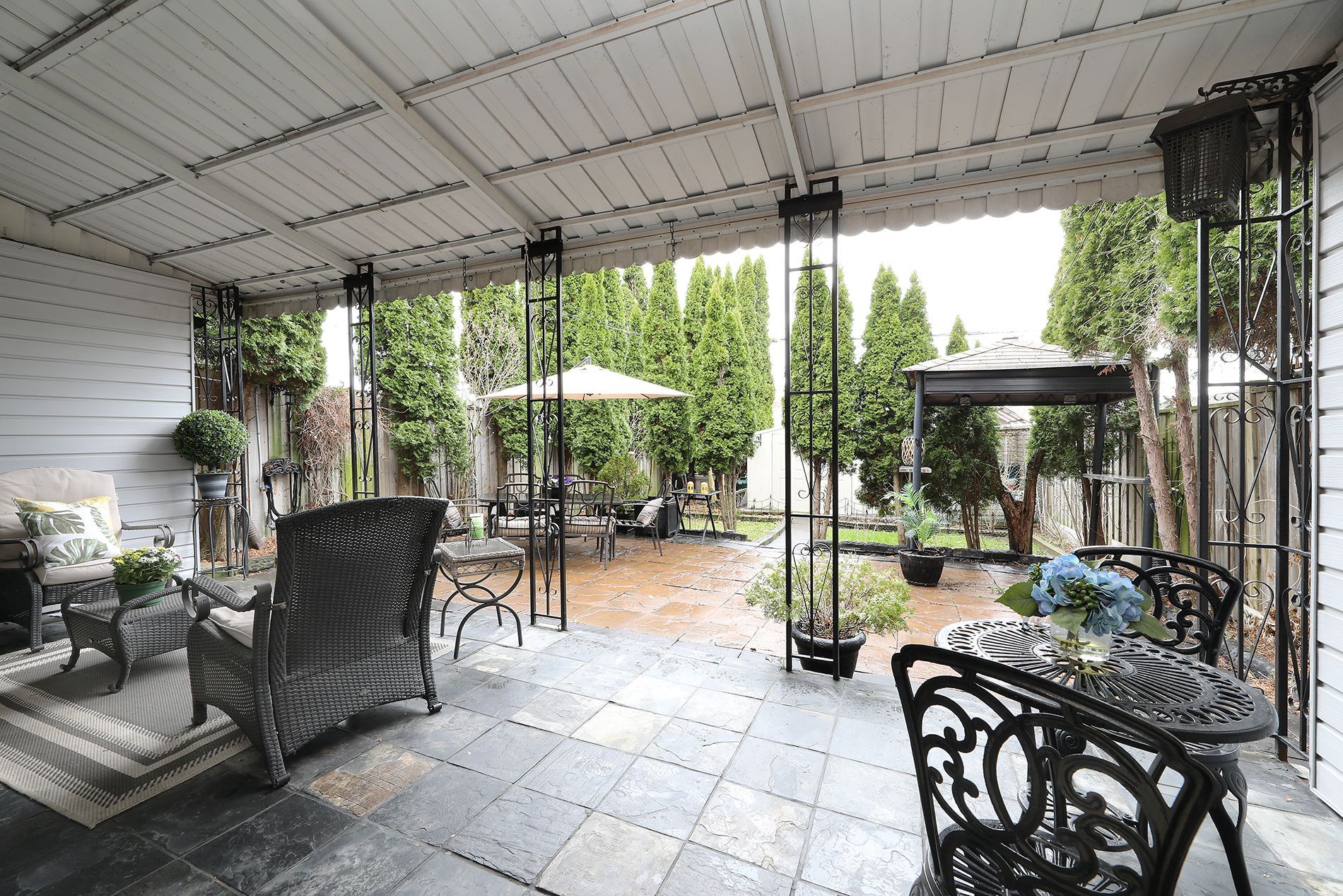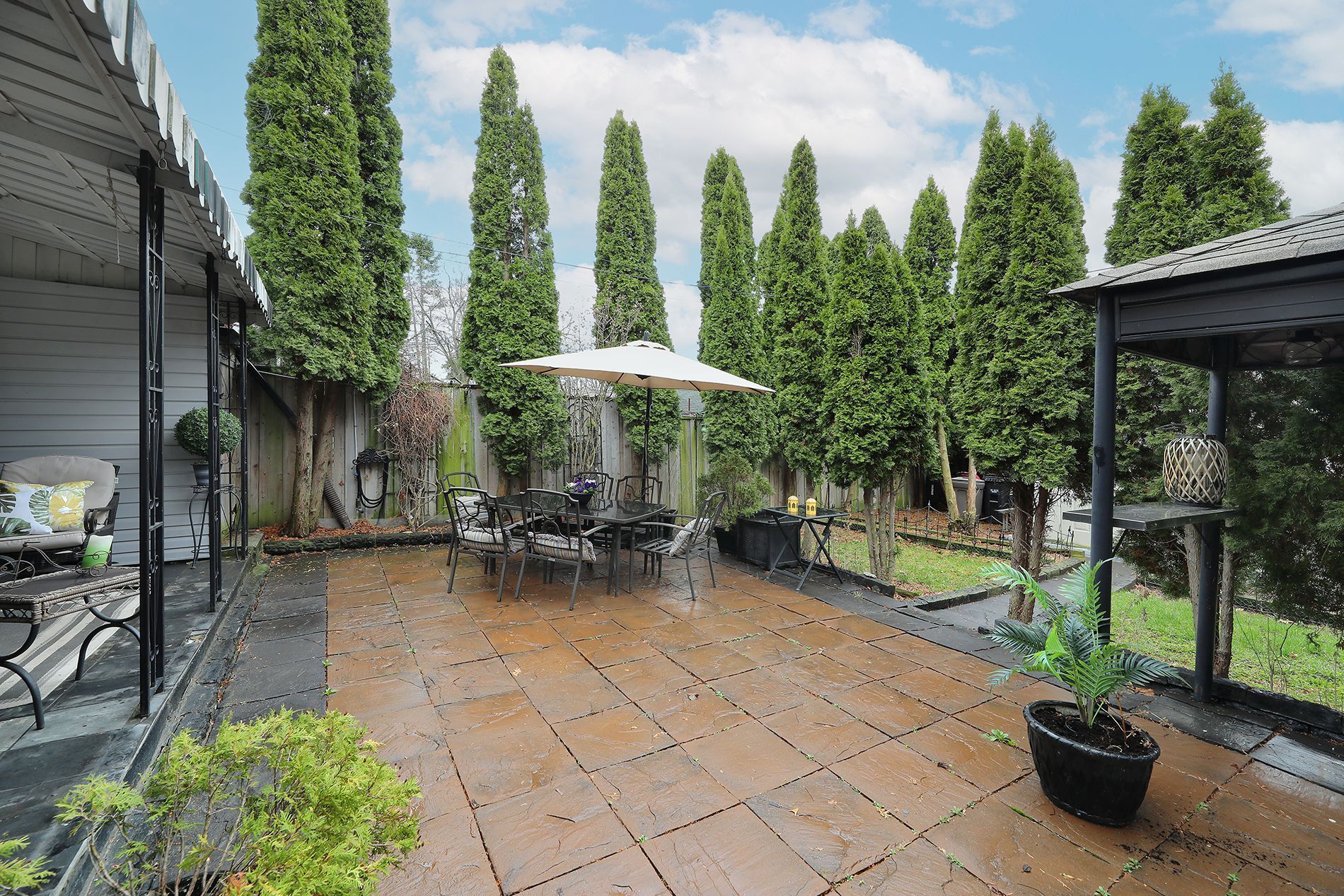 • Landscaped backyard with large patio and mature trees, great for gatherings.