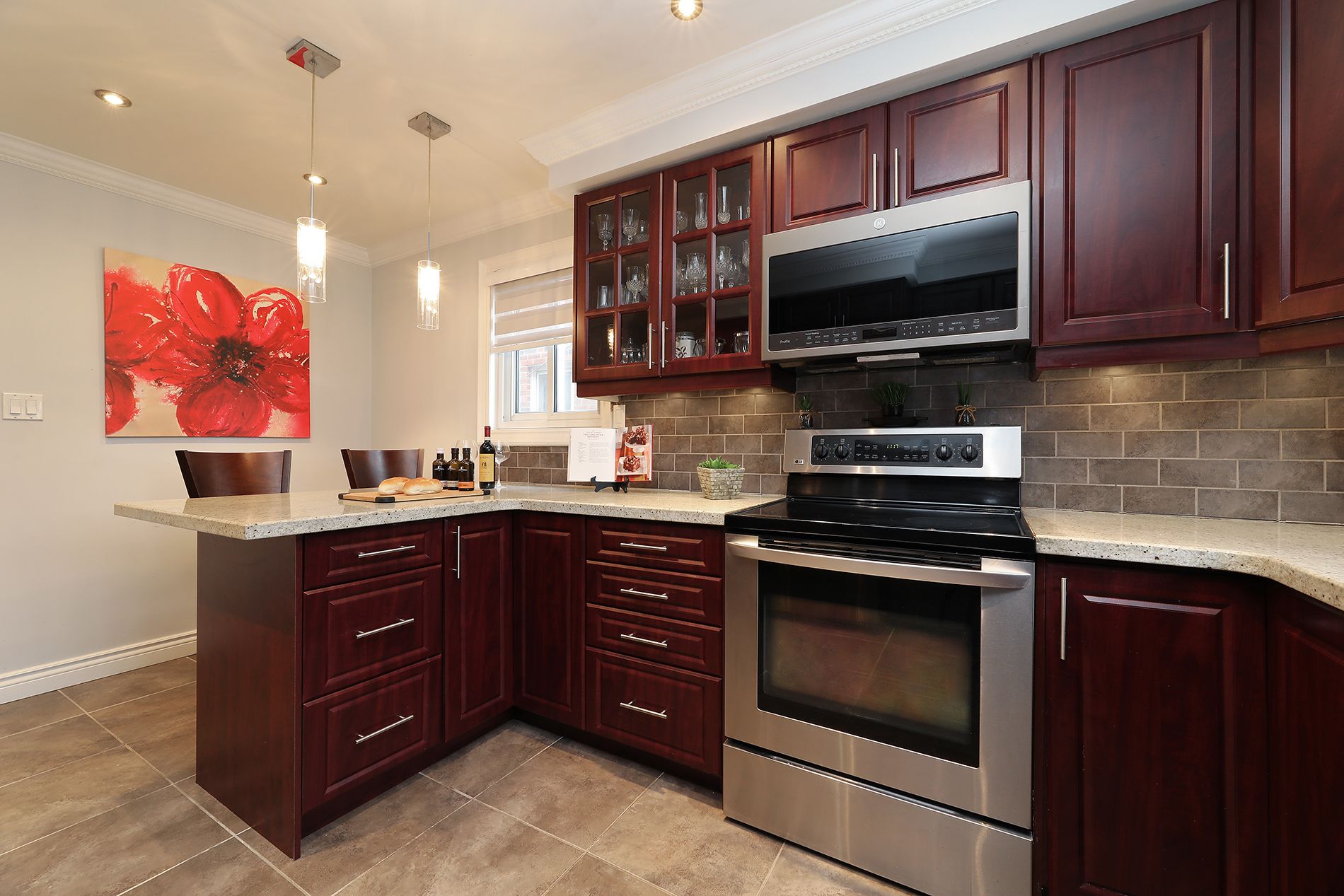 • Stylish kitchen with stainless steel appliances and quartz countertops.