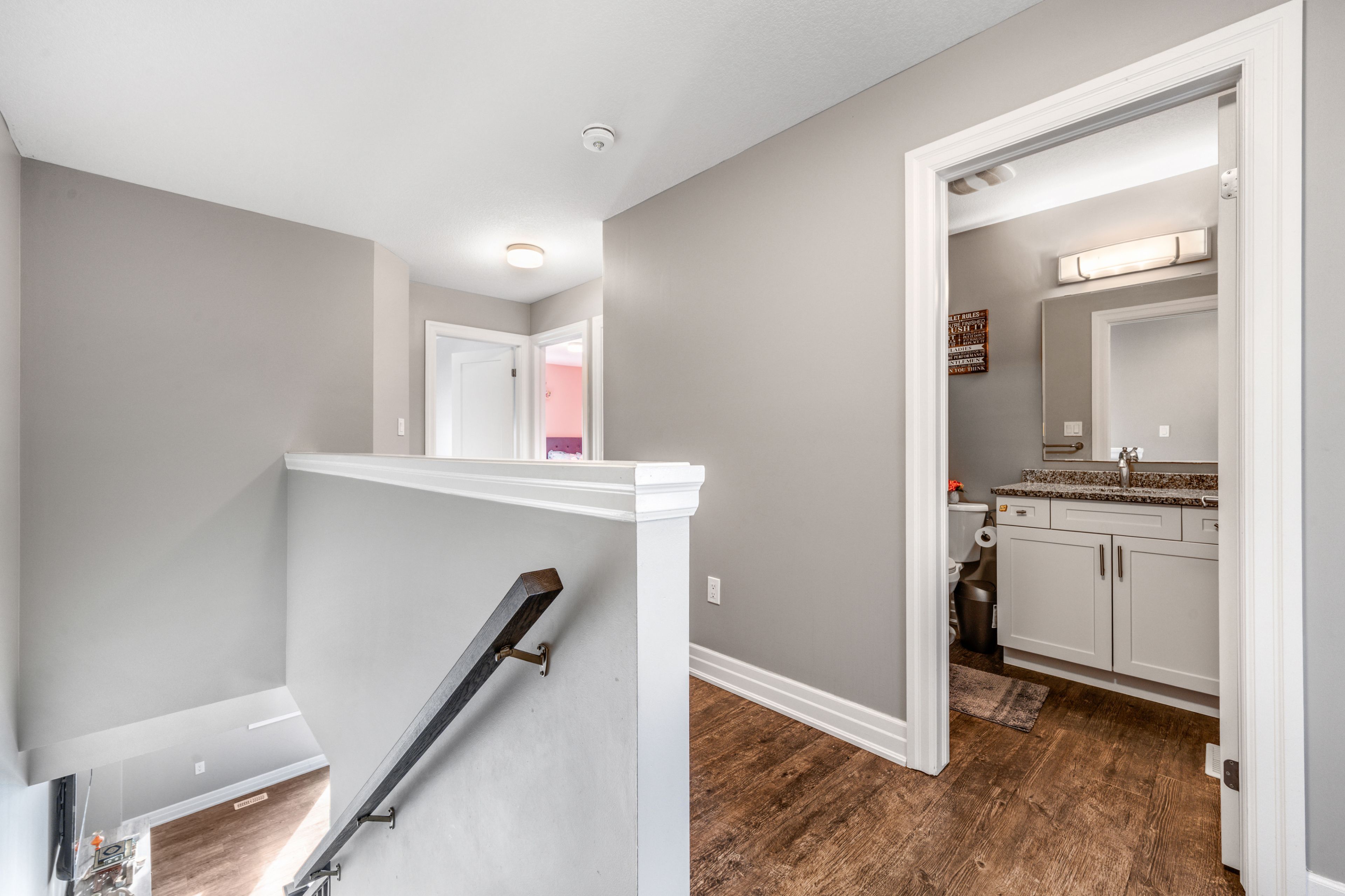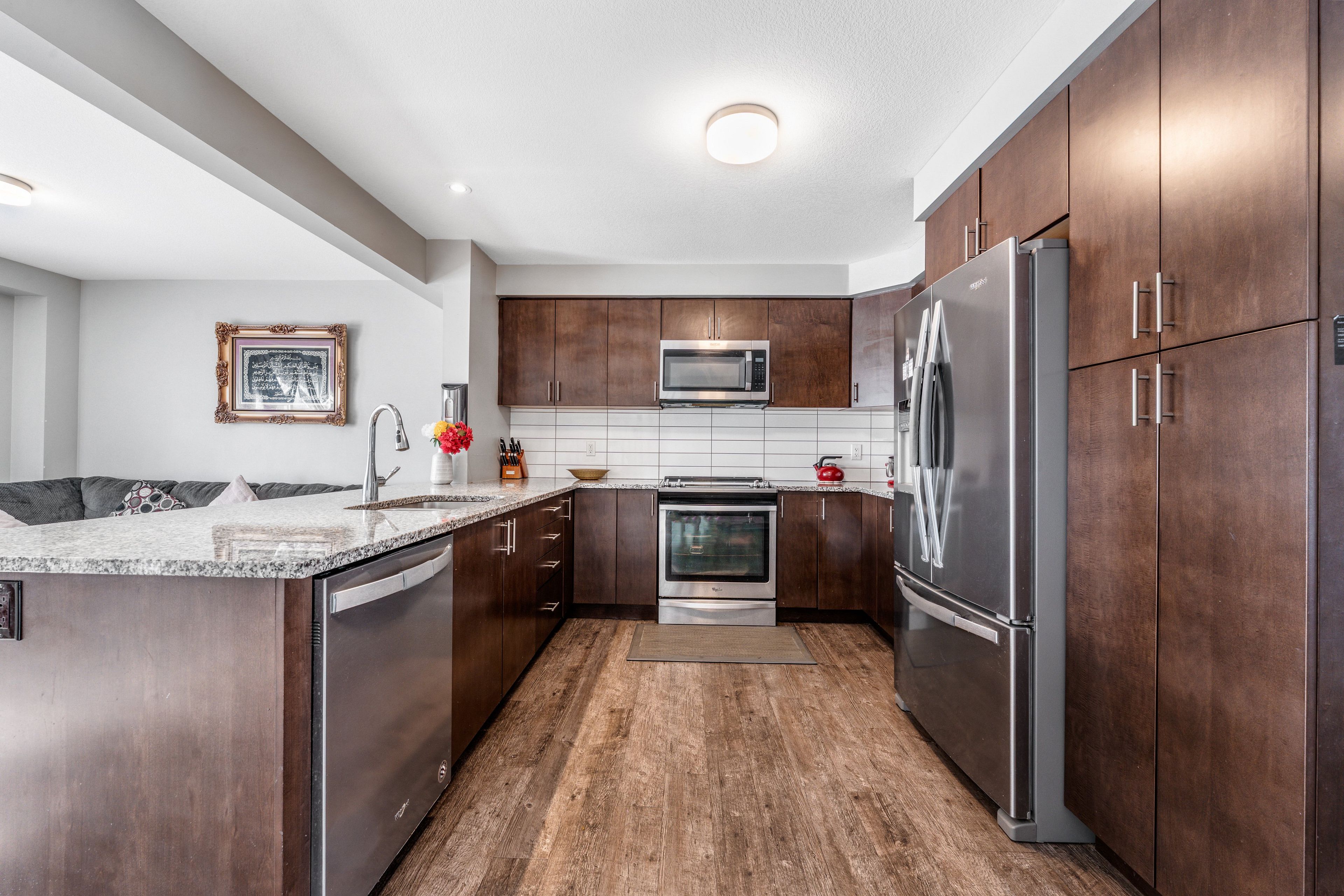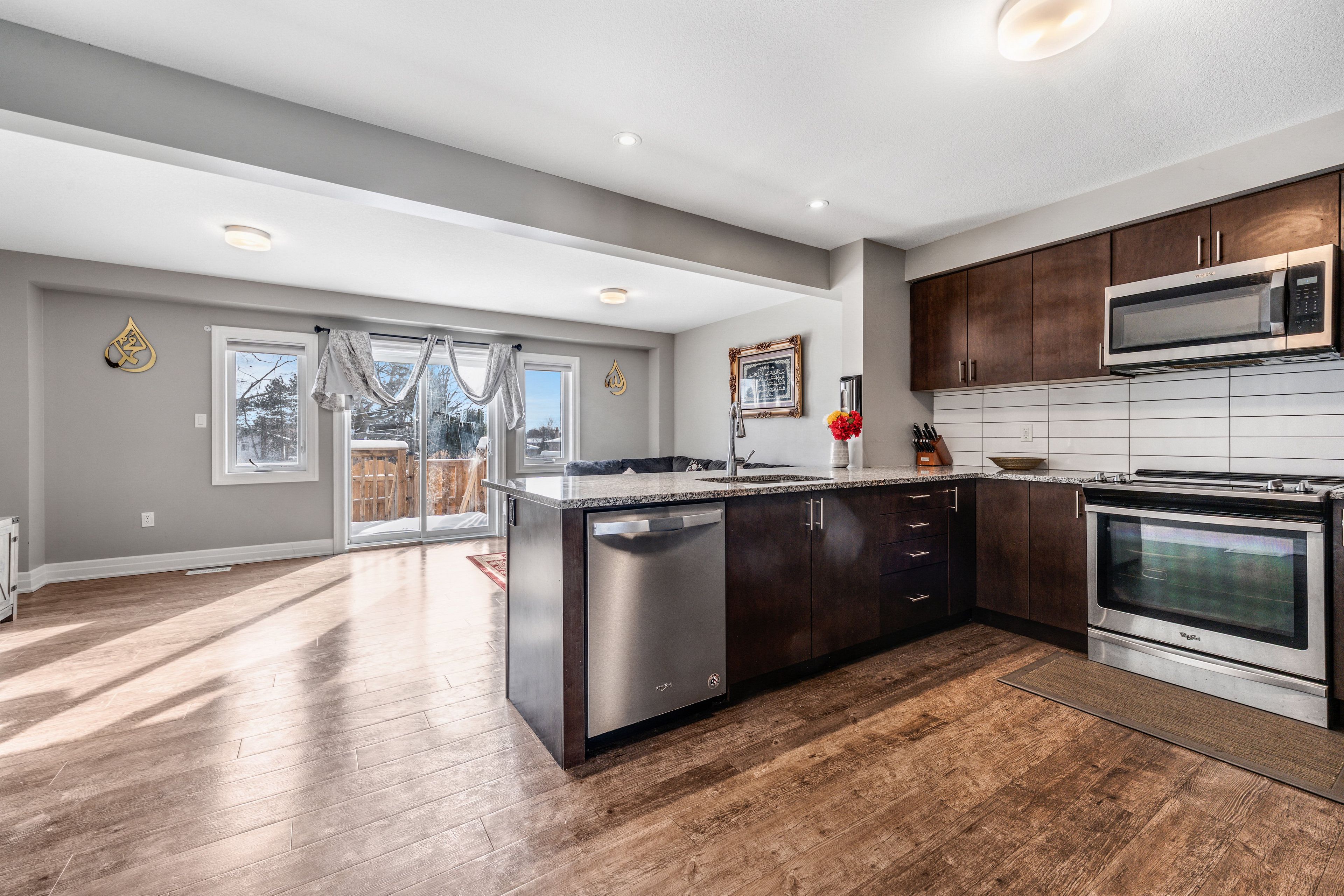 Stylishly upgraded townhome. 34 nieson street, cambridge an elegantly upgraded freehold townhome set within a coveted, family-friendly neighbourhood. Backing onto green space and thoughtfully upgraded throughout, this move-in-ready home offers both refined style and practical living in a location that truly delivers. Step inside to a bright, open-concept main floor where natural light pours through large windows and laminate flooring creates a warm, welcoming atmosphere. The layout flows effortlessly with the gourmet kitchen, showcasing granite countertops, stainless steel appliances, sleek modern cabinetry, and a breakfast bar that invites casual meals, morning coffee, and effortless hosting. Overlooking the living and dining area, this space is designed to keep everyone connected. Upstairs, the primary suite is a serene retreat, complete with a spacious walk-in closet and a beautifully appointed 3pc ensuite featuring a glass walk-in shower. 2 additional sun-filled bedrooms, a stylish 4pc main bathroom, and the convenience of second-floor laundry complete this level. The fully finished basement adds incredible versatility, offering a generous recreation room, a newly completed modern 3pc bathroom, and ample storage - perfect for a home office, guest suite, gym, or additional living space. With thoughtful upgrades throughout, this home has been meticulously cared for. Ideally located close to schools, parks, shopping, and with quick access to highway 401.