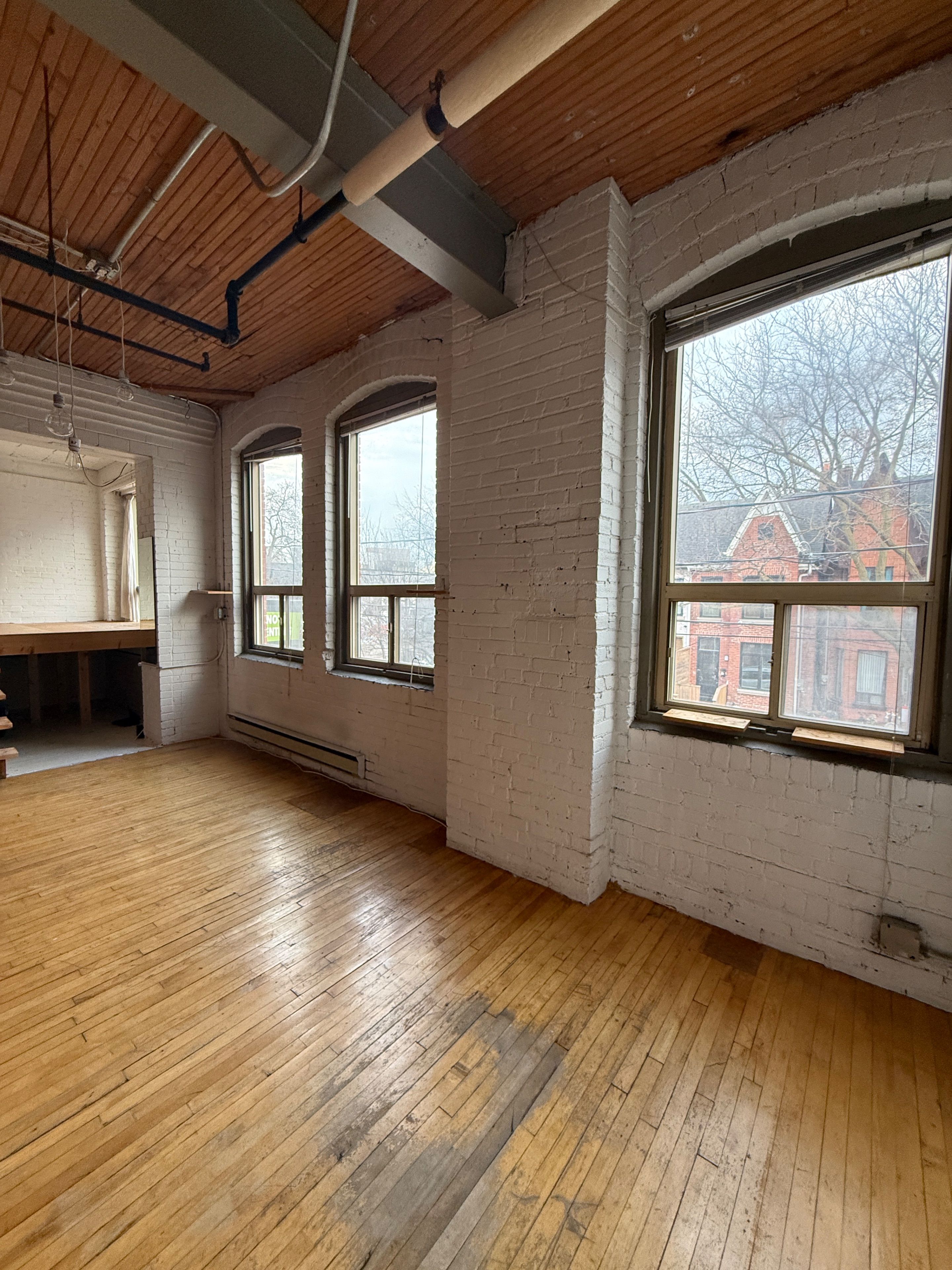 • Large over 780 square feet with high wooden ceilings and exposed brick.