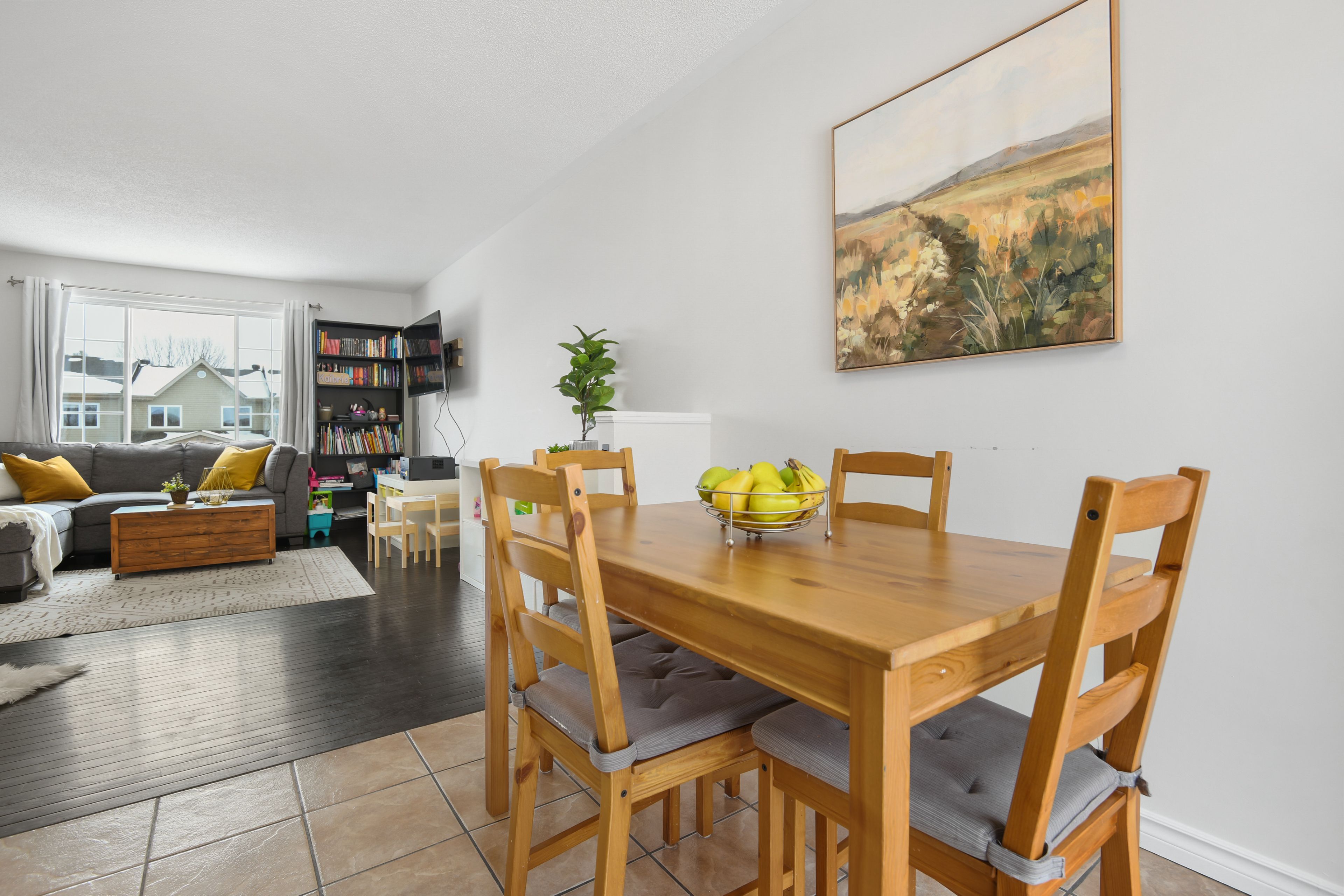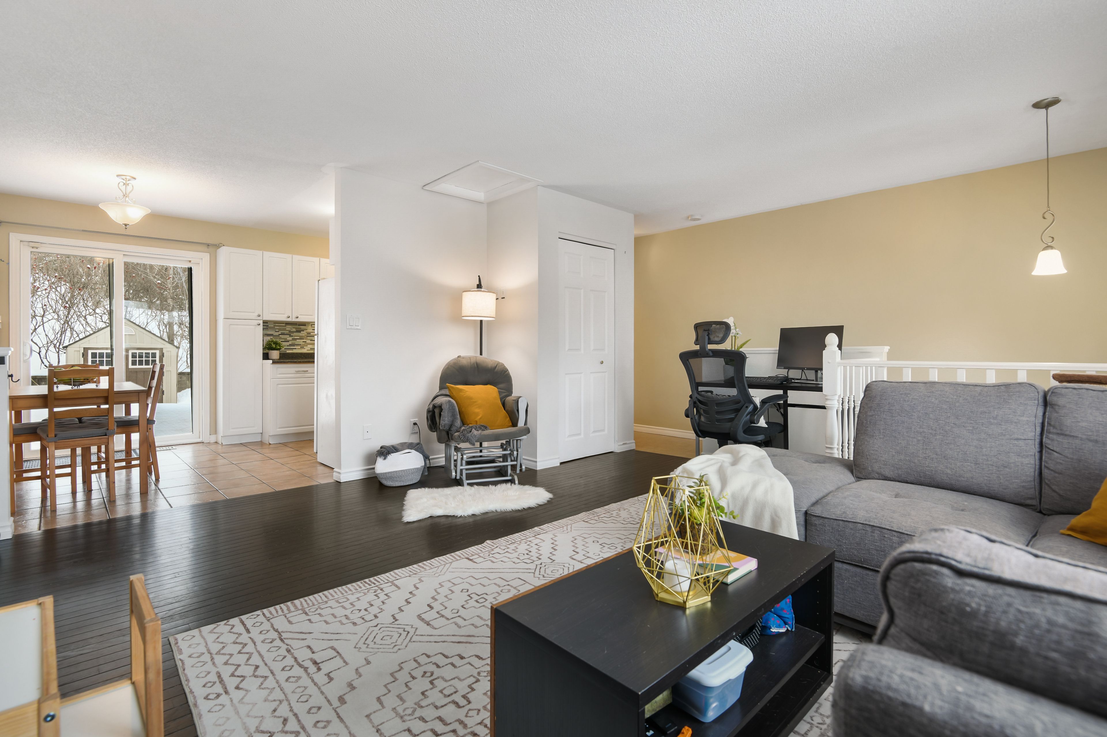 • Functional main level with living space, dining area, and kitchen.