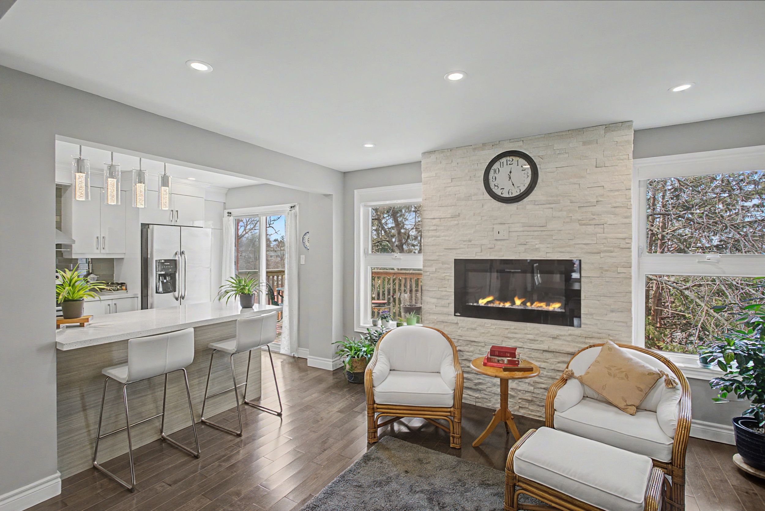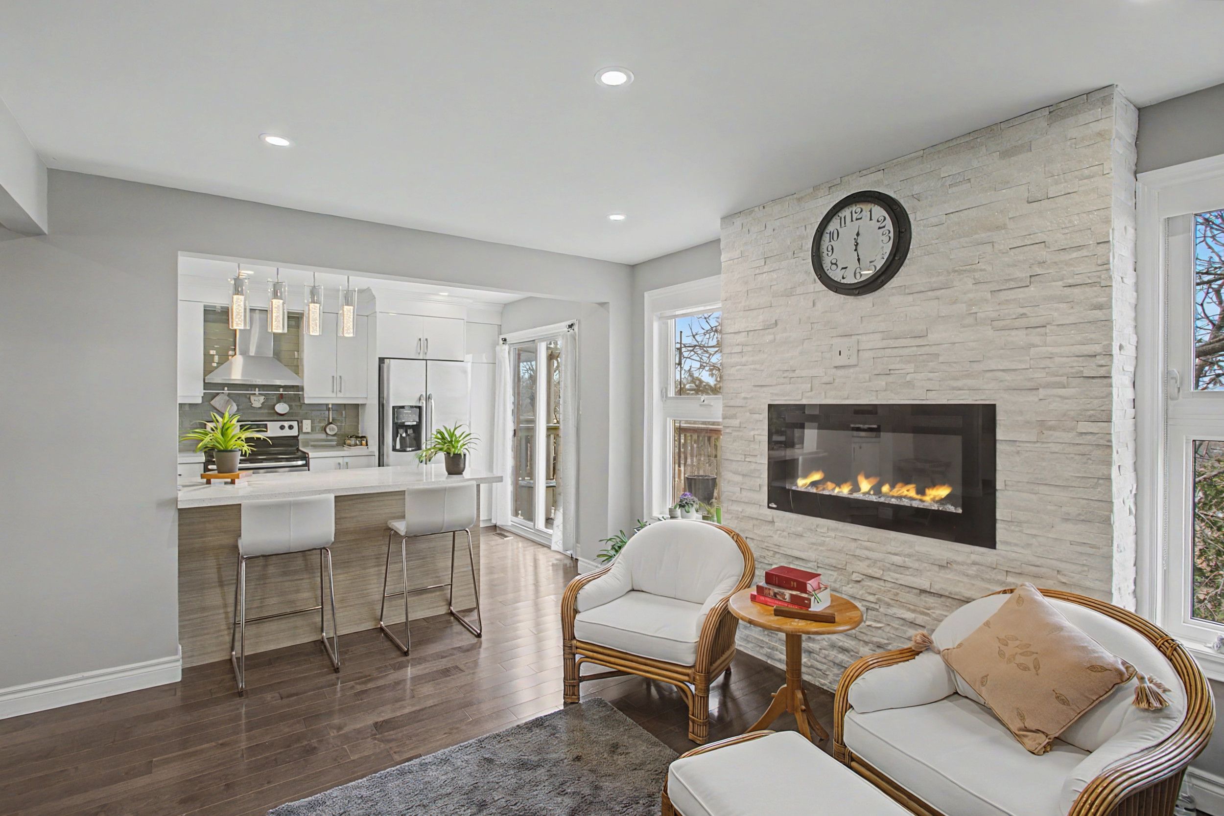 Open-concept home offers 1,750 sq ft living space, featuring living room, dining room, and laundry on the main floor, four bedrooms upstairs of which the primary bedroom includes ensuite and walk-in-closet. The fully finished walkout basement with separate entrance provides for another bedroom, an office, and 3 pcs bathroom. Main floor modern kitchen with a large island, stone counters and ample cabinets for storage. Perfect layout with laminate floors throughout all levels. Unobstructed view at the back. Convenient access to hwy 401, 407 and go transit and minutes to schools, shopping and amenities. New furnace (2025), new roof (2025), new air cond (2022).