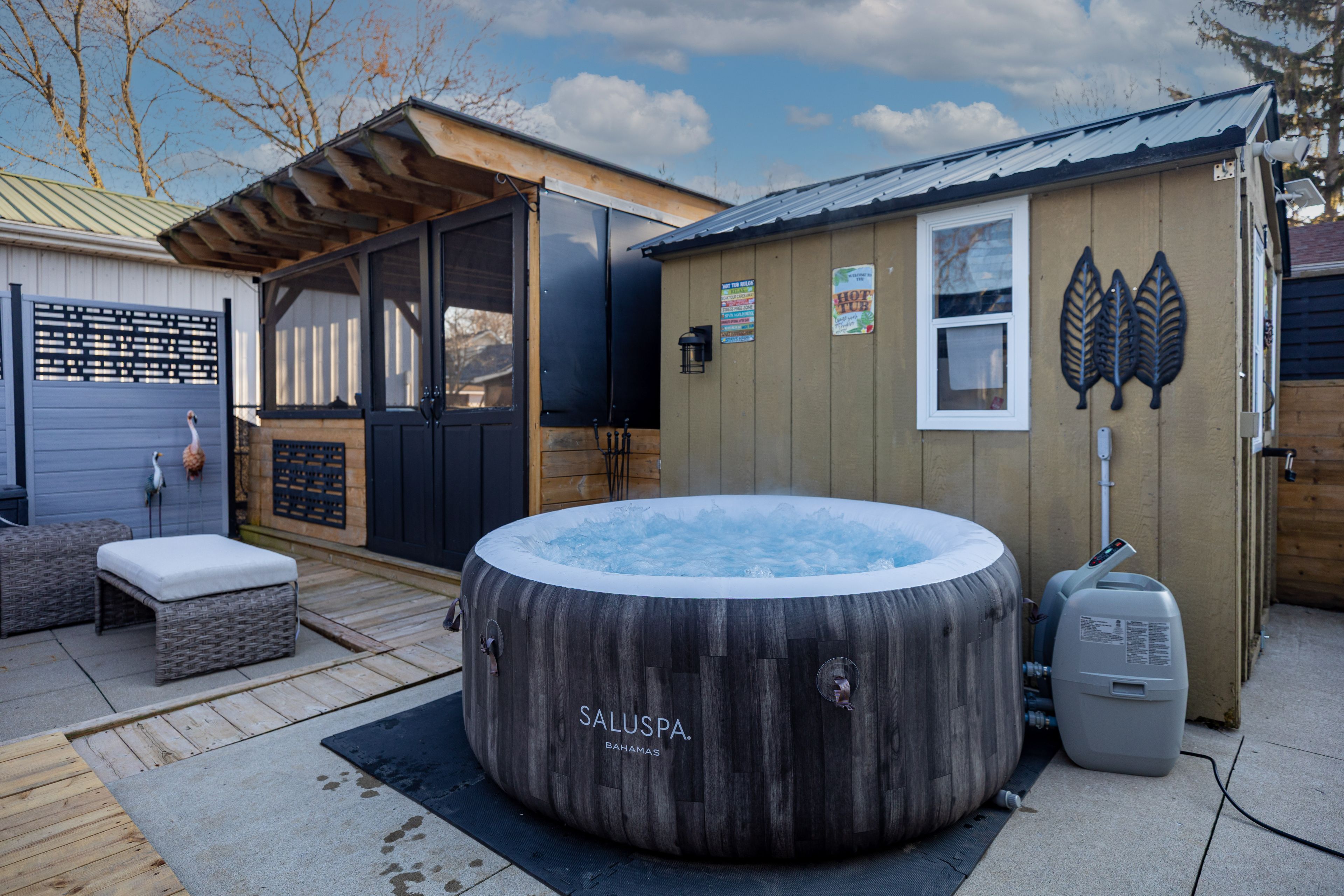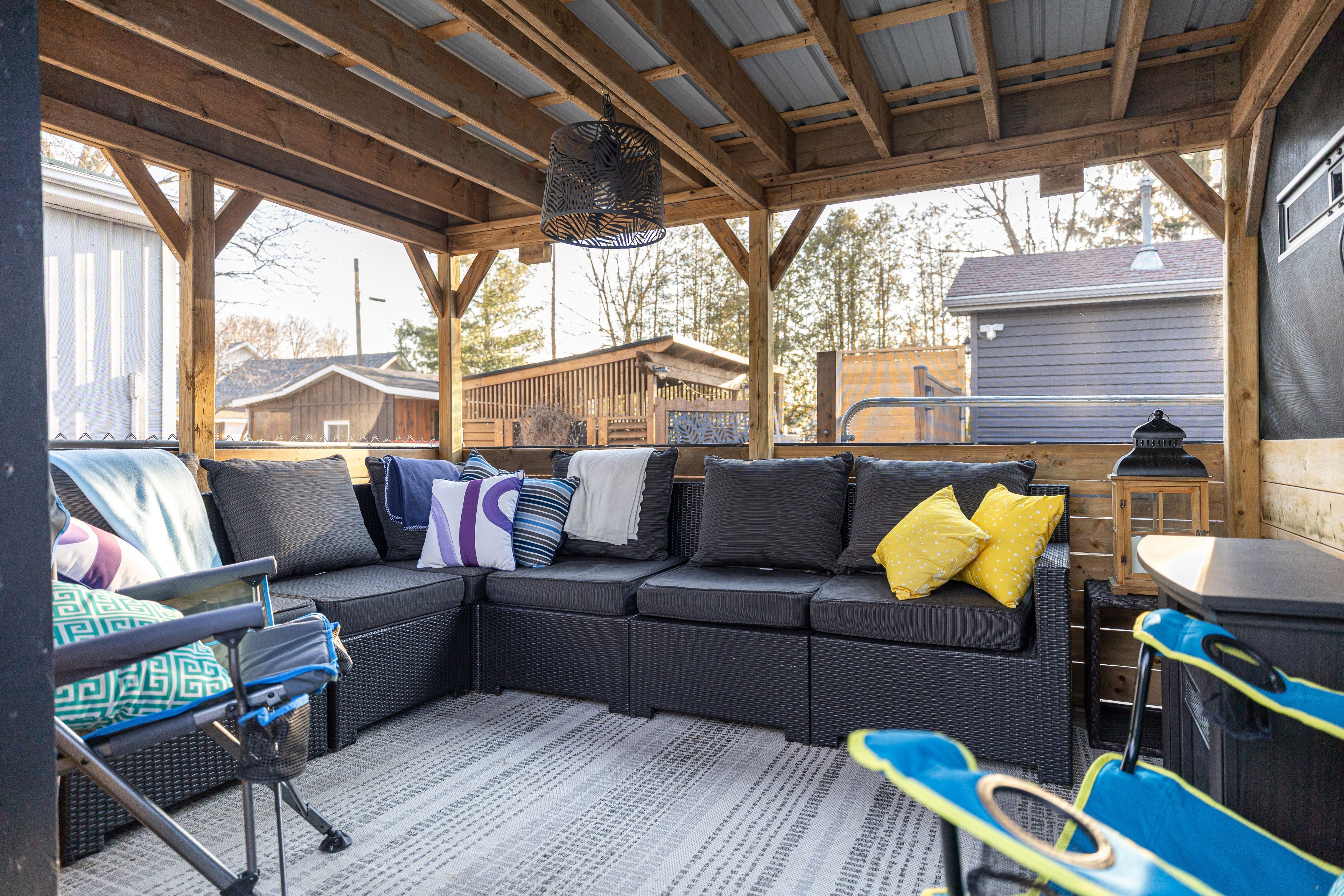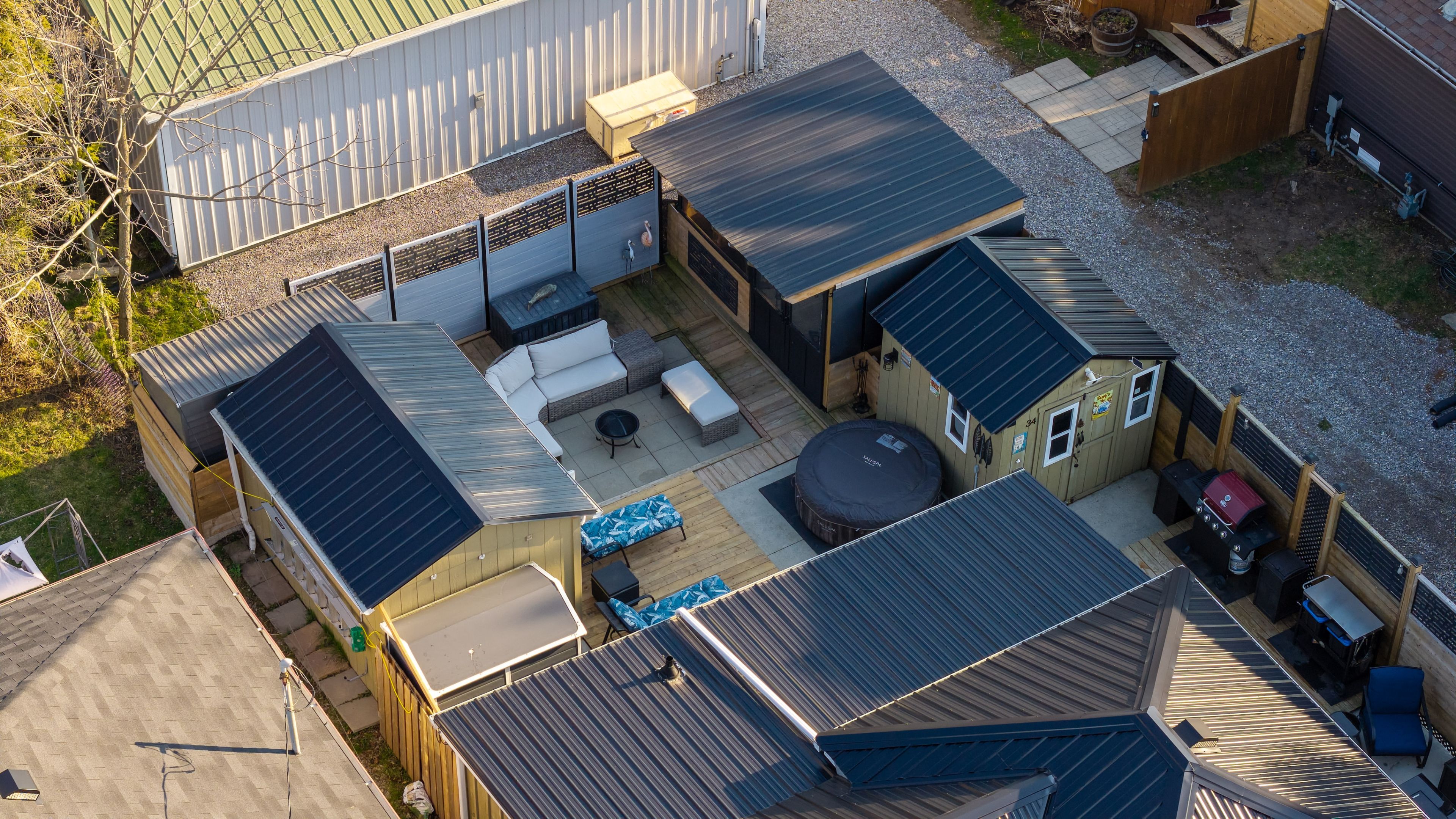 • Outdoor space includes multiple seating areas and a screened gazebo.