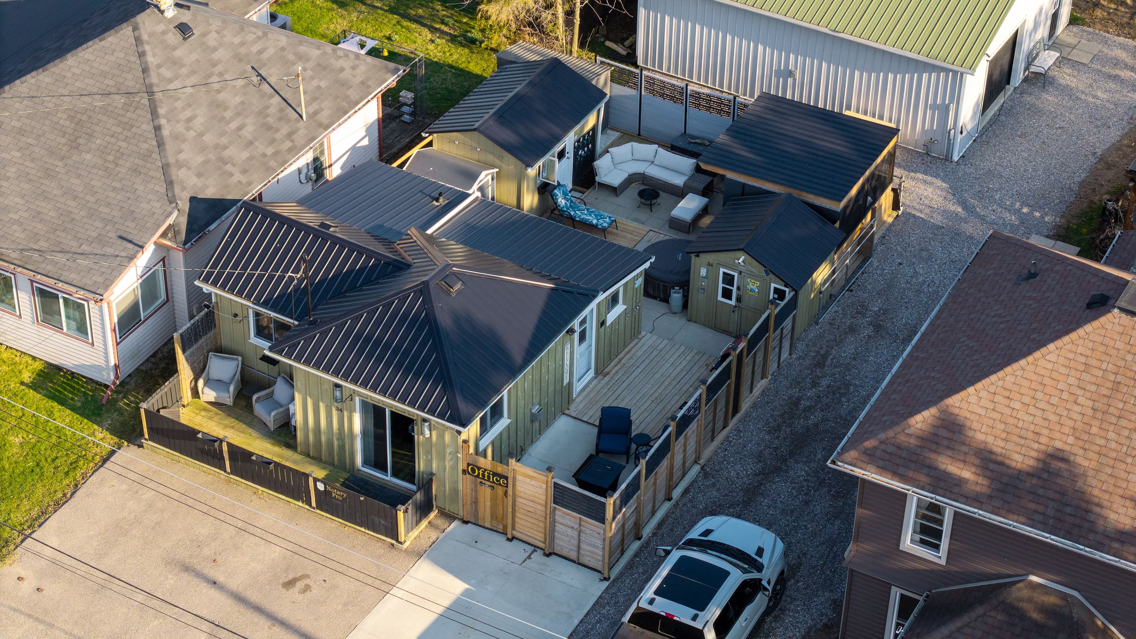 Welcome to 34 pansy avenue, a charming bungalow nestled in the heart of port dover-perfectly suited for first-time buyers, down sizers, or those seeking a relaxing weekend retreat. Set in a quiet, established neighbourhood, this property offers a unique blend of comfort, privacy, and lifestyle appeal just minutes from the beach and local shops. The outdoor space is designed for both relaxation and entertaining, featuring multiple seating areas including a front deck, private patios, and a screened-in gazebo. A detached studio-style shed and separate bunkie provide added flexibility, perfect for guest accommodations, a home office, or potential short-term rental opportunities. Inside, the home offers an efficient open-concept layout with a bright living area flowing seamlessly into the kitchen. Natural light and easy access to outdoor spaces enhance the overall feel of the home. The interior is completed by one bedroom and a well-appointed 3-piece bathroom, making for simple, low-maintenance living. Recent updates contribute to both comfort and peace of mind, including a new heat pump (2024), updated windows, brand new doors, improved plumbing, and additional exterior power options for future enhancements. With private parking that can fit 4 cars, municipal services, updated features throughout and a desirable location close to parks, trails, and lake erie, this property presents an excellent opportunity for personal use or investment in one of port dover's most sought-after communities.