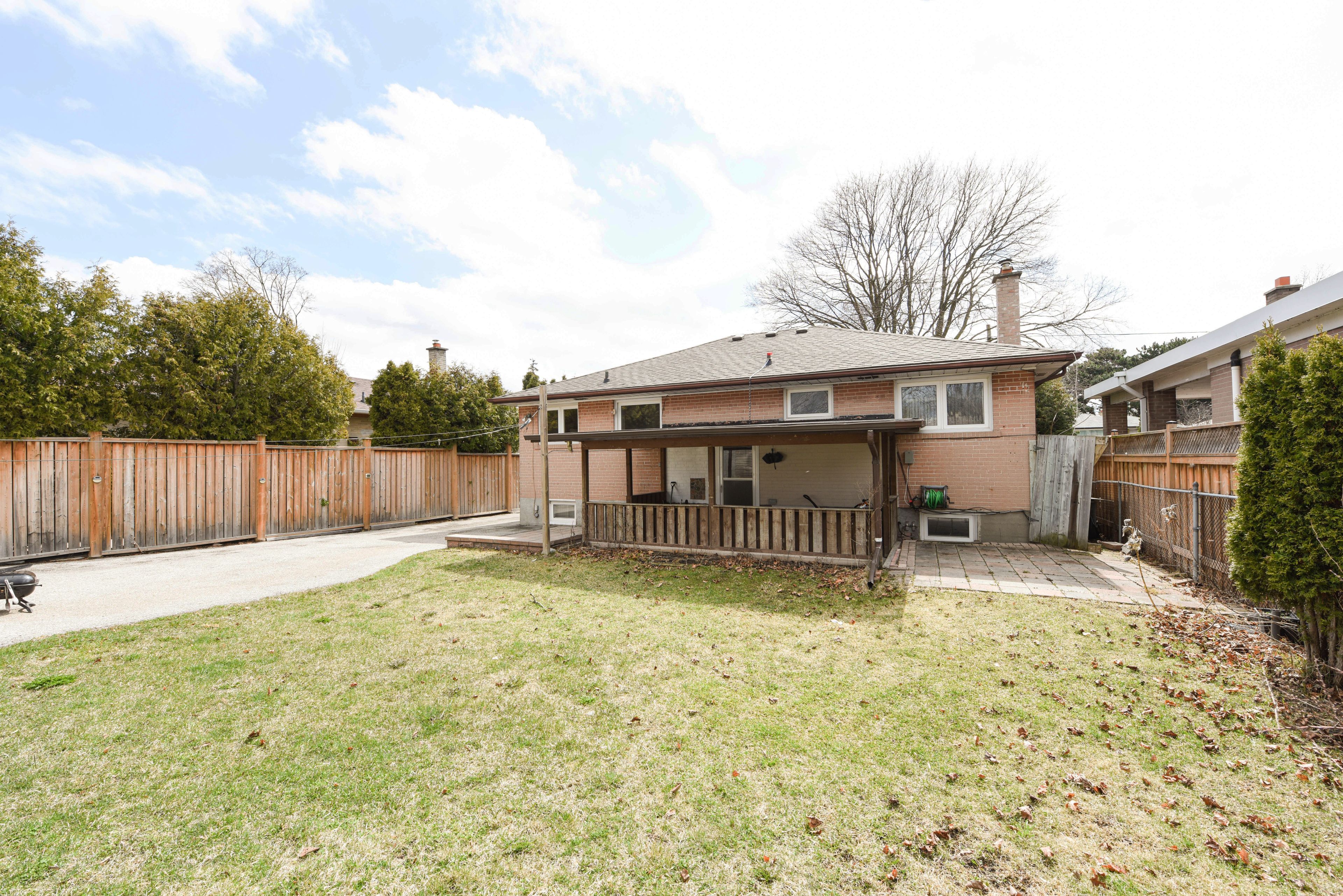 • Spacious backyard with covered veranda and green space views.