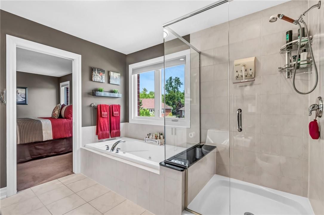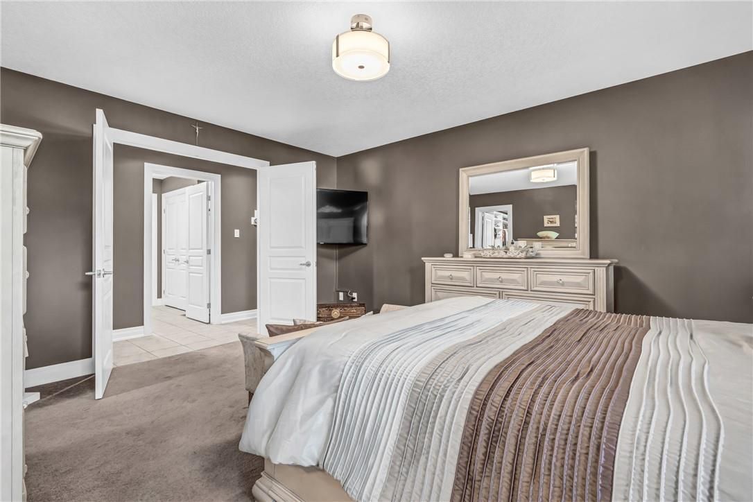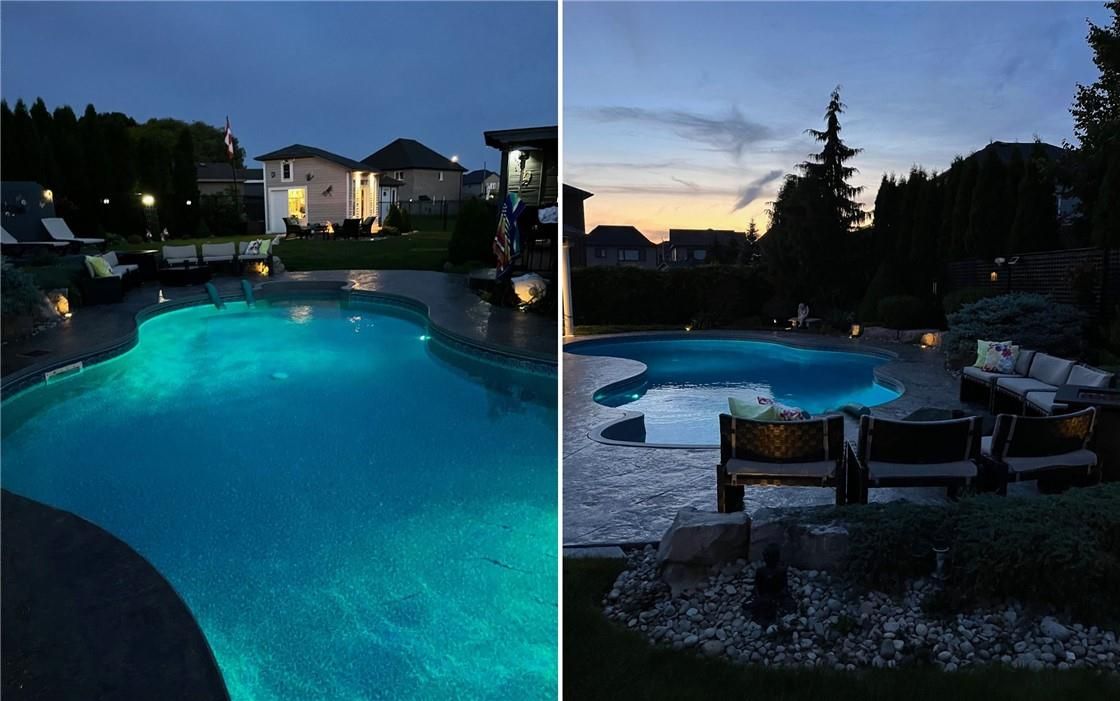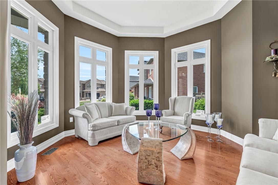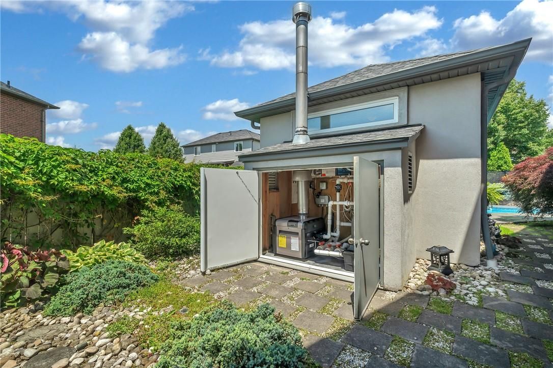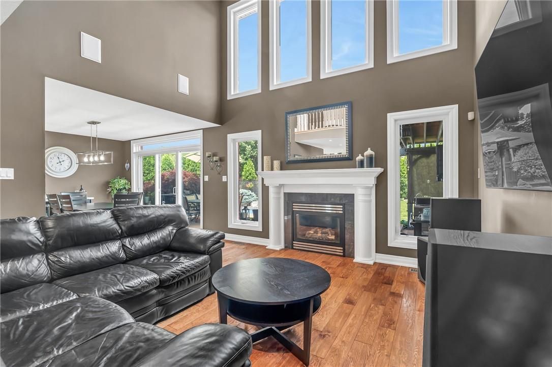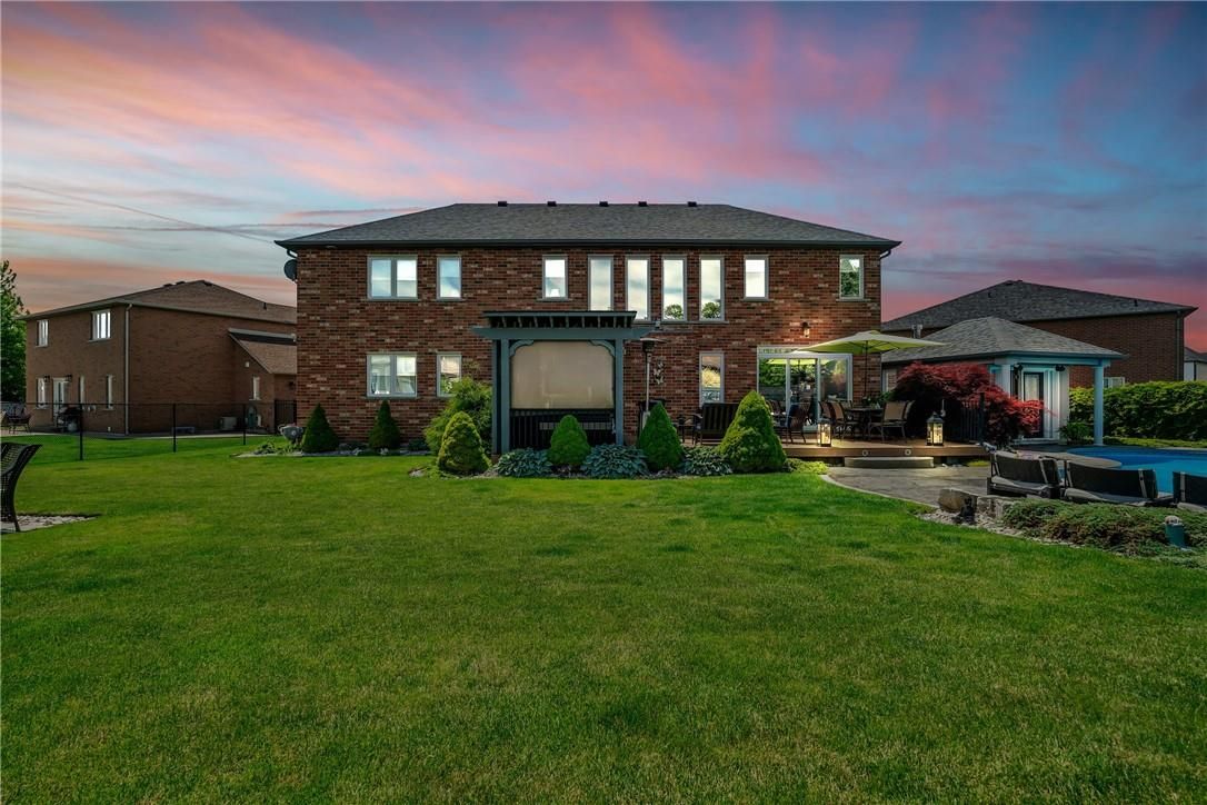 Custom-built home with over 5000 sqft of finished living space, meticulously maintained by original owners. It offers 2 primary bedrooms, as well as a full in law suite, ideal for a multi generational family. Situated on an oversized pie shaped lot, 10 min to upper james shopping. This stunning property boasts a wide stamped concrete drive w/ parking for 4 vehicles + oversized double car garage, 11 ft in height, w/ 9 foot high garage doors, perfect to accommodate a car lift. Main floor features a dream kitchen with custom cabinetry, quartz countertops, extra large sink & eating area with oversized patio door leading to the backyard oasis. Main floor primary bed w/ walk in closet & 6pc ensuite. Bright & spacious 2 storey family rm w/ natural gas fireplace, separate living & dining room, bed/office, 2 pc bath & main floor laundry off of the garage. The upper level offers a family room, 3 bedrooms, including 2 that offer ensuites & walk in closets. Fully finished basement has a full kitchen with dining area, rec room, bed w/ ensuite privilege to 3pc bath, office, workshop, 2nd laundry rm, + hot tub & hobby room. Gorgeous backyard featuring inground saltwater pool with new heater, stamped concrete surround, trex decking on patio & in the covered outdoor kitchen area, outdoor speakers & oversized custom shed. 4 season sunroom is the perfect place to relax. Recent updates include pool heater 2025, roof shingles 2020, shed & sun rm shingles 2022, furnace & a/c 2023. This home must be seen! Luxury certified.