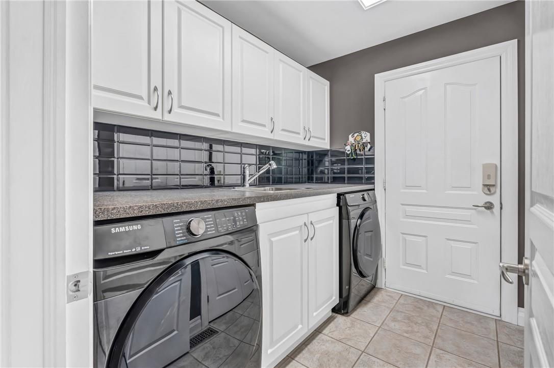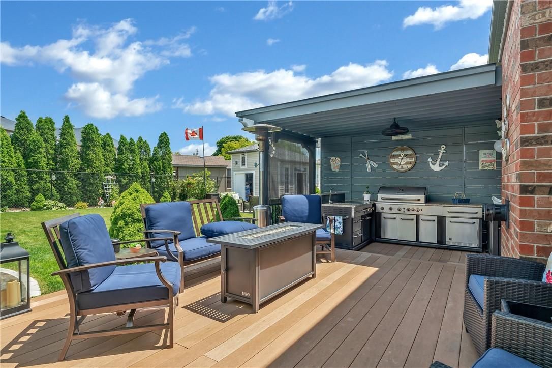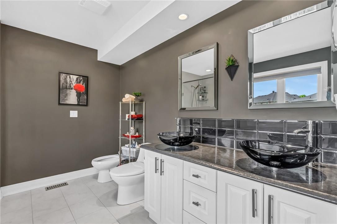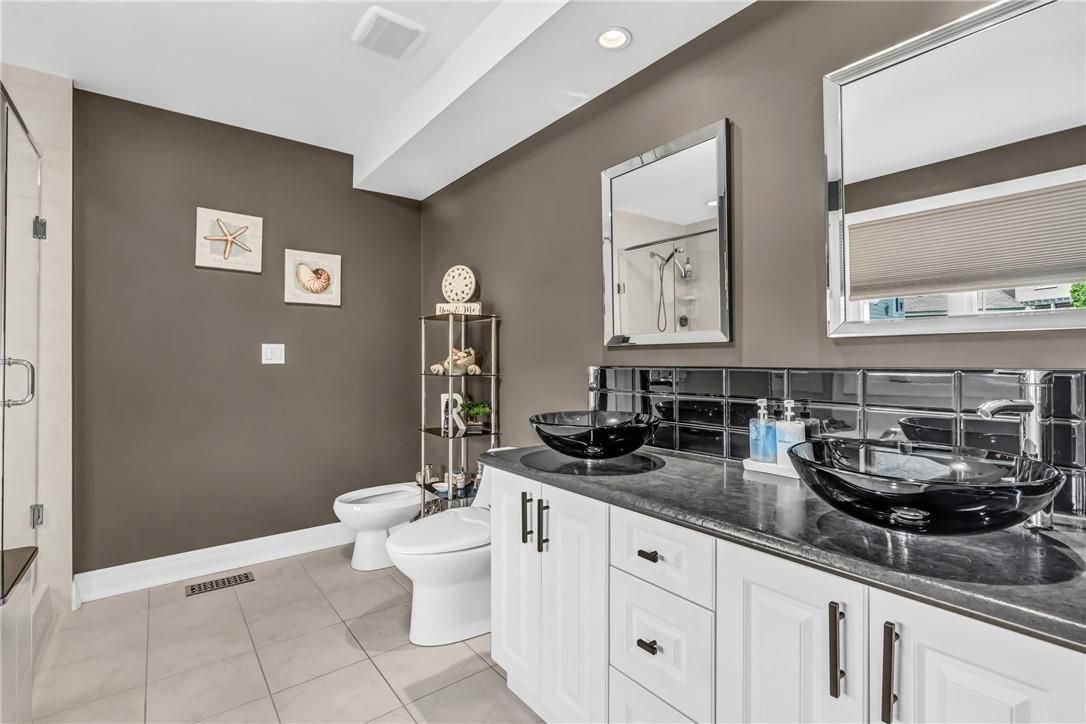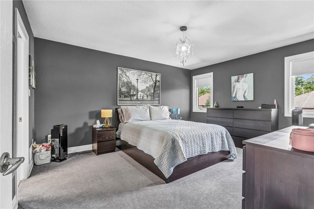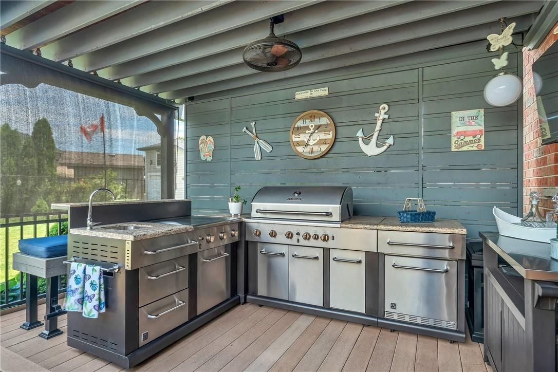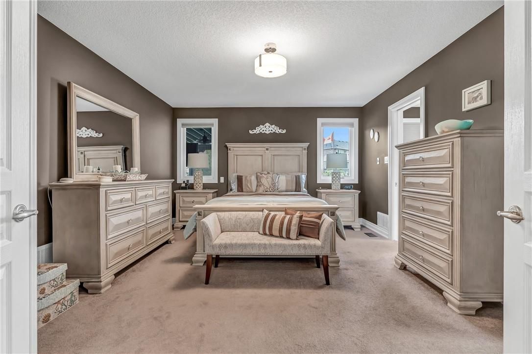 Custom-built home with over 5000 sqft of finished living space, meticulously maintained by original owners. It offers 2 primary bedrooms, as well as a full in law suite, ideal for a multi generational family. Situated on an oversized pie shaped lot, 10 min to upper james shopping. This stunning property boasts a wide stamped concrete drive w/ parking for 4 vehicles + oversized double car garage, 11 ft in height, w/ 9 foot high garage doors, perfect to accommodate a car lift. Main floor features a dream kitchen with custom cabinetry, quartz countertops, extra large sink & eating area with oversized patio door leading to the backyard oasis. Main floor primary bed w/ walk in closet & 6pc ensuite. Bright & spacious 2 storey family rm w/ natural gas fireplace, separate living & dining room, bed/office, 2 pc bath & main floor laundry off of the garage. The upper level offers a family room, 3 bedrooms, including 2 that offer ensuites & walk in closets. Fully finished basement has a full kitchen with dining area, rec room, bed w/ ensuite privilege to 3pc bath, office, workshop, 2nd laundry rm, + hot tub & hobby room. Gorgeous backyard featuring inground saltwater pool with new heater, stamped concrete surround, trex decking on patio & in the covered outdoor kitchen area, outdoor speakers & oversized custom shed. 4 season sunroom is the perfect place to relax. Recent updates include pool heater 2025, roof shingles 2020, shed & sun rm shingles 2022, furnace & a/c 2023. This home must be seen! Luxury certified.