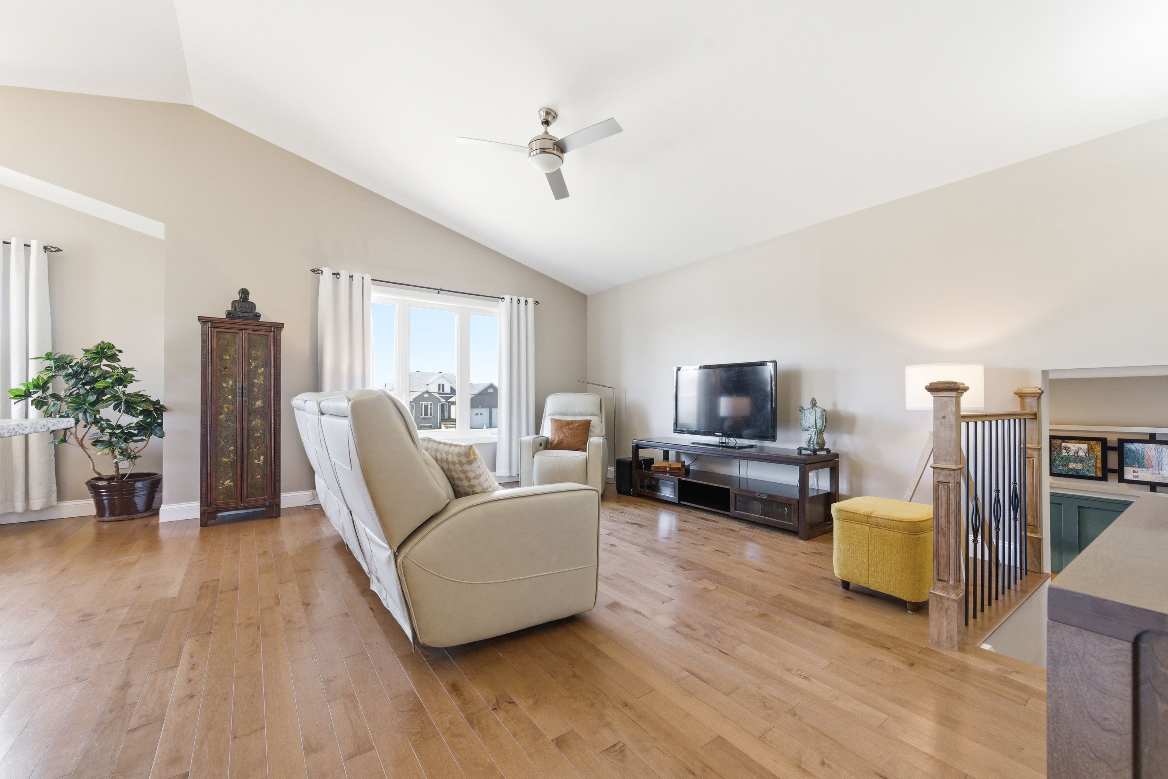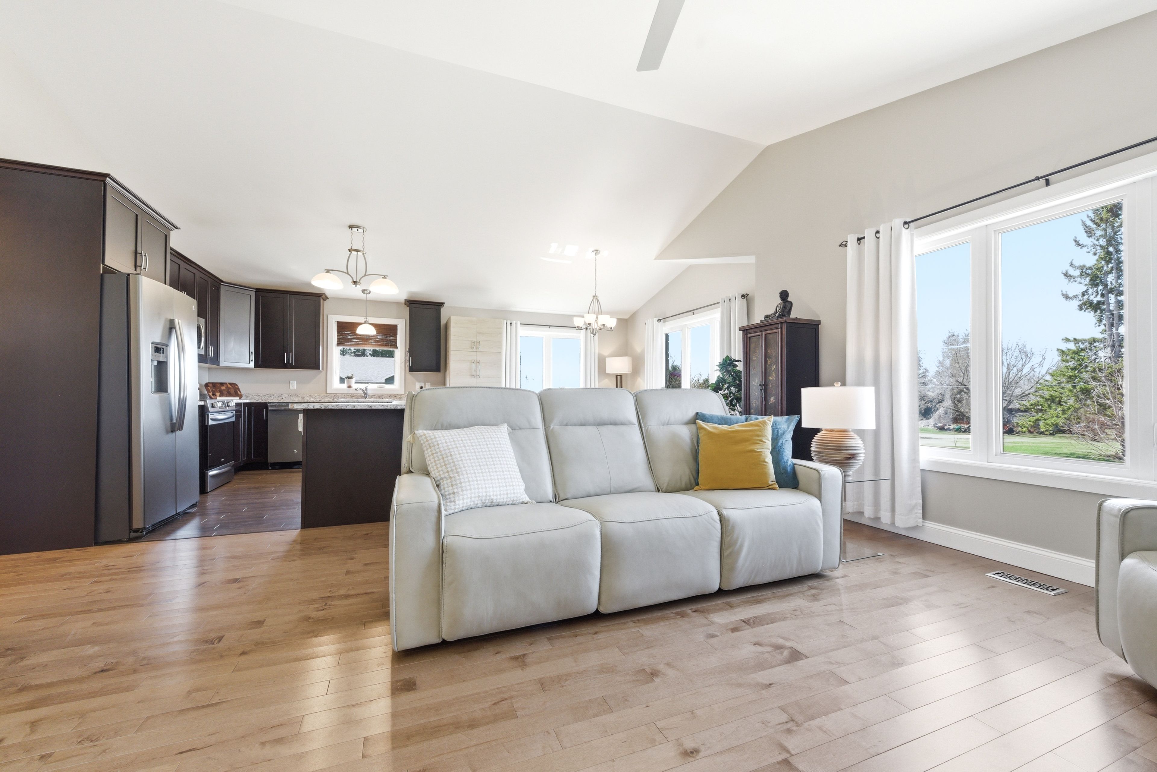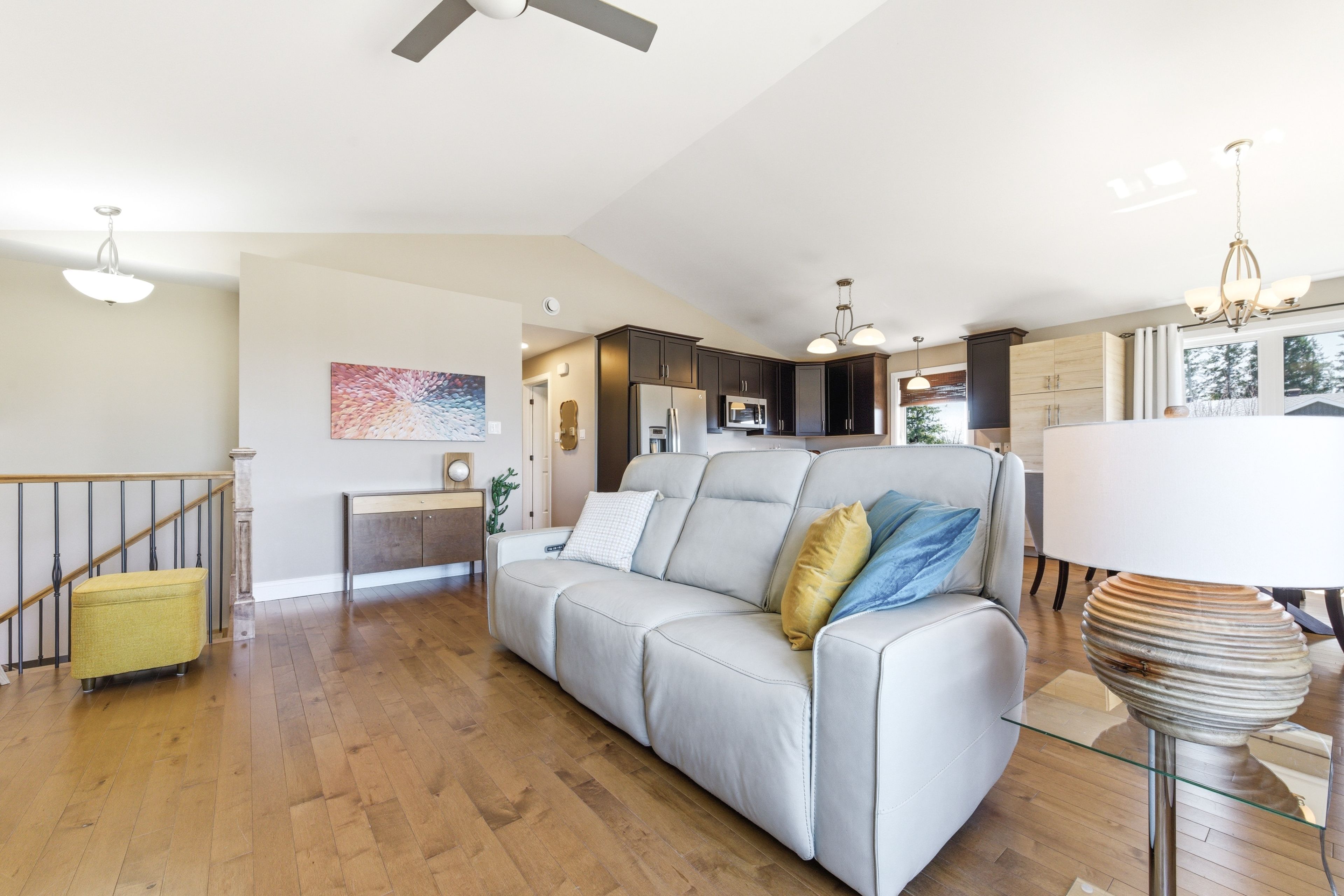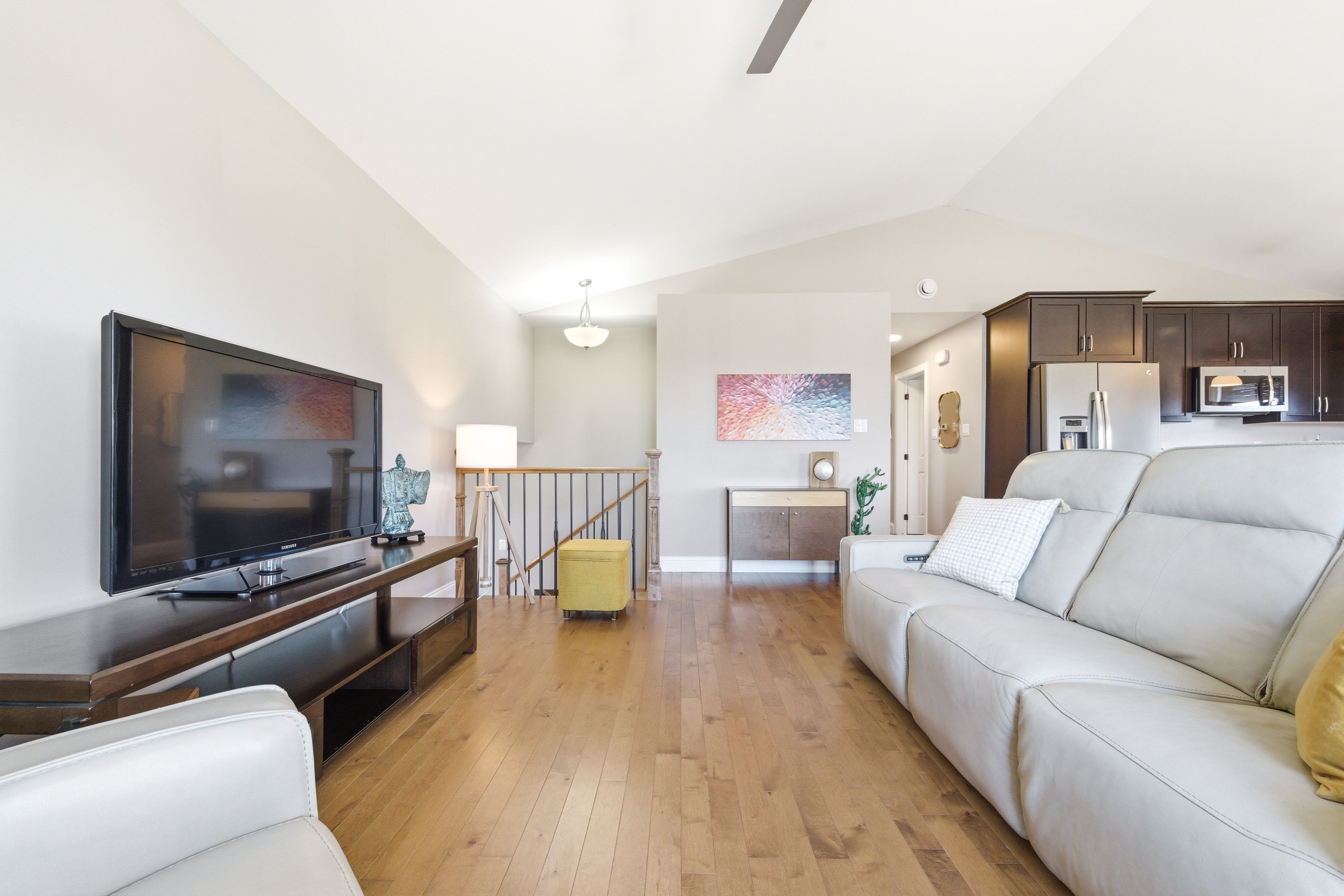 • Bright open-concept main level features vaulted ceilings and large windows.