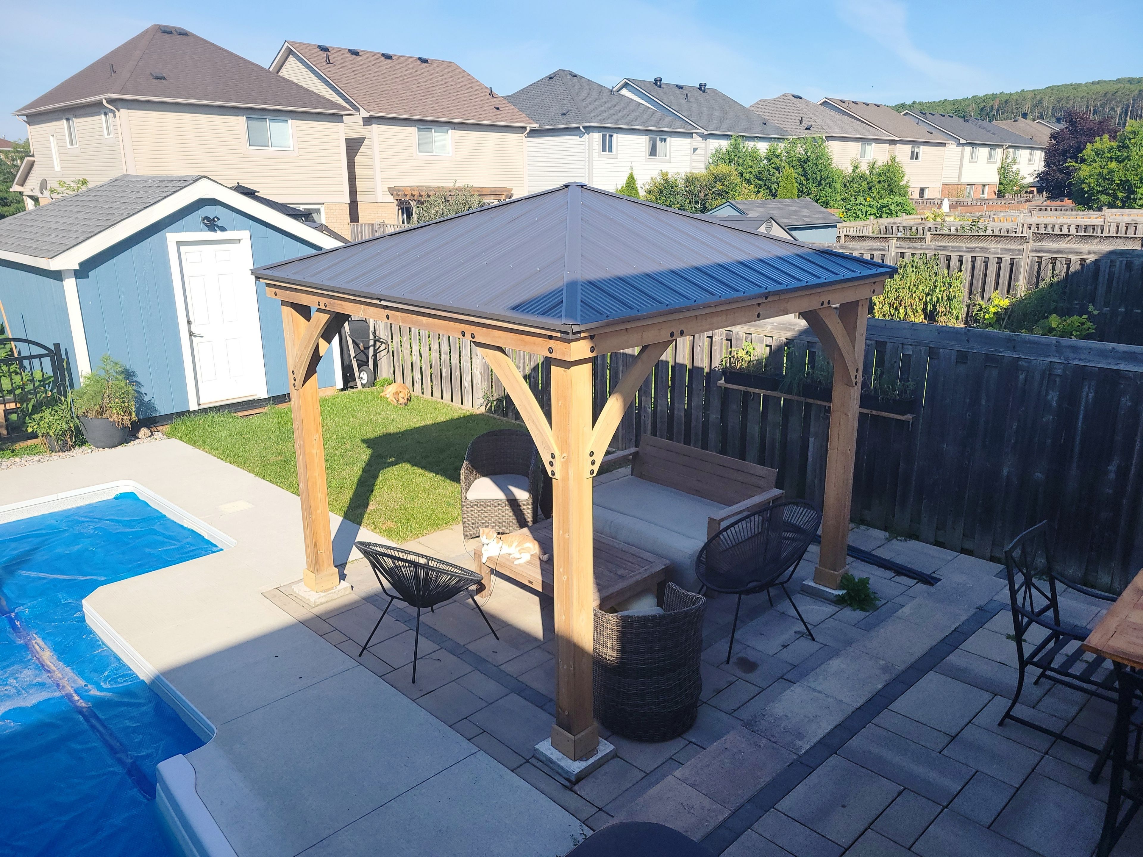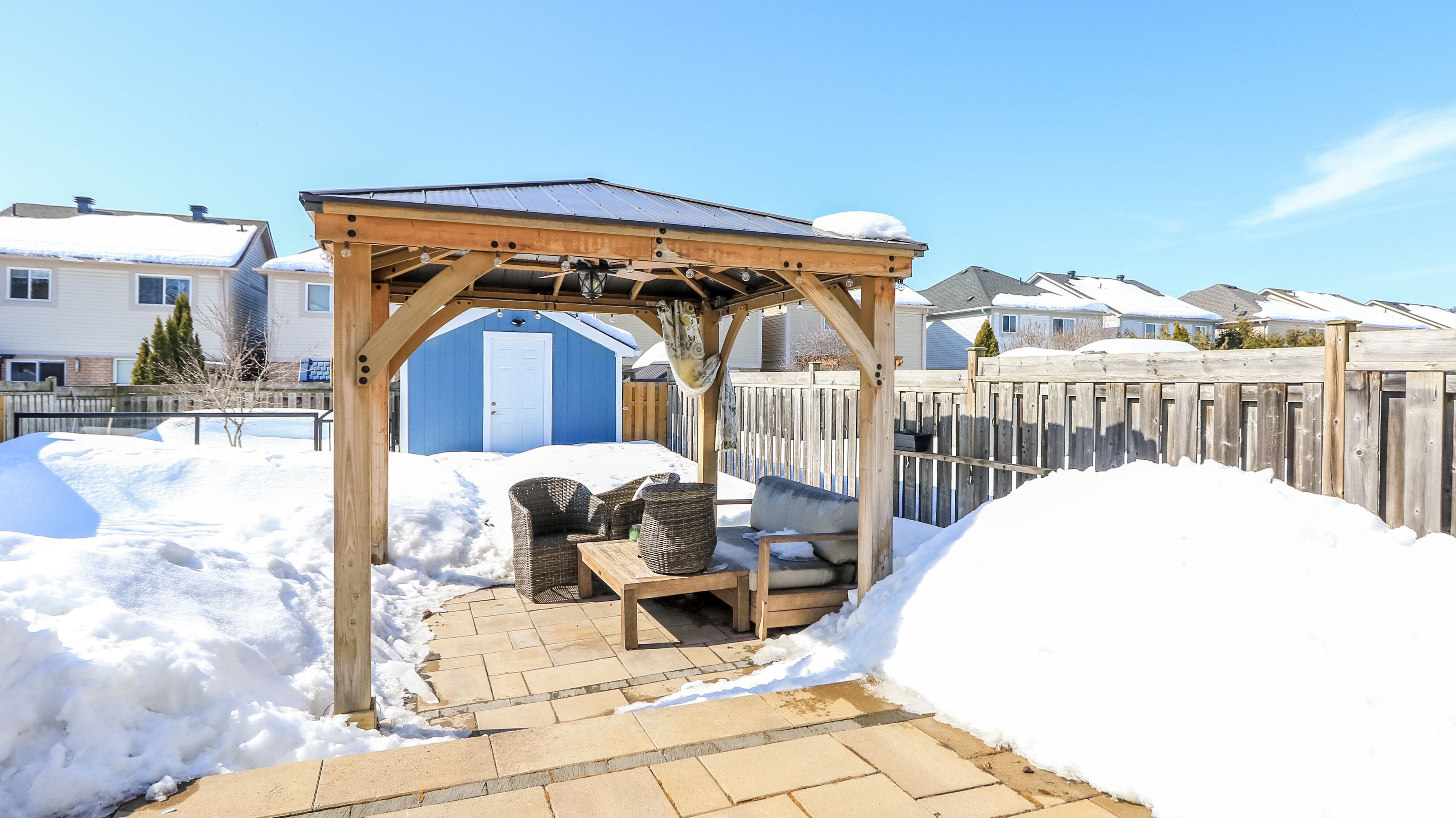 This freehold end-unit stands in a league of its own, although a townhome only connected by garage. No interior walls attached offer an almost link type home which is offering privacy, outdoor space, and curb appeal rarely found in townhome living. Set on a deep, irregular lot with 28 ' frontage and 128' depth, it delivers rare urban space to breathe. Beautifully maintained, the added yard space - a true benefit of end-unit living - immediately sets it apart. A private driveway leads to the attached garage, complete with a dedicated ev charger outlet for modern convenience. Step inside to bright, welcoming interiors. Large upgraded windows fill the home with natural light, highlighting the main level's warm hardwood floors and timeless, neutral finishes. The living area offers generous space for relaxing or entertaining, with effortless flow throughout. At the heart of the home, the upgraded kitchen handles everyday routines and entertaining with ease, featuring quality finishes and ample workspace. The adjacent dining area connects seamlessly to a walk-out leading to your private backyard resort. The professionally designed backyard is the ultimate retreat. A heated saltwater pool offers a soft, skin-friendly swim and extended season, while a private hot tub provides year-round relaxation. The permanent gazebo creates a shaded space for alfresco dining, lounging, or entertaining. Fully fenced for privacy, the yard also includes a garden shed for seasonal storage. 34 ridwell street combines modern comfort, functional living, and a backyard lifestyle rarely found in barrie. Enjoy a completely brand new furnace and ac (2025)-to be fully paid off by the seller on closing. High-performance andersen fibrex windows (2021), known for being twice as strong and significantly more energy-efficient than standard vinyl.