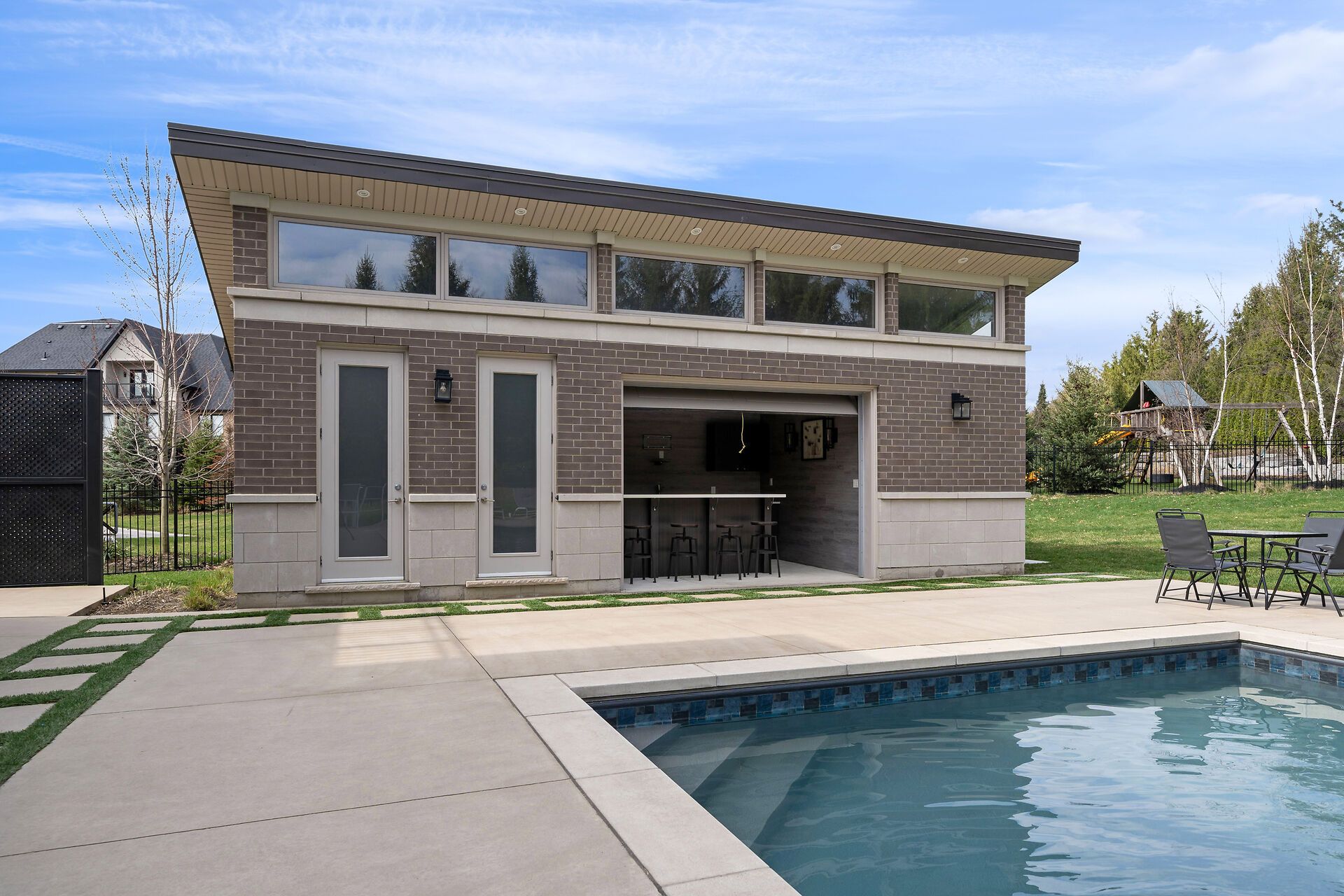 • Backyard features a large pool with waterslide and cabana for entertainment.