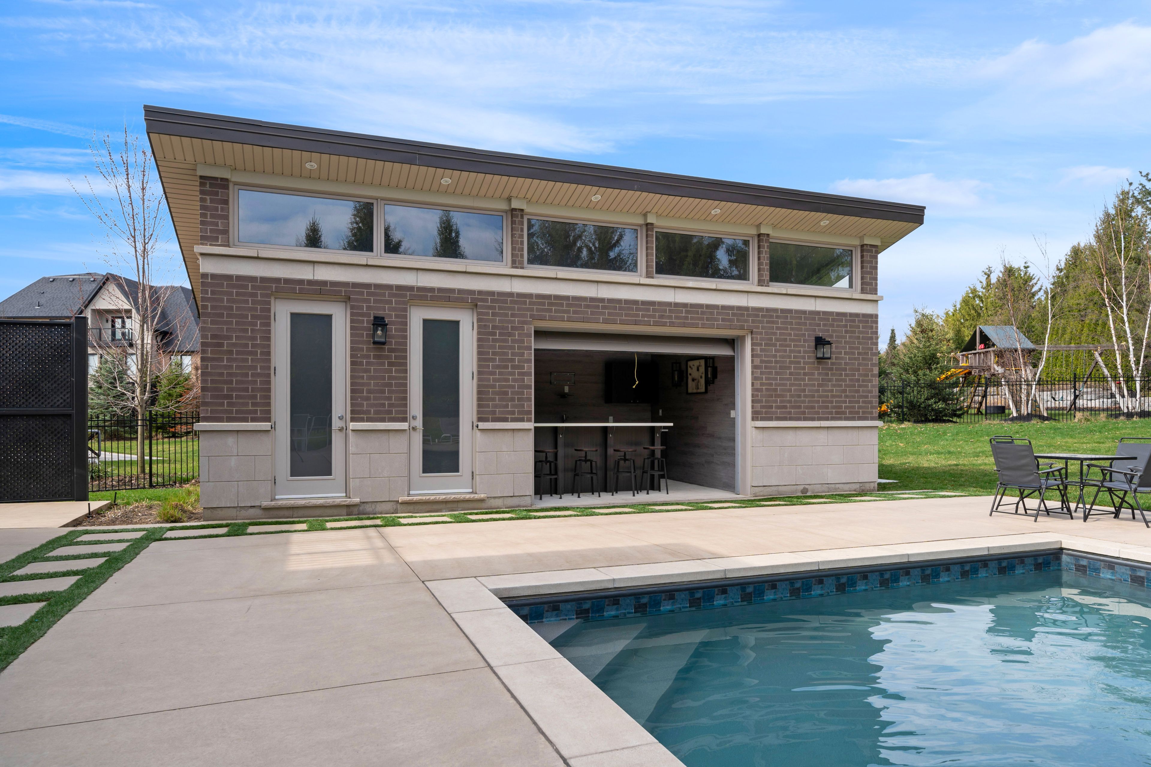 • Expansive backyard with a pool, waterslide, and cabana for relaxation.