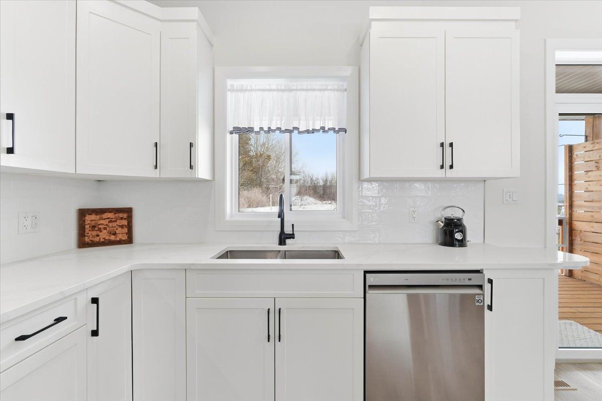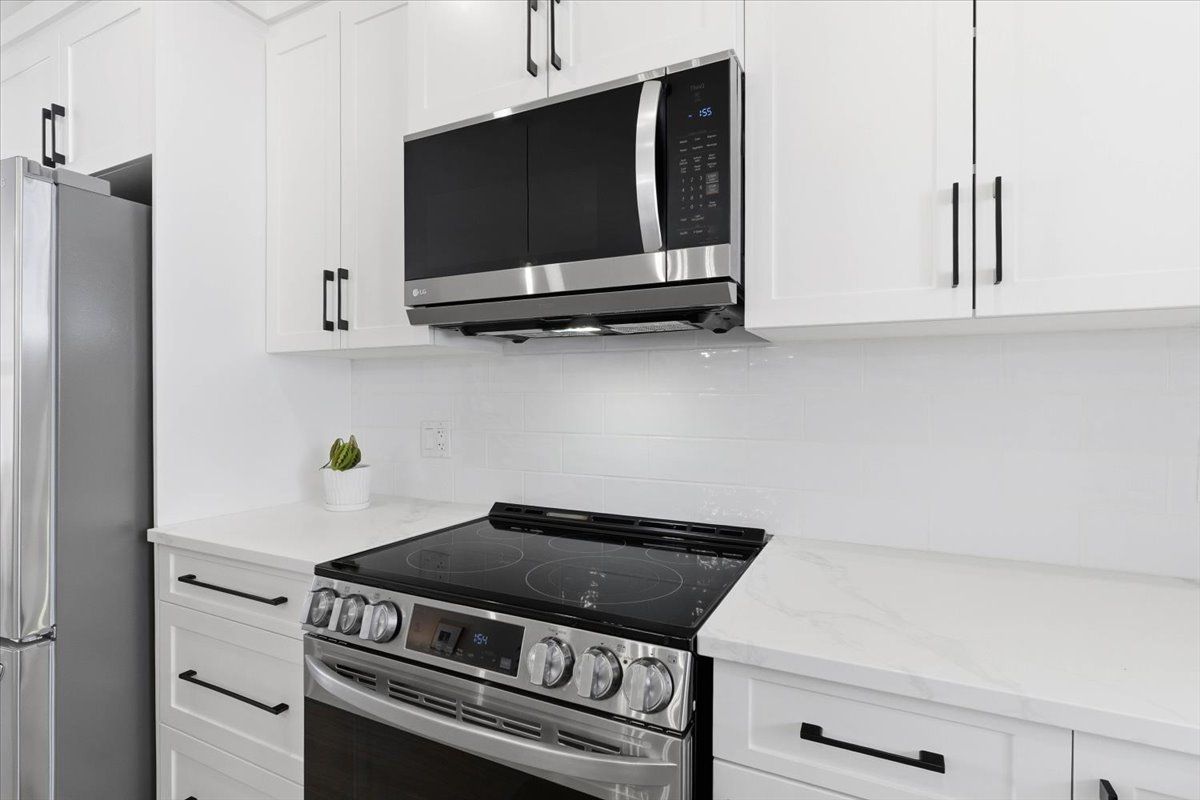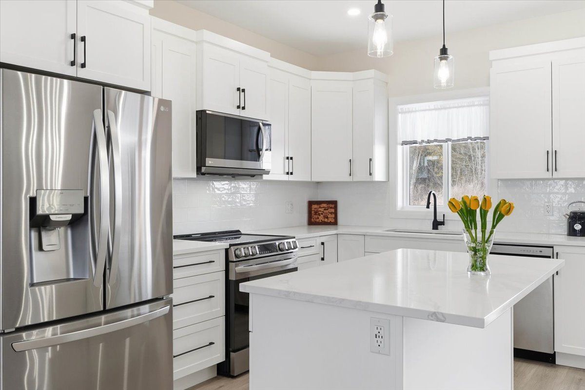 • Classic white kitchen with quartz countertops and an island, perfect for gatherings.