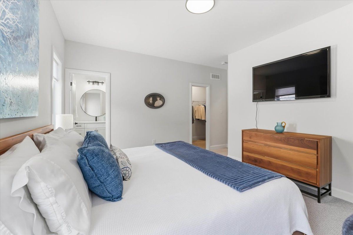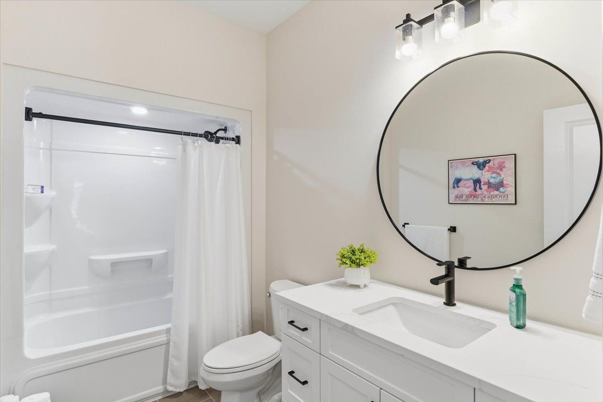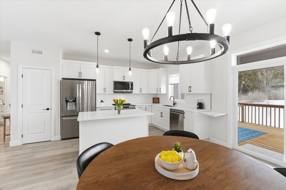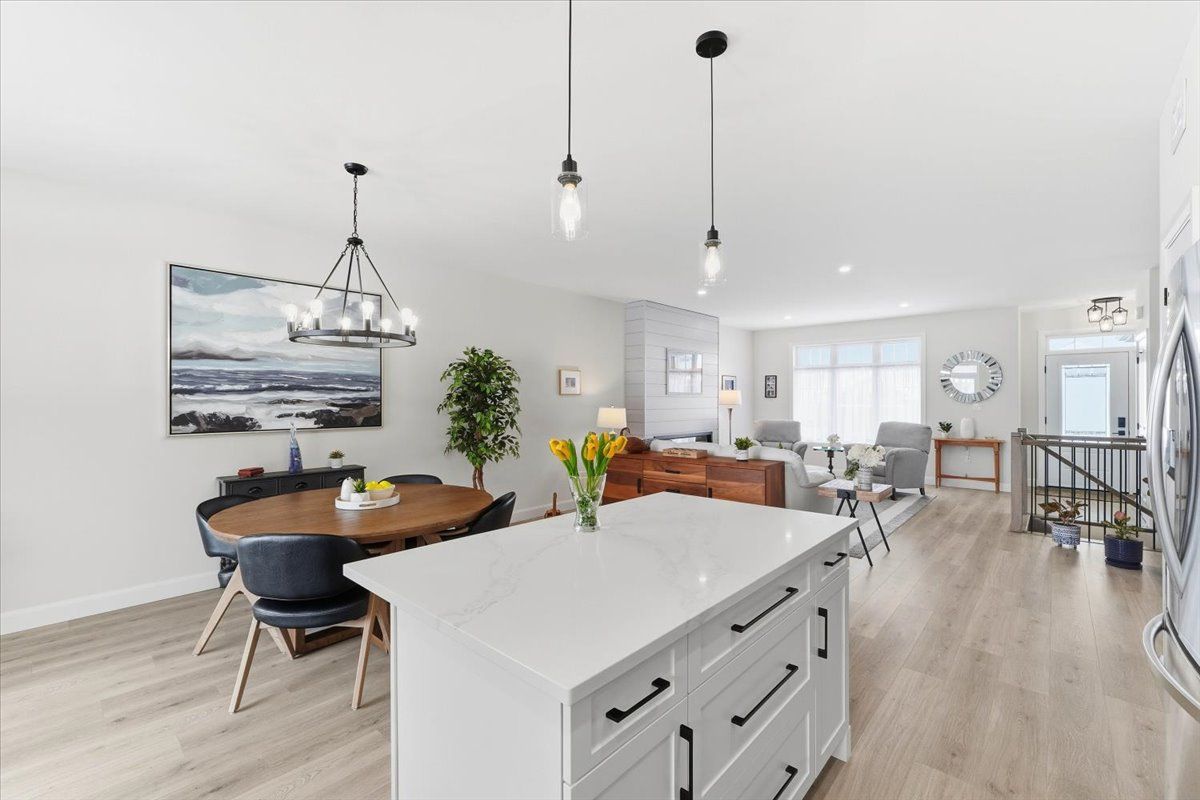 • Classic white kitchen with quartz countertops and an island, perfect for gatherings.