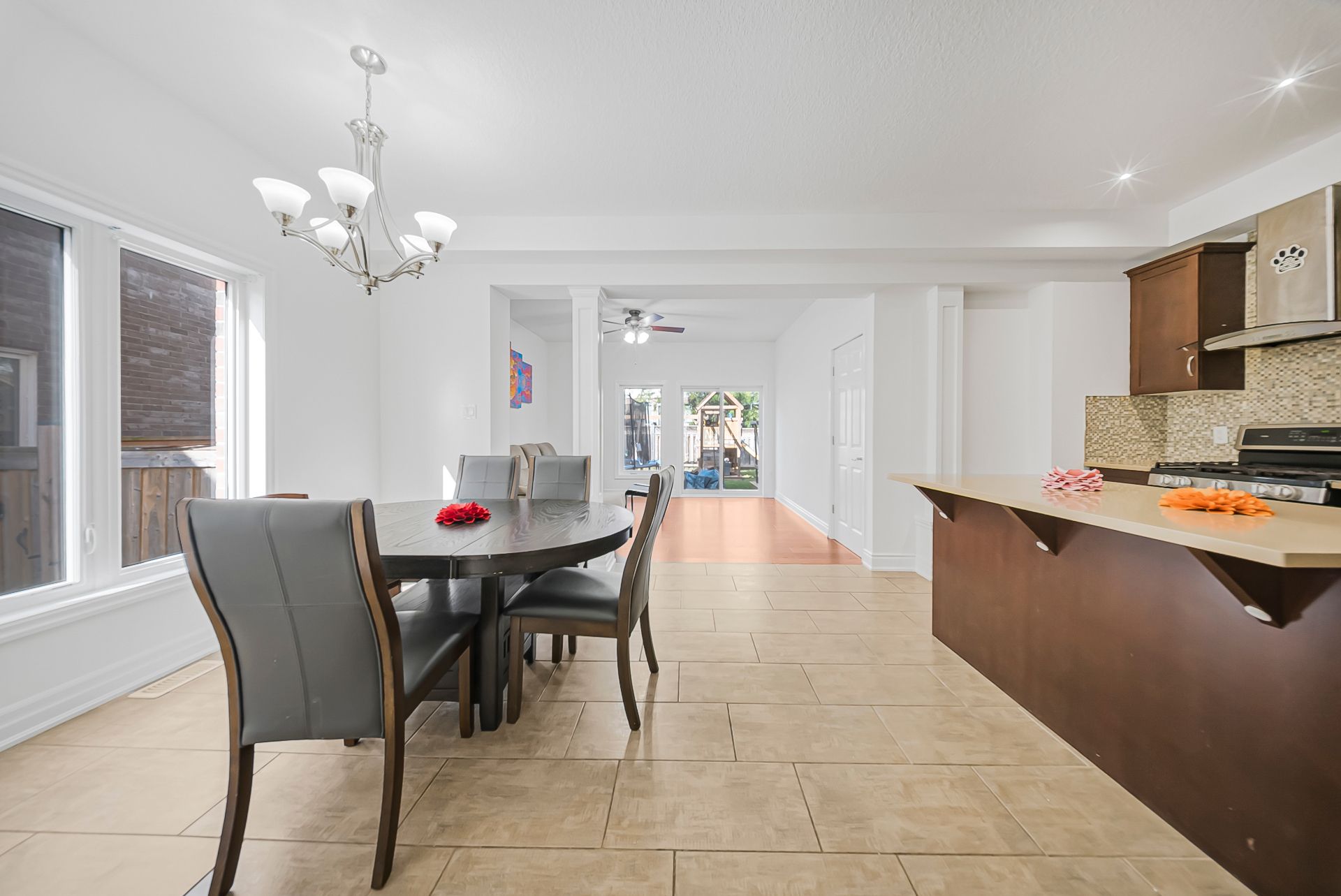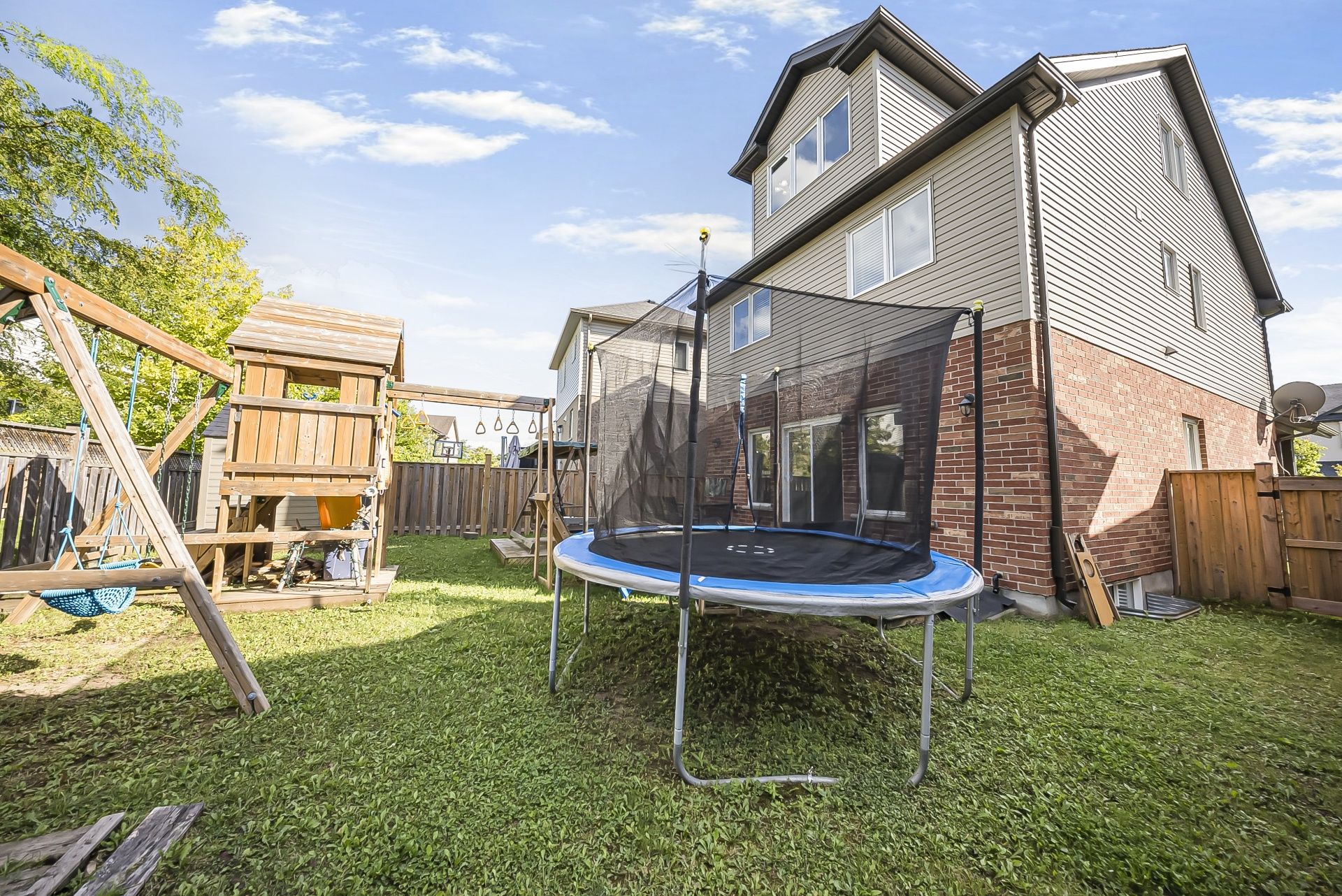 • Spacious fenced backyard with a playset, great for kids and pets.