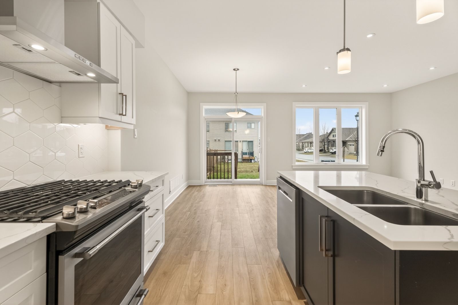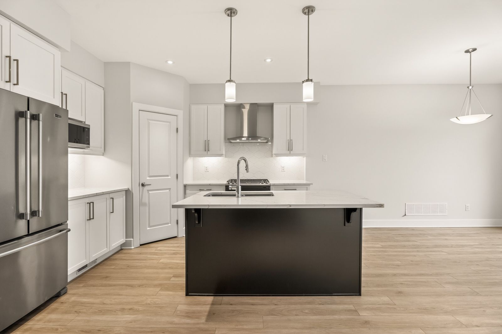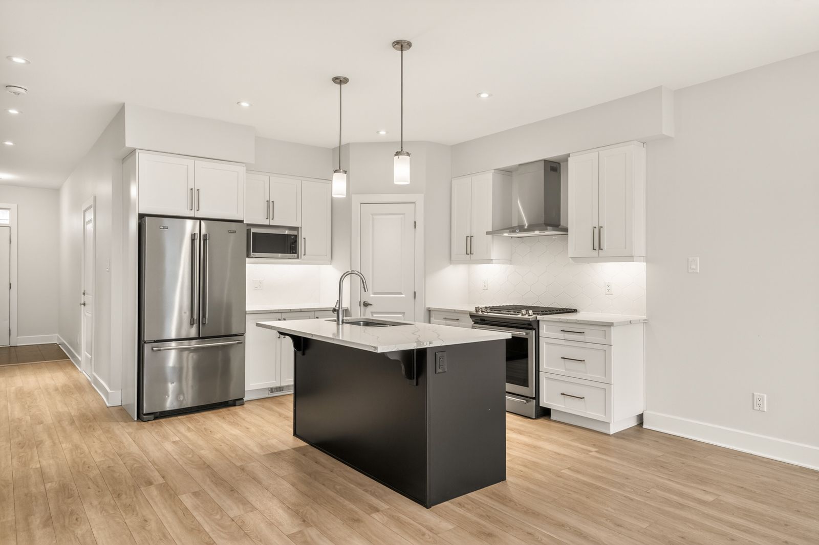 • Gorgeous kitchen with white cabinets, quartz, and stainless appliances.