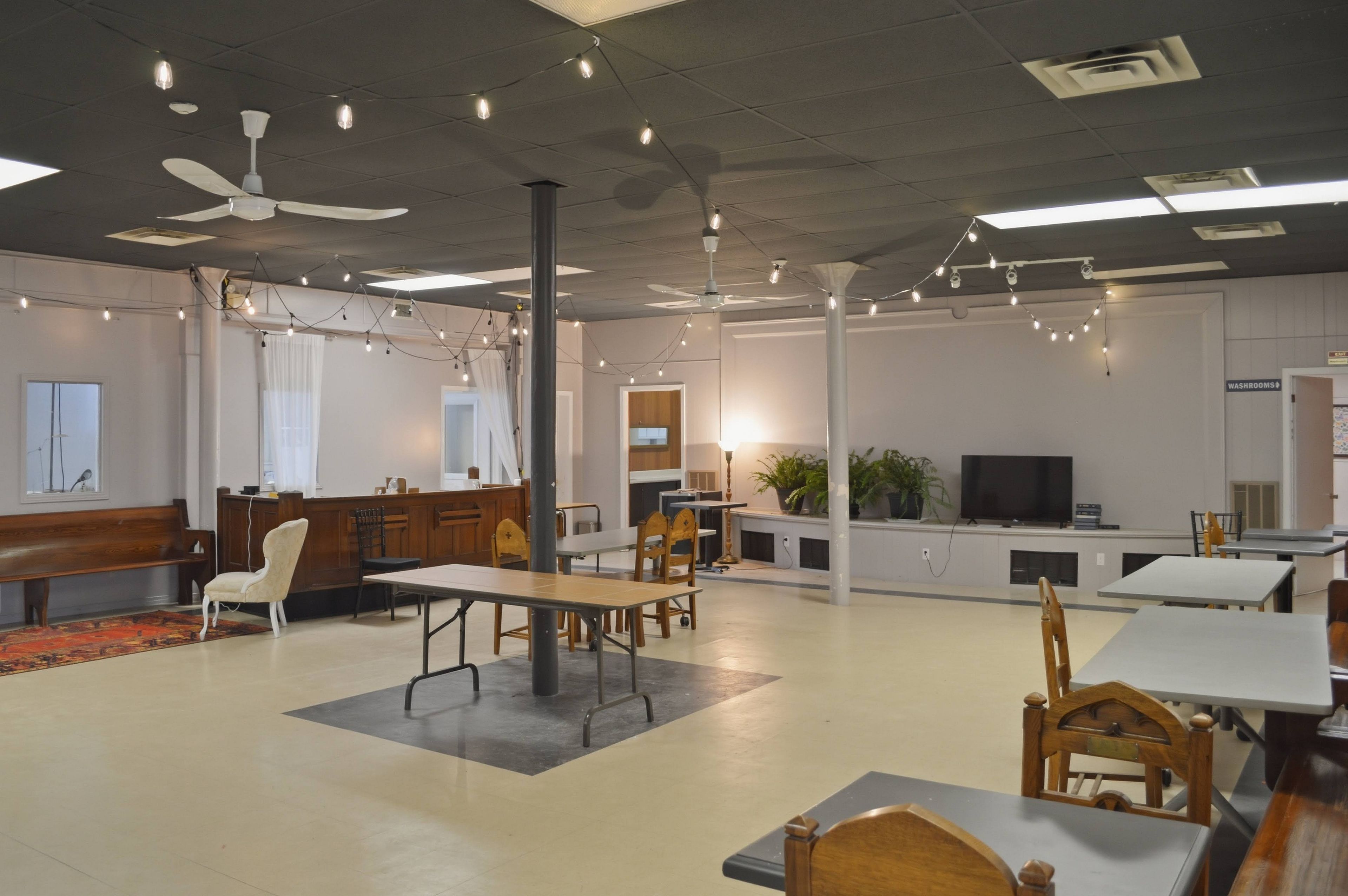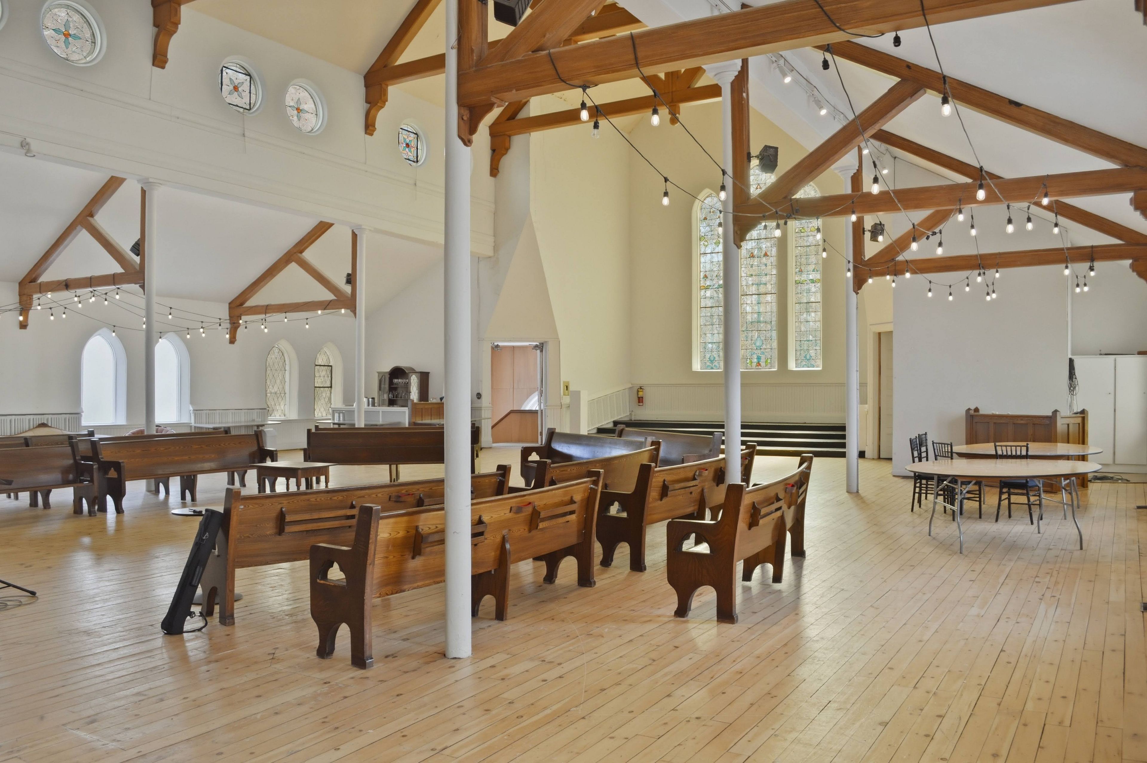 Venue 1906 is a wedding and special events space located in the heart of downtown belleville, ontario. Built in 1906, this converted heritage church building boasts high ceilings with dark wooden beams and towering organ pipes. It is the perfect backdrop for ceremonies and receptions or special events. Seating for 140 people in the main space. Lower level space suitable for smaller groups or reception, connected to a prep kitchen.