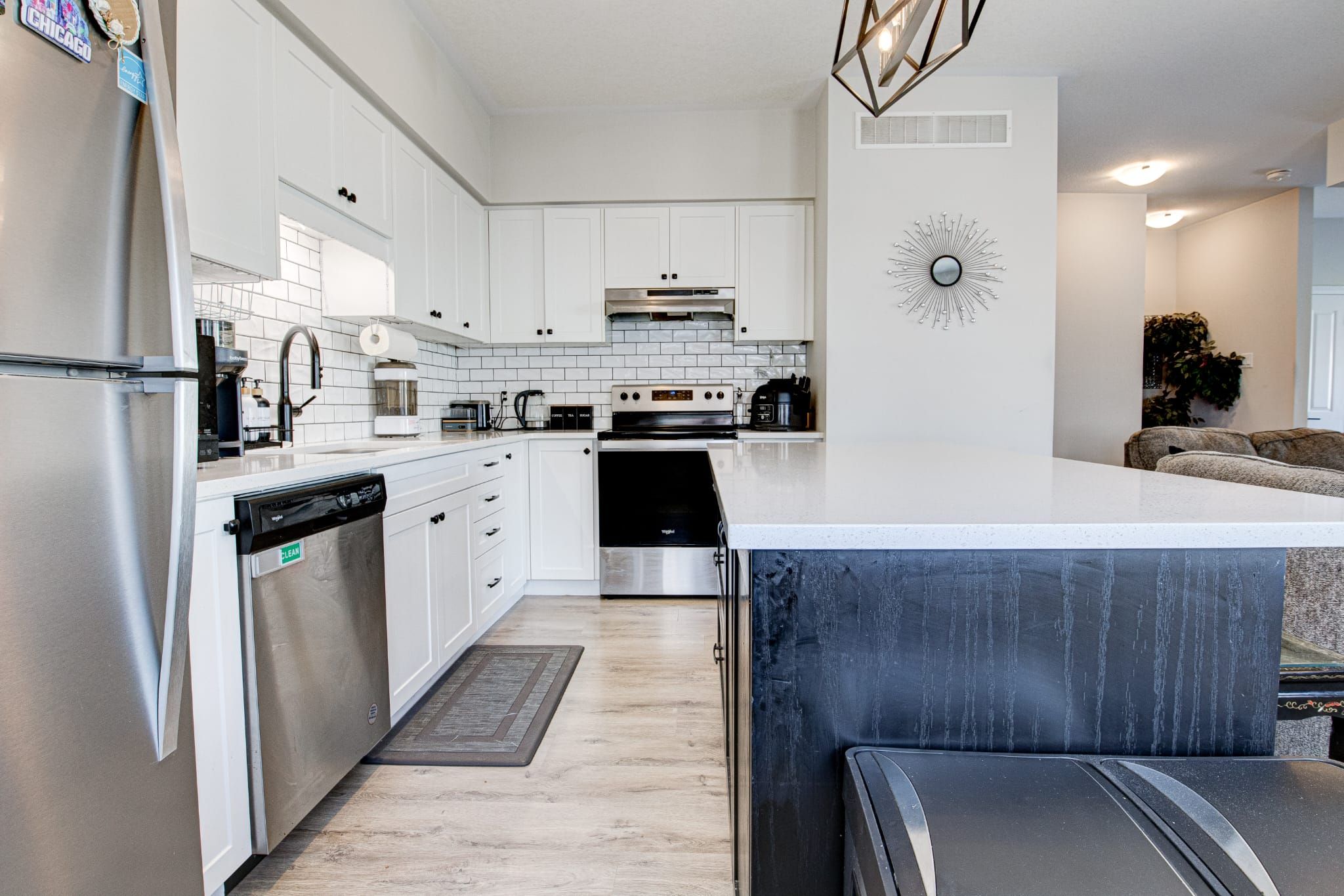 • Private balcony and modern kitchen with stainless-steel appliances.