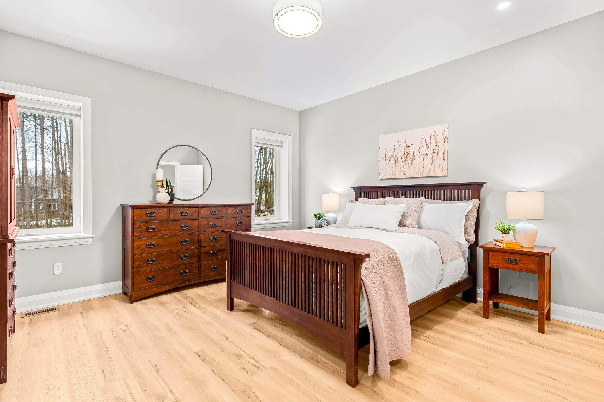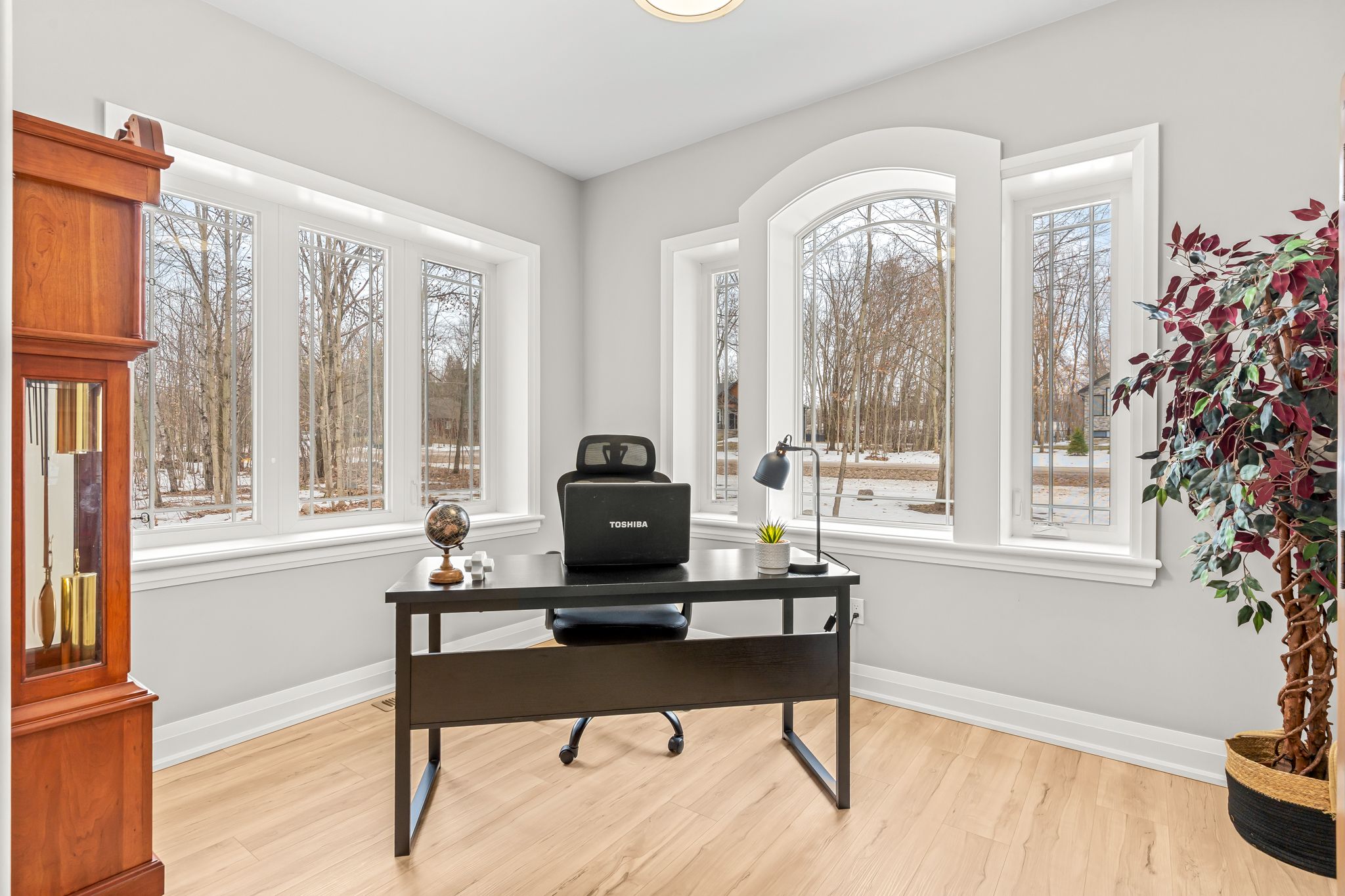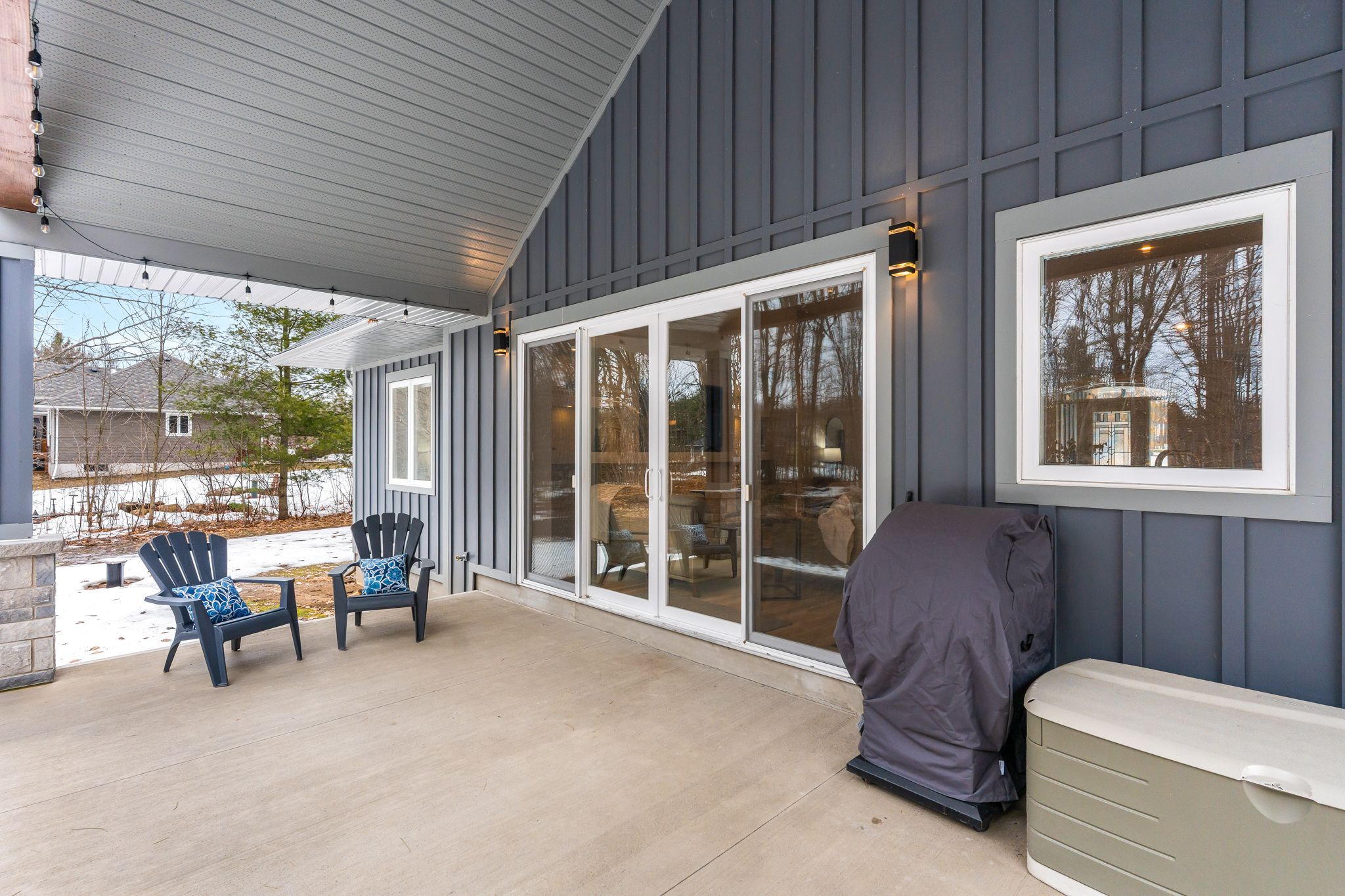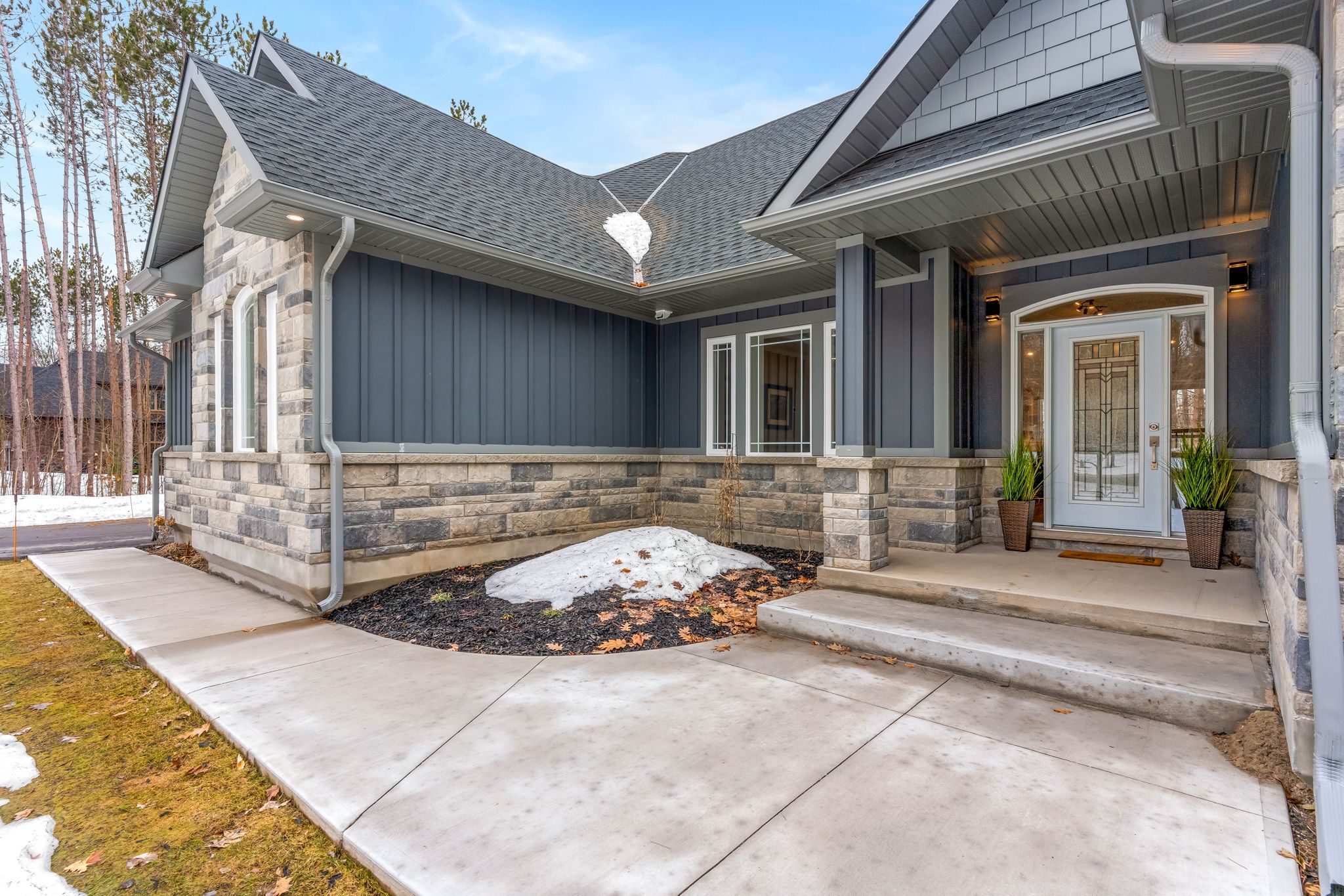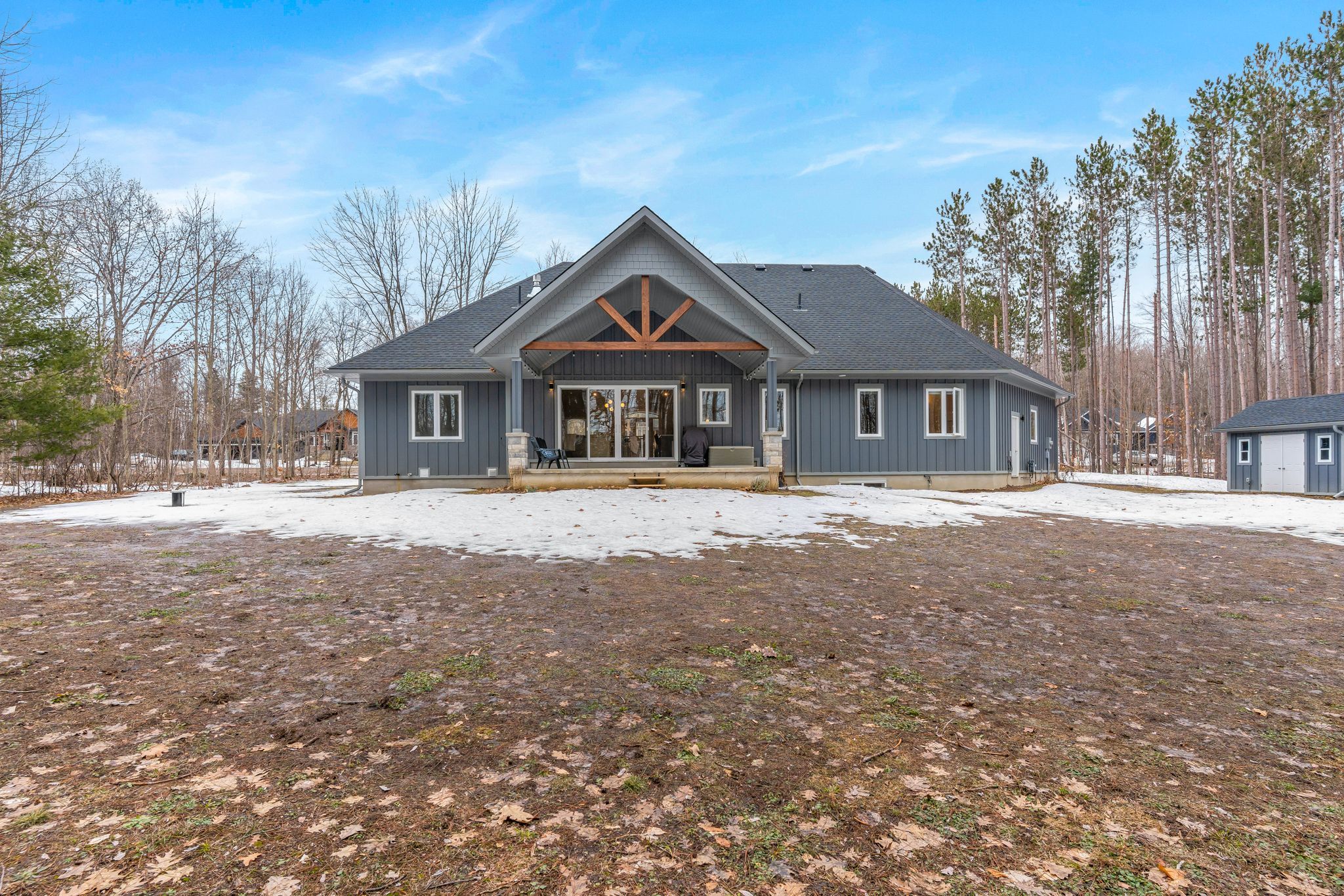 Enjoy complete luxury on a beautifully wooded 1-acre lot in the prestigious windermere estates-an exclusive executive community known for its estate-sized lots, upscale custom homes, and peaceful natural surroundings, just minutes to midland's shops, dining, marinas, and georgian bay. Recently built, this custom-built 5-bedroom residence offers the perfect blend of refined design, modern efficiency, and exceptional craftsmanship-ideal for those seeking space without compromising convenience. The open-concept main level is designed to impress, featuring wide-plank flooring, soaring 12-foot ceilings in the heart of the home, and oversized windows that fill the space with natural light. A striking custom oak staircase serves as a focal point, while a gas fireplace anchors the inviting living area with walkout to a covered rear porch. The chef-inspired kitchen is ideal for entertaining and everyday living, showcasing quartz countertops, premium stainless steel appliances including a gas range, and a large island with seating. The primary suite offers a walk-in closet and a spa-like ensuite with a soaker tub and oversized glass shower. A dedicated office and two additional main-floor bedrooms provide flexibility for family or guests. The fully finished lower level with 8. 8' ceilings expands the living space with two bedrooms, a full bathroom, recreation room, and gym-ideal for large families or multi-generational living. Built for performance, this home features an icf foundation, high-efficiency mechanicals, and hrv. The exterior is equally impressive with a covered back deck, spacious yard surrounded by mature trees, paved driveway, upgraded walkway, oversized 3-car garage, and power to the shed. A rare opportunity to own a newer luxury home in one of the area's most sought-after communities.