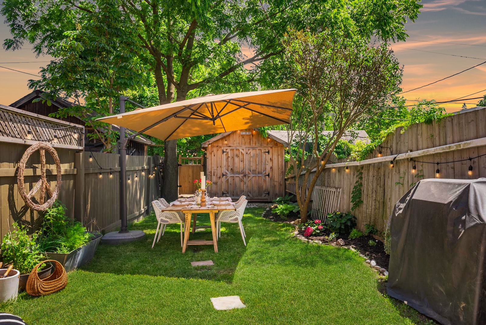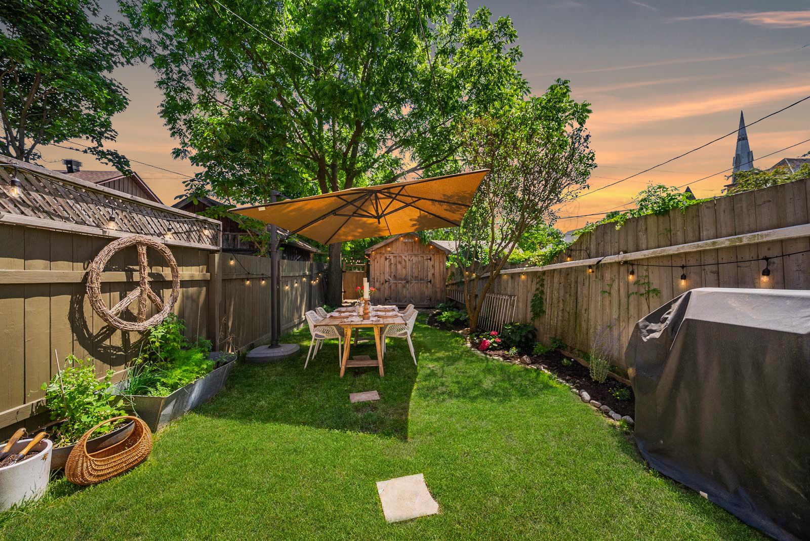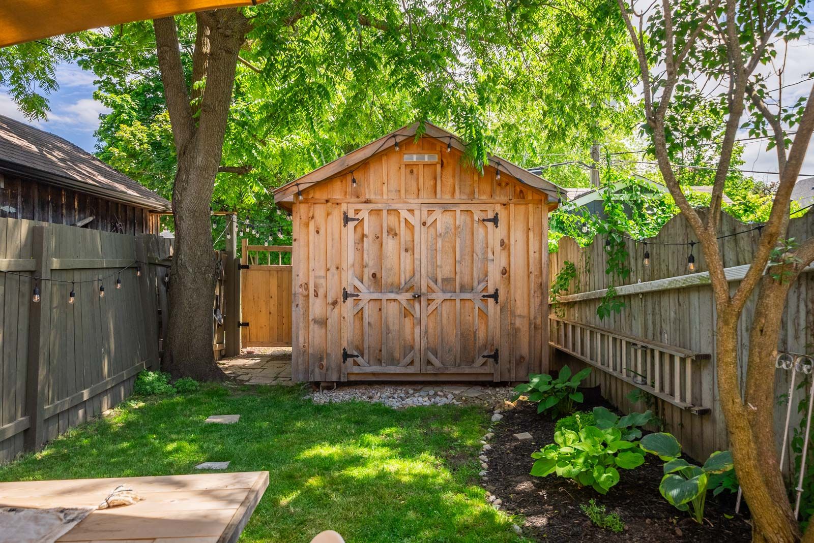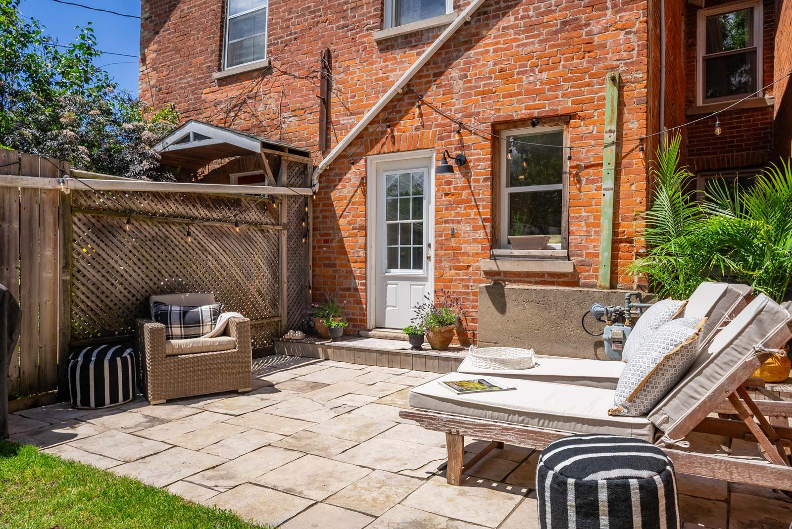 • Private outdoor space with a new stone patio and lush gardens.