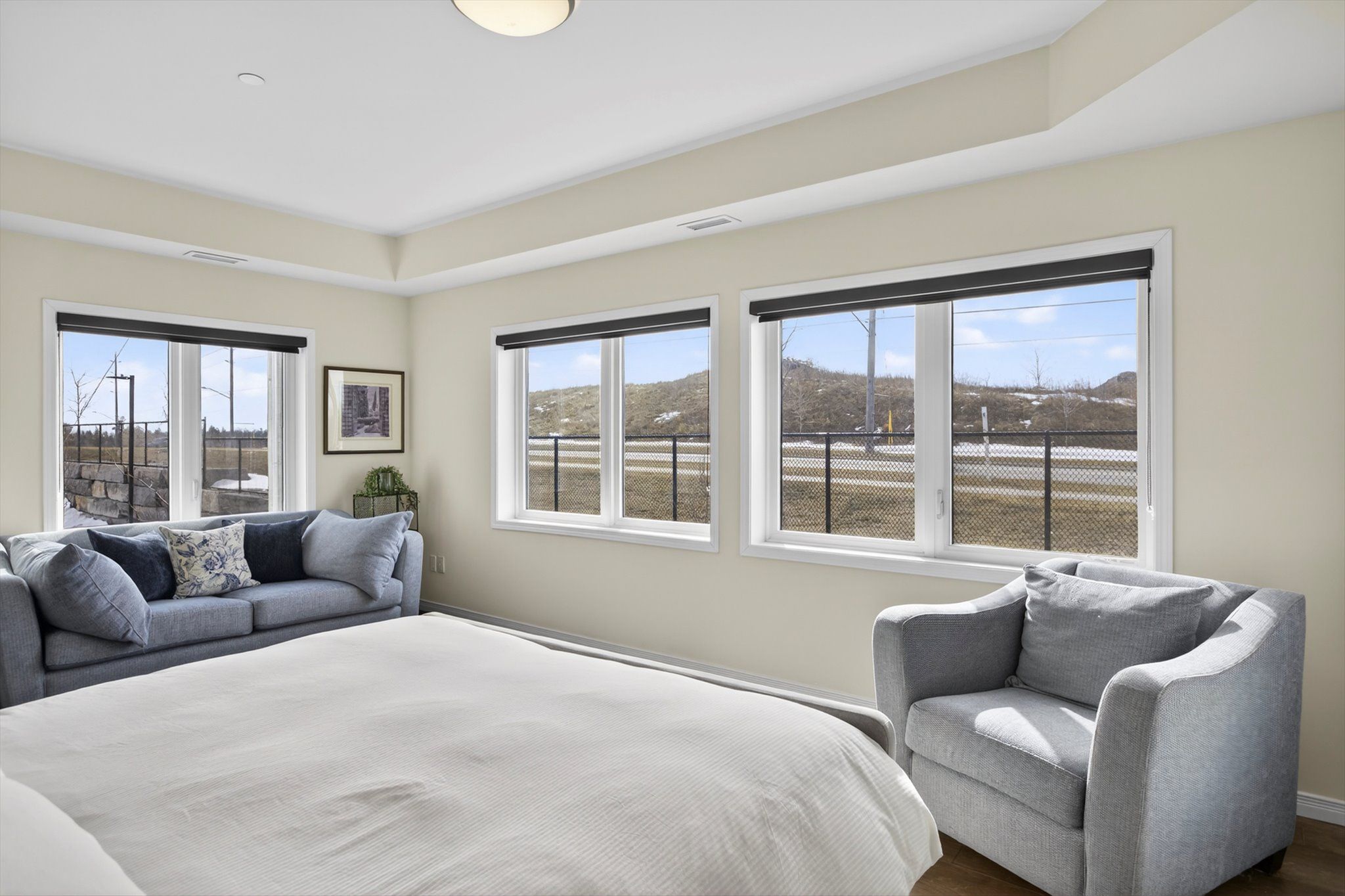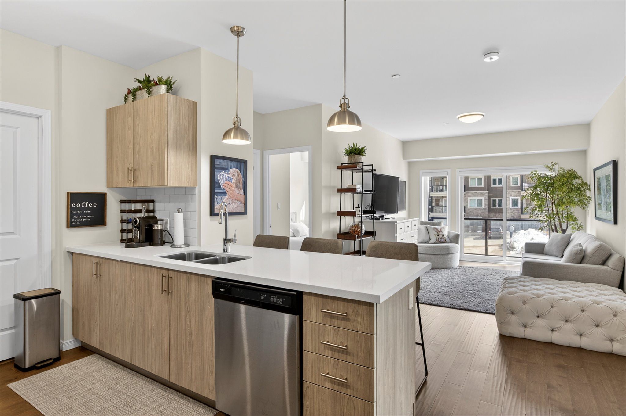 Bright corner unit modern design with 9ft high ceilings. Open concept floor plan, upgraded kitchen with quartz counter tops and breakfast bar, overlooks the spacious living/dining room which flows out to the spacious balcony. Perfect for entertaining while cooking on the bbq. Large bedrooms, primary bedroom features large walk-in closet and 4 pc en-suite, ideal split bedroom floor plan. Laundry/utility room offers room for additional storage. Included gas furnace, central a/c and it also includes one exclusive parking space with a low maintenance condo fees. Located in the prestige jackson creek meadows neighborhood very close to downtown peterborough and hospital, just a short walk to jackson park great for walks or hiking, easy access to hwy 115. View this property and you will love it!