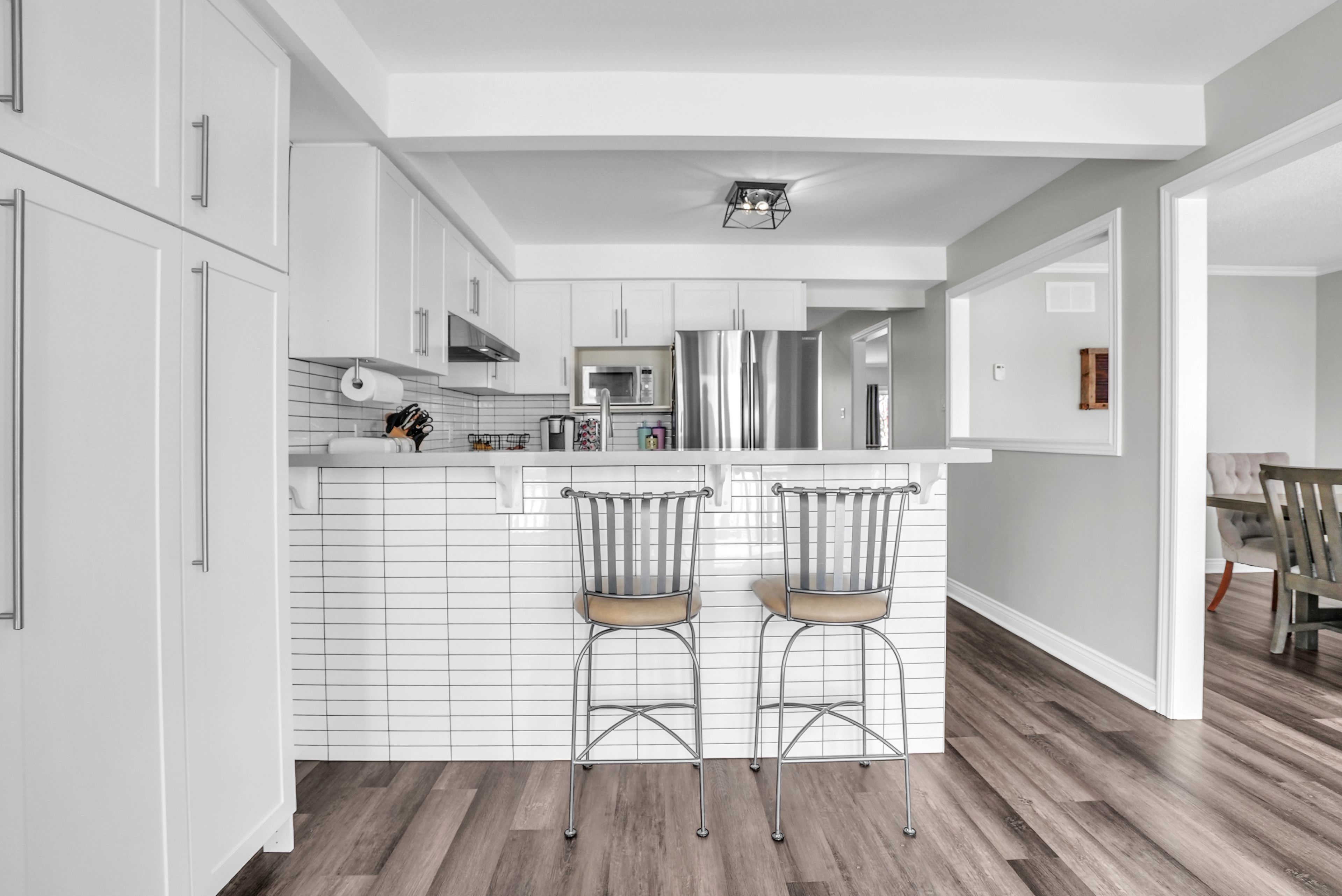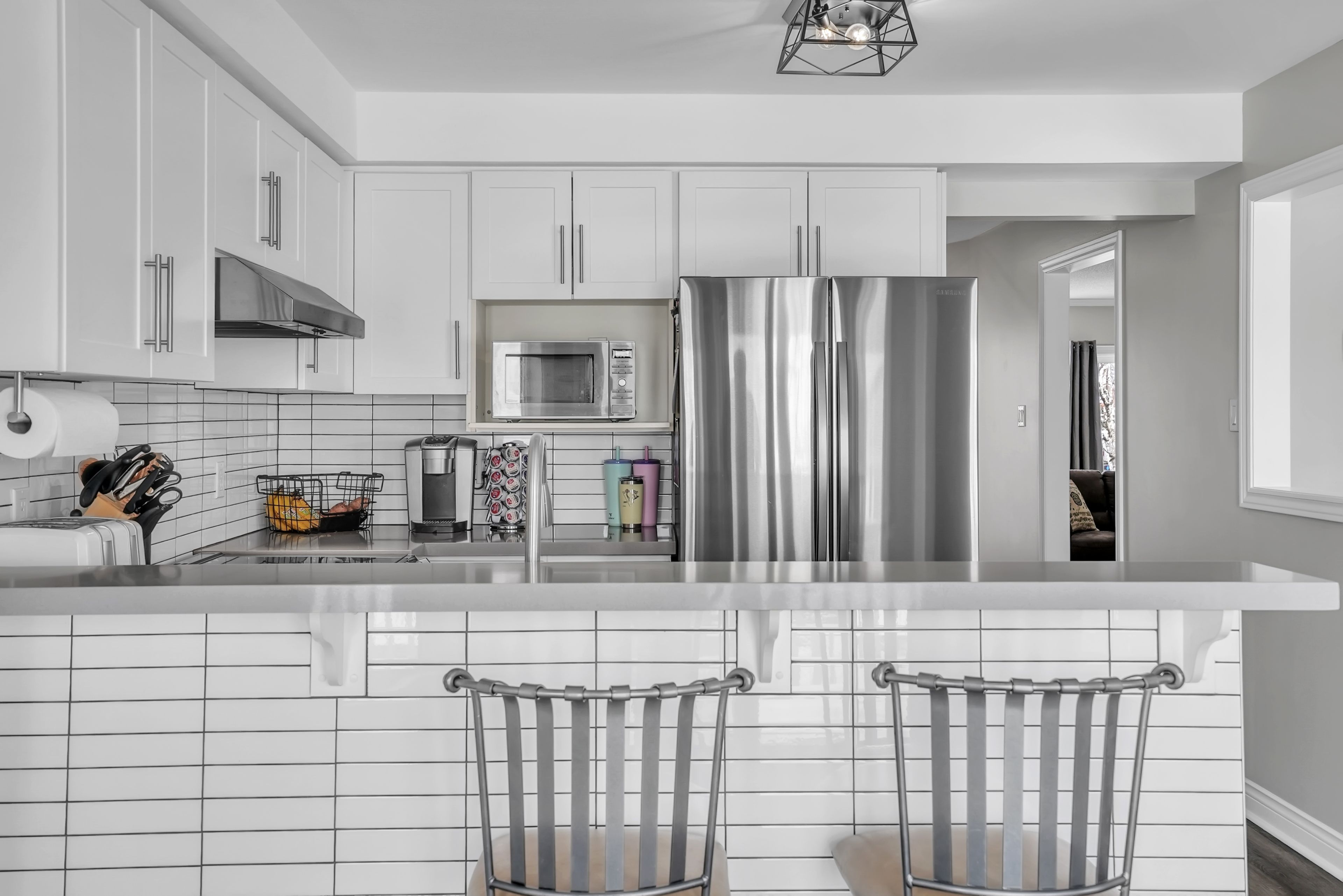 • Updated kitchen with quartz surfaces and modern appliances for convenience.