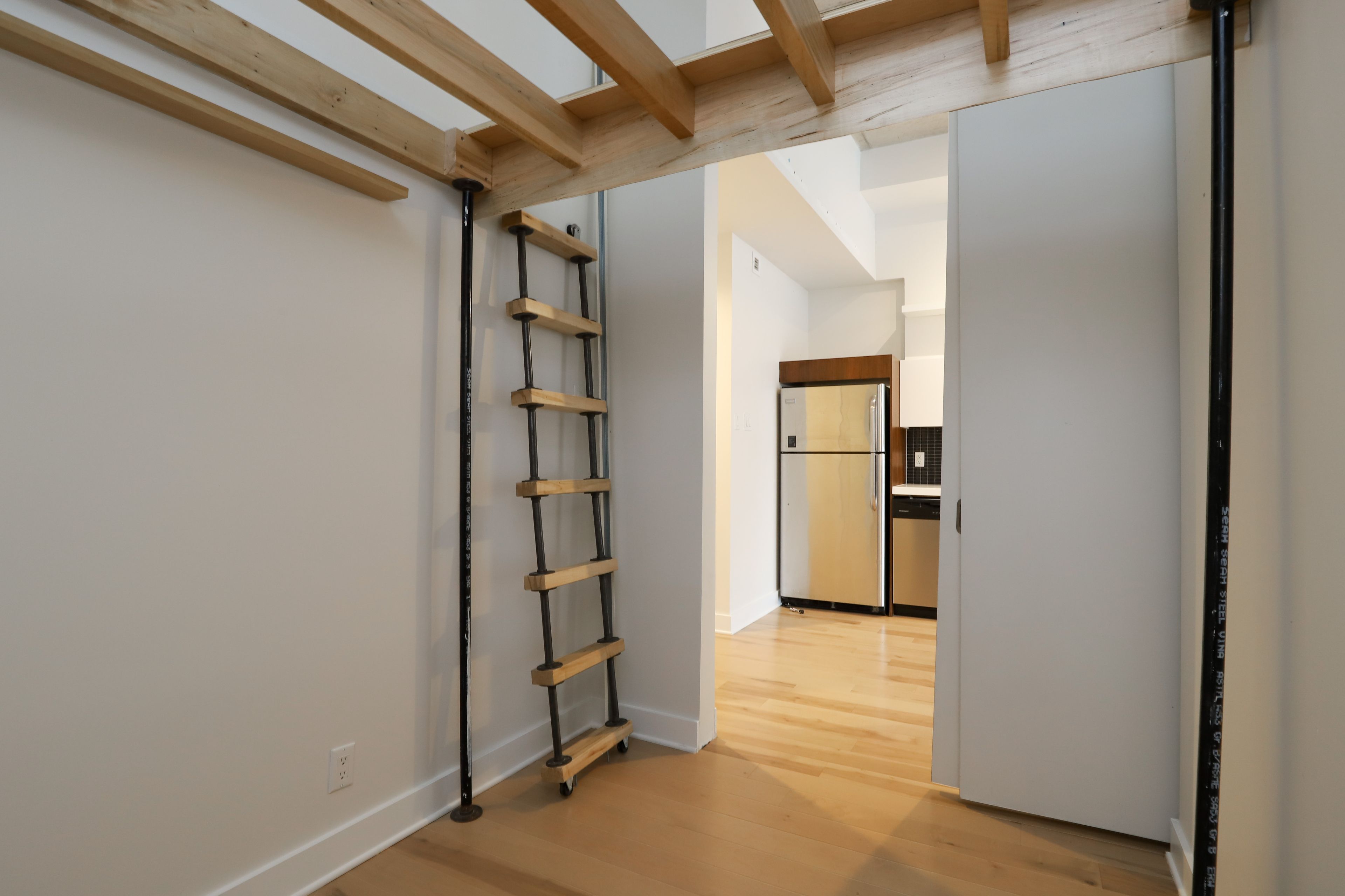 • Modern kitchen with stainless steel appliances and new hardwood flooring.