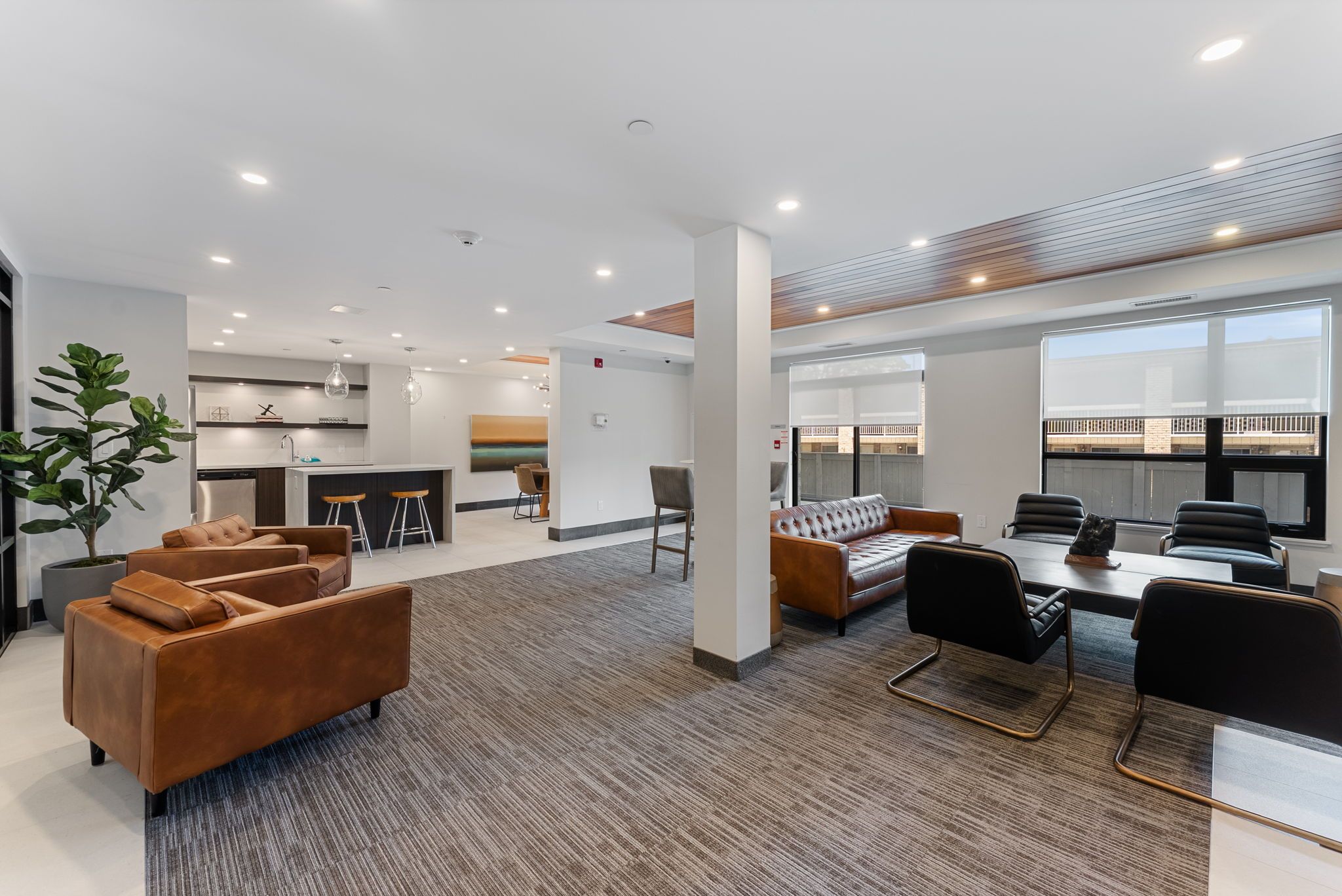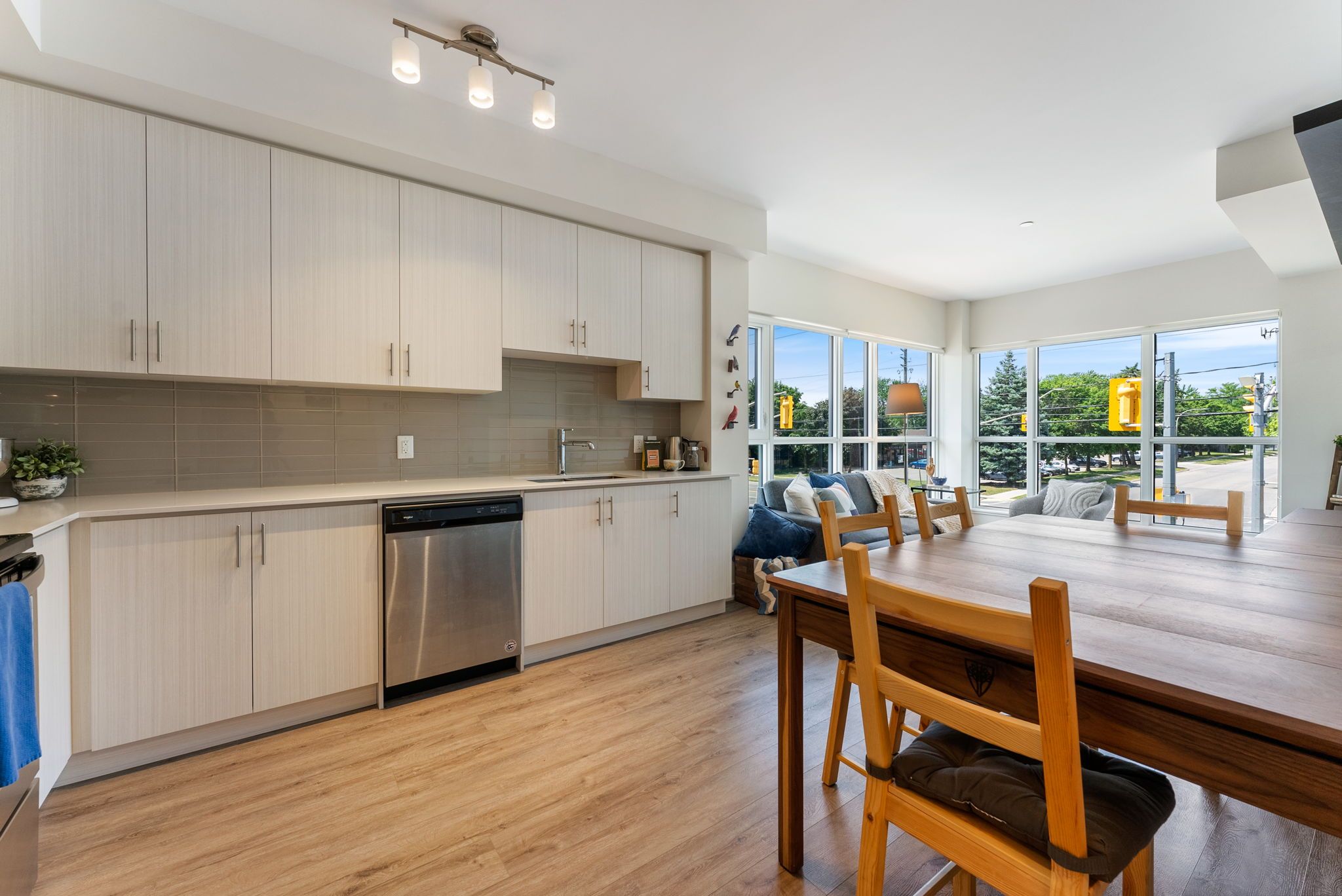 • Bright open-concept layout with a modern kitchen and stainless steel appliances.