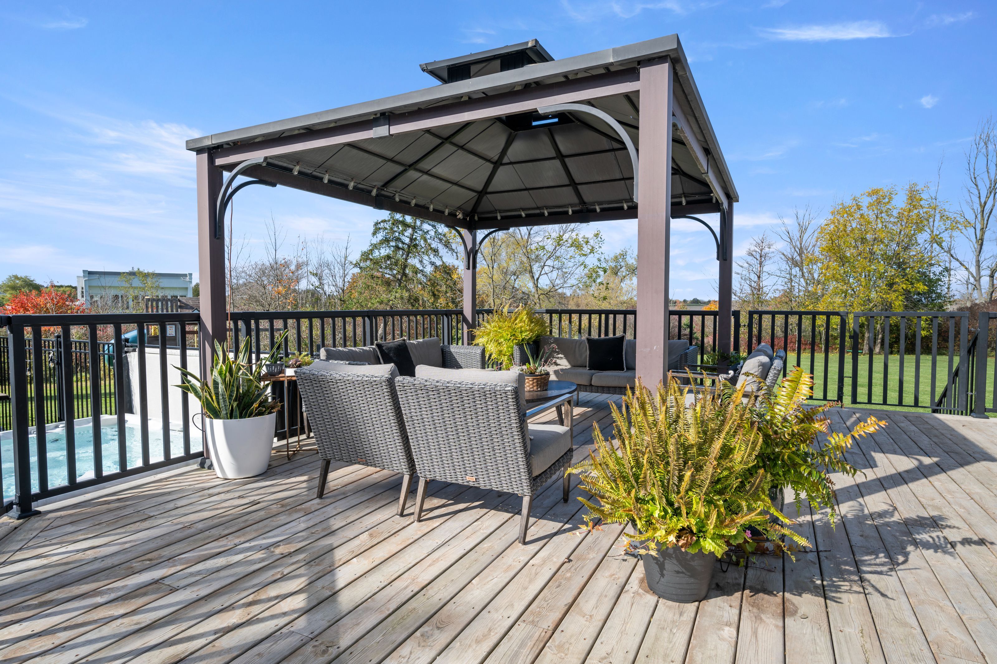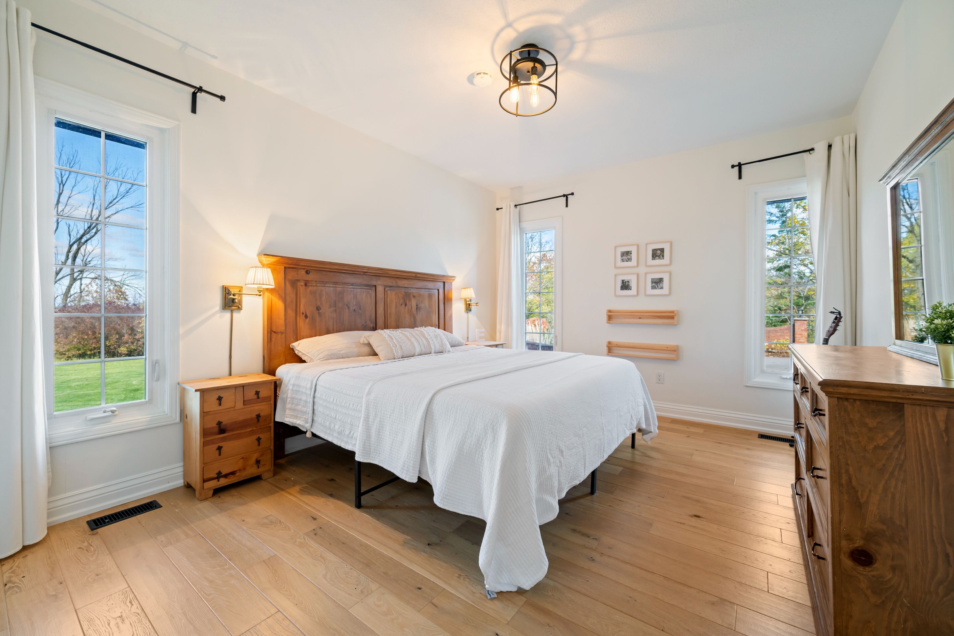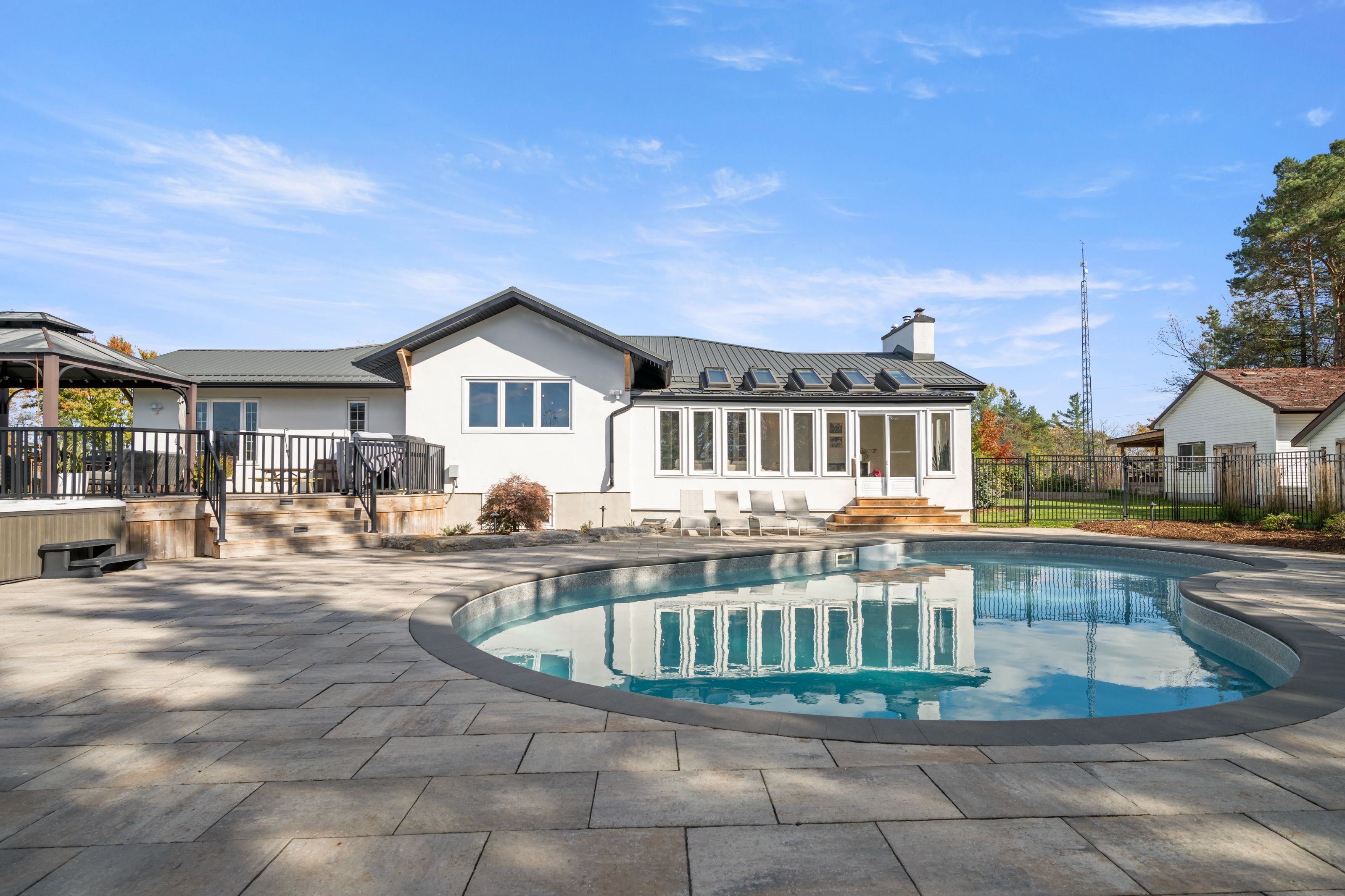 Welcome to this exceptional country estate, set on over 8 acres of picturesque, gorgeously landscaped land. From the moment you arrive the property will impress you, with its long winding driveway, which passes by a beautiful natural pond with a fountain, a fabulous resort-like back yard with multiple sitting areas, an inground pool, & a hot tub. Step inside to an inviting open concept main level, featuring a gorgeous chef-inspired kitchen with soaring high ceilings, premium finishes, and a seamless flow into the bright living & dining areas. A wonderful sunroom with heated floors offers year round comfort, & is the perfect place to unwind while enjoying panoramic views of the property. The main level boasts four large bdrms, including two luxurious suites, each with an ensuite bthrm & walk-in closet-ideal for family living, or hosting in style. There's also a 4 pc bath & a 3 pc shared bath on the main level, along with a convenient laundry room off the garage. The lower level is designed for versatility & entertainment, offering a family room, a 5th bedroom, & an in-law suite, that's perfect for your extended family to have their own space. It features a large bdrm, an updated bthrm with stackable laundry, a spacious kitchen/living/dining area, & a separate walk-up to the side yard. There is a door from the suite to the rest of the basement, so you could use the entire space for your own immediate family as well. Just a few of the upgrades include: hot tub '22, metal roof '22, stucco '22, approx. 2 acres of irrigation system, landscape lighting, & underground dog fence, many new windows, kitchen, flooring, & baths. Outdoors, the possibilities are endless, whether enjoying the heated pool (new liner '22), entertaining on the expansive patios & deck, simply soaking in the peace & beauty of country living, or exploring the acres of woods & skating on the pond in winter. Truly a one-of-a-kind property offering space, luxury, & unmatched tranquility! Luxury certified
