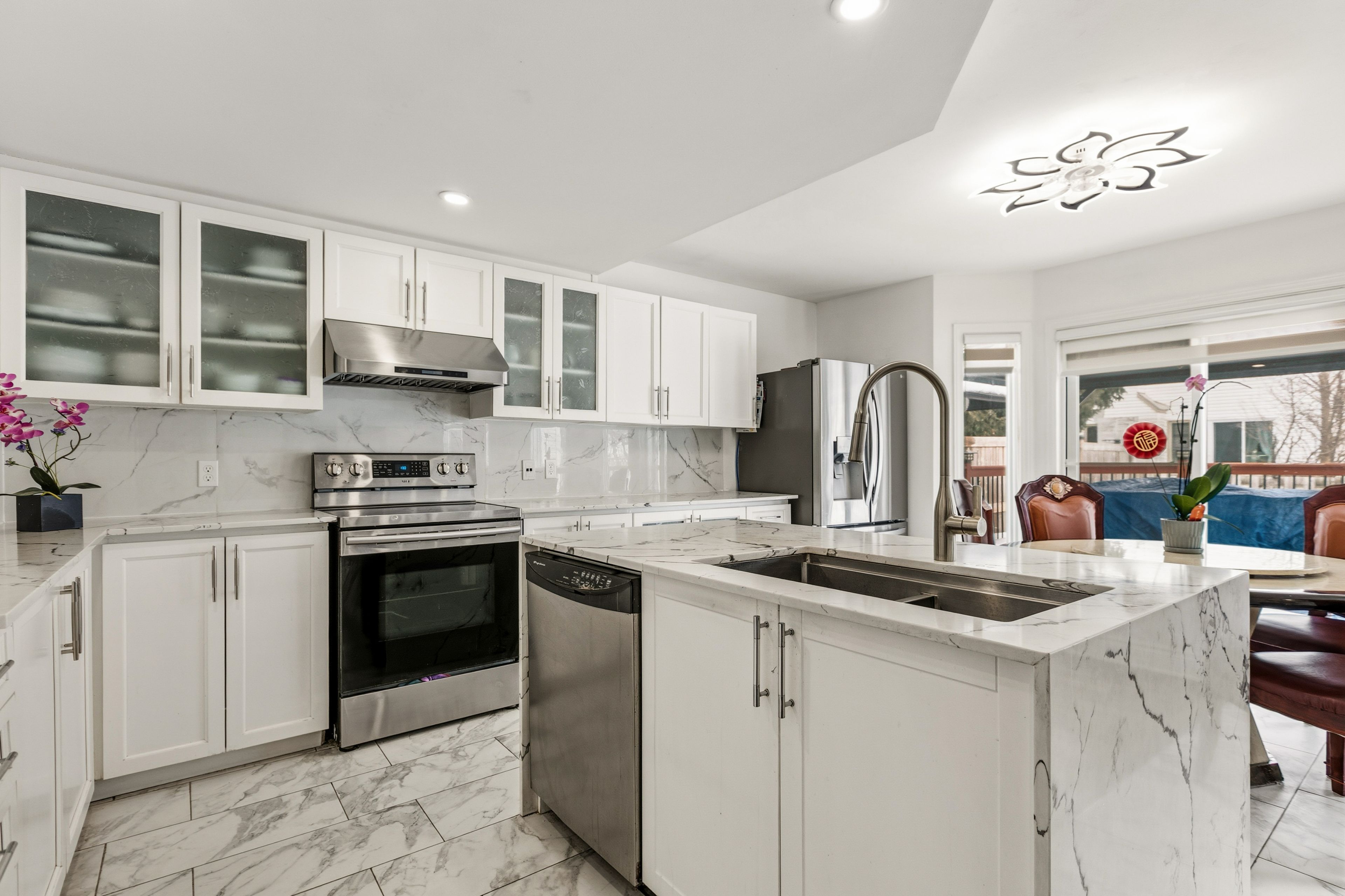 • Stylish kitchen with quartz countertops and stainless steel appliances.
