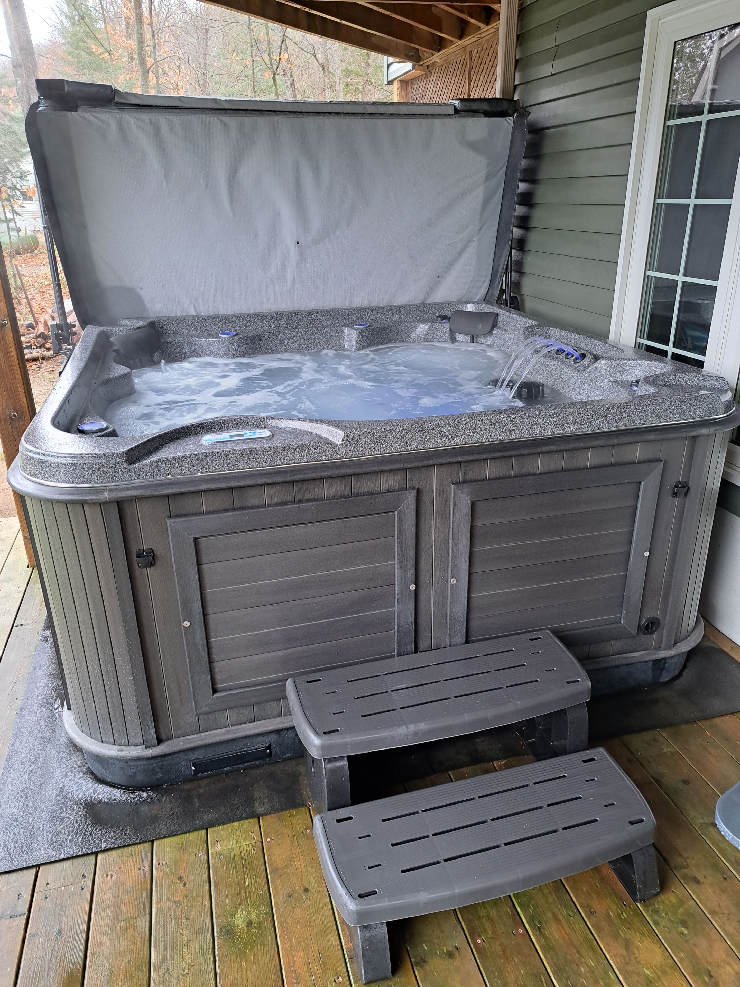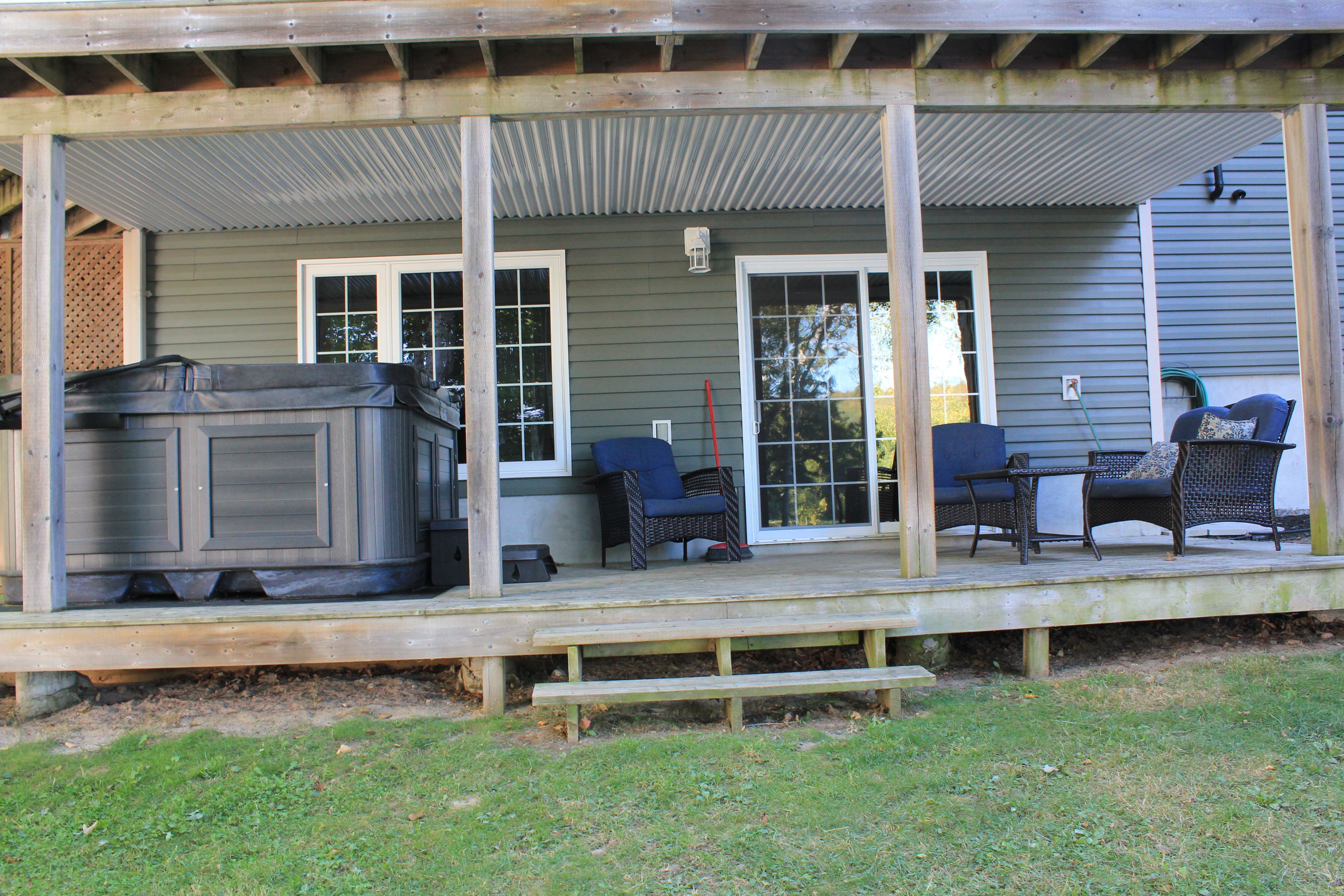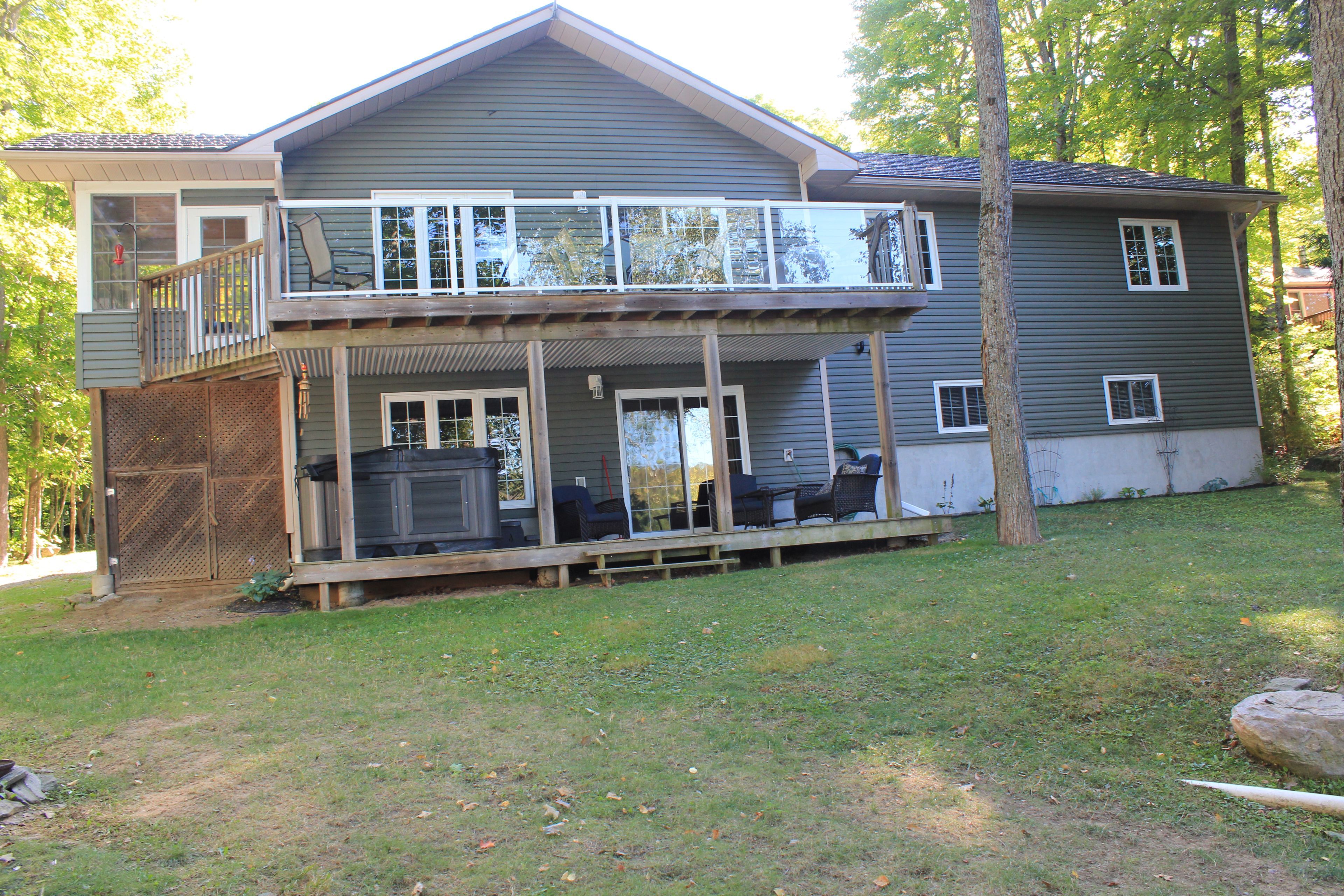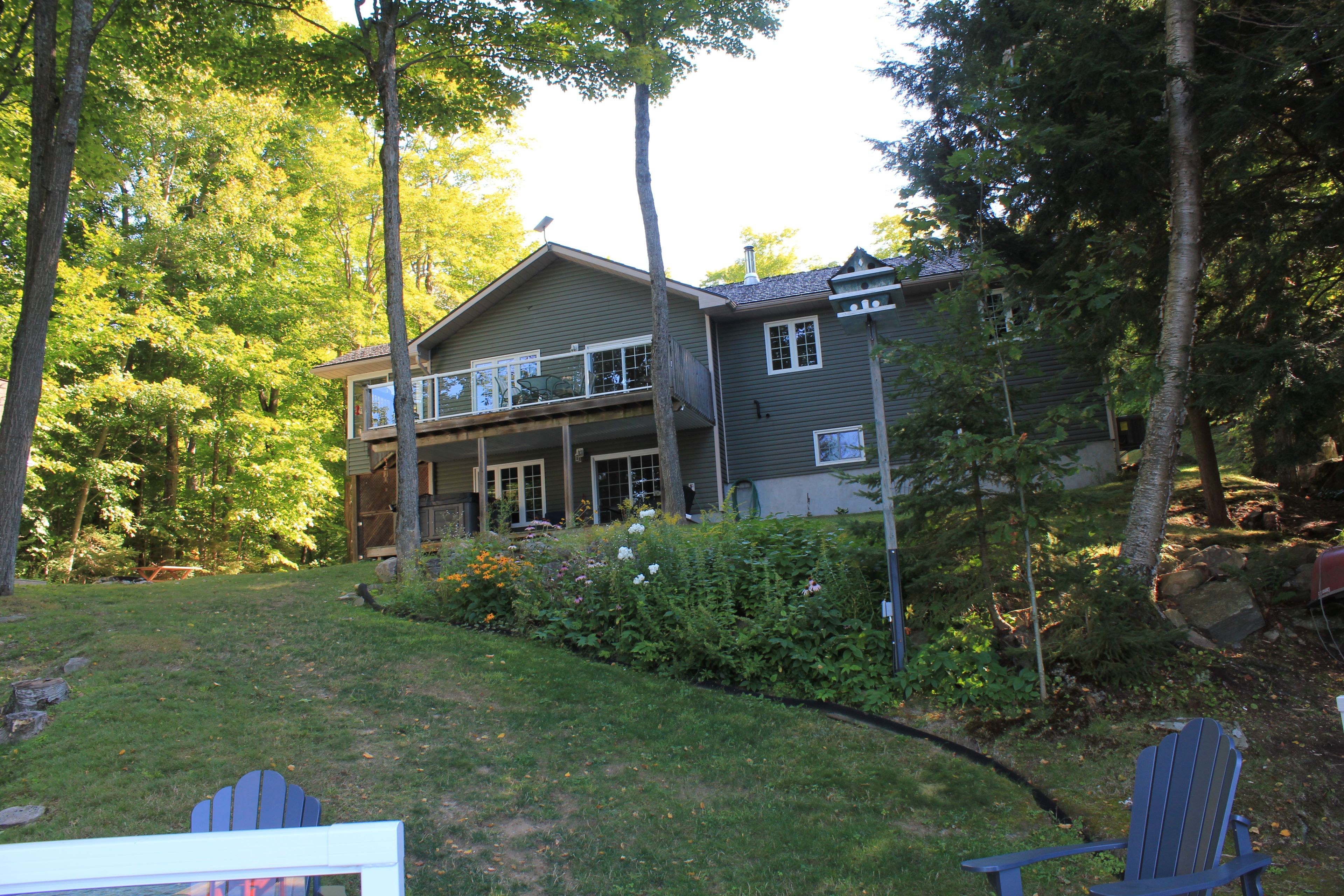• Additional perks include a hot tub, a bunkie, and convenient garages.