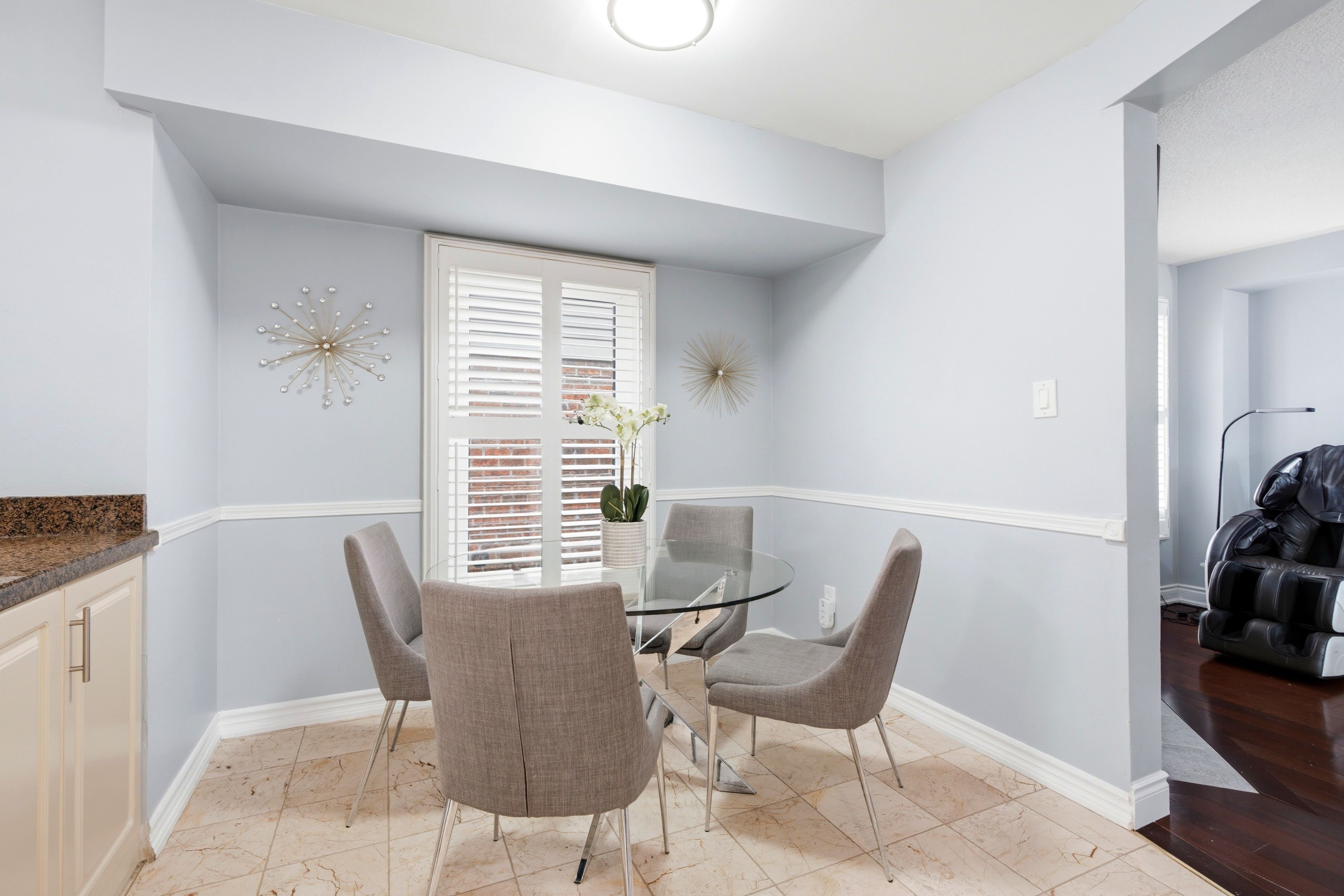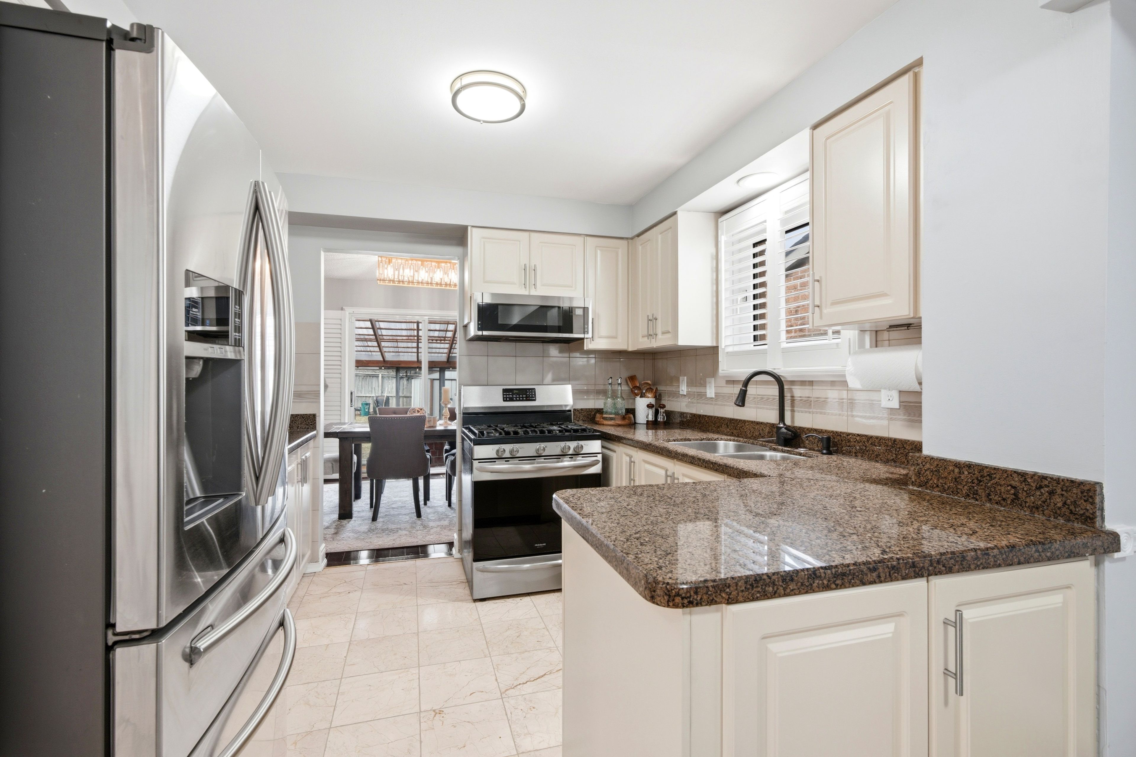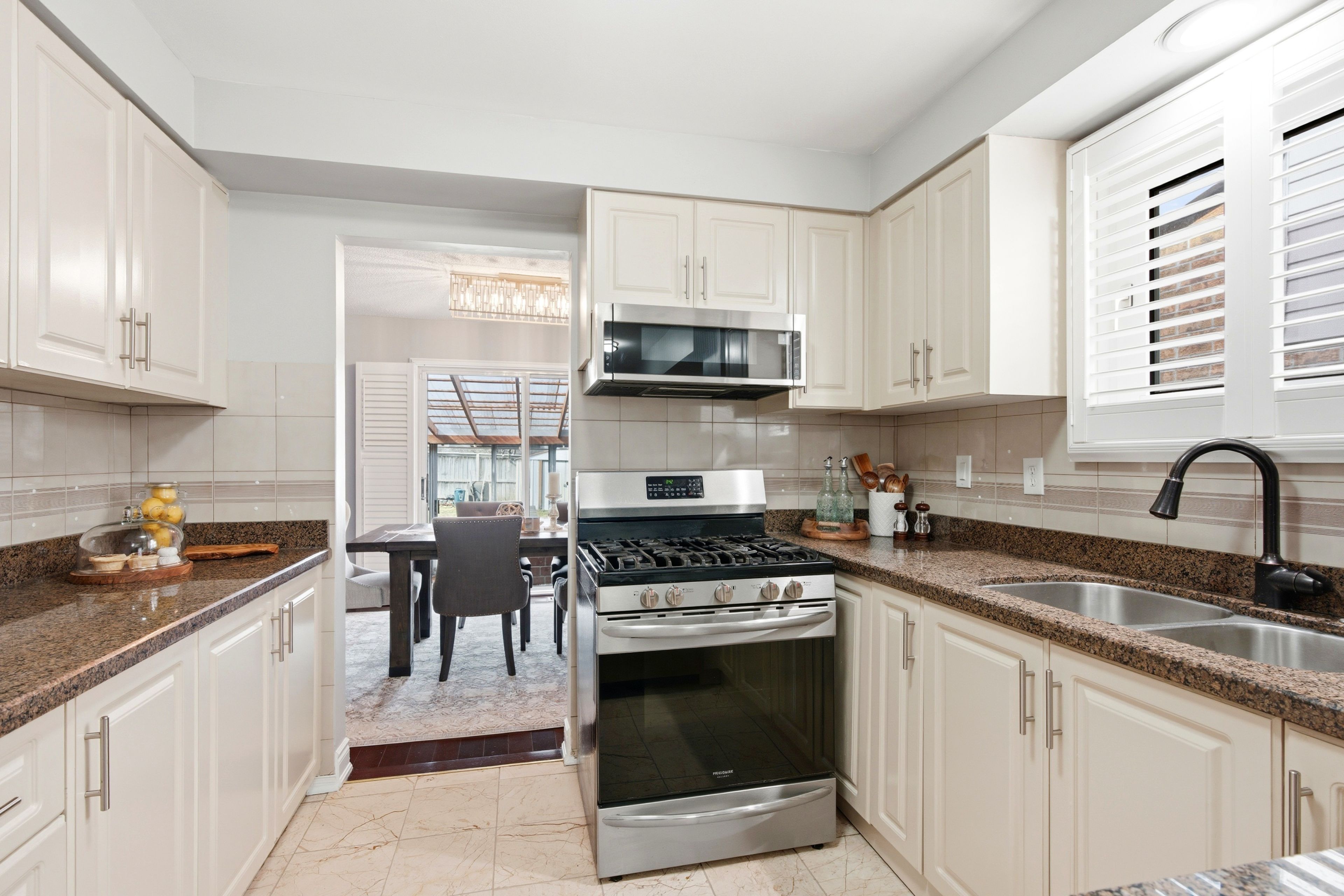 • Cozy eat-in kitchen with dining area overlooking the sunroom.