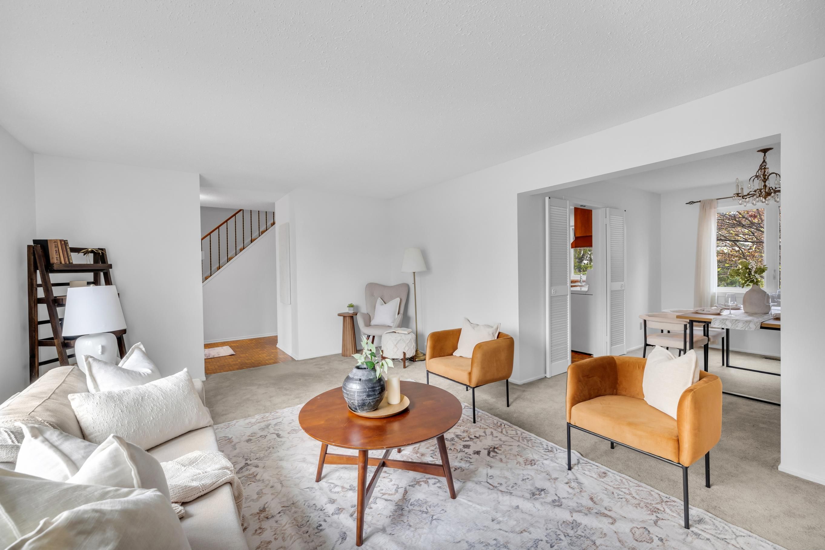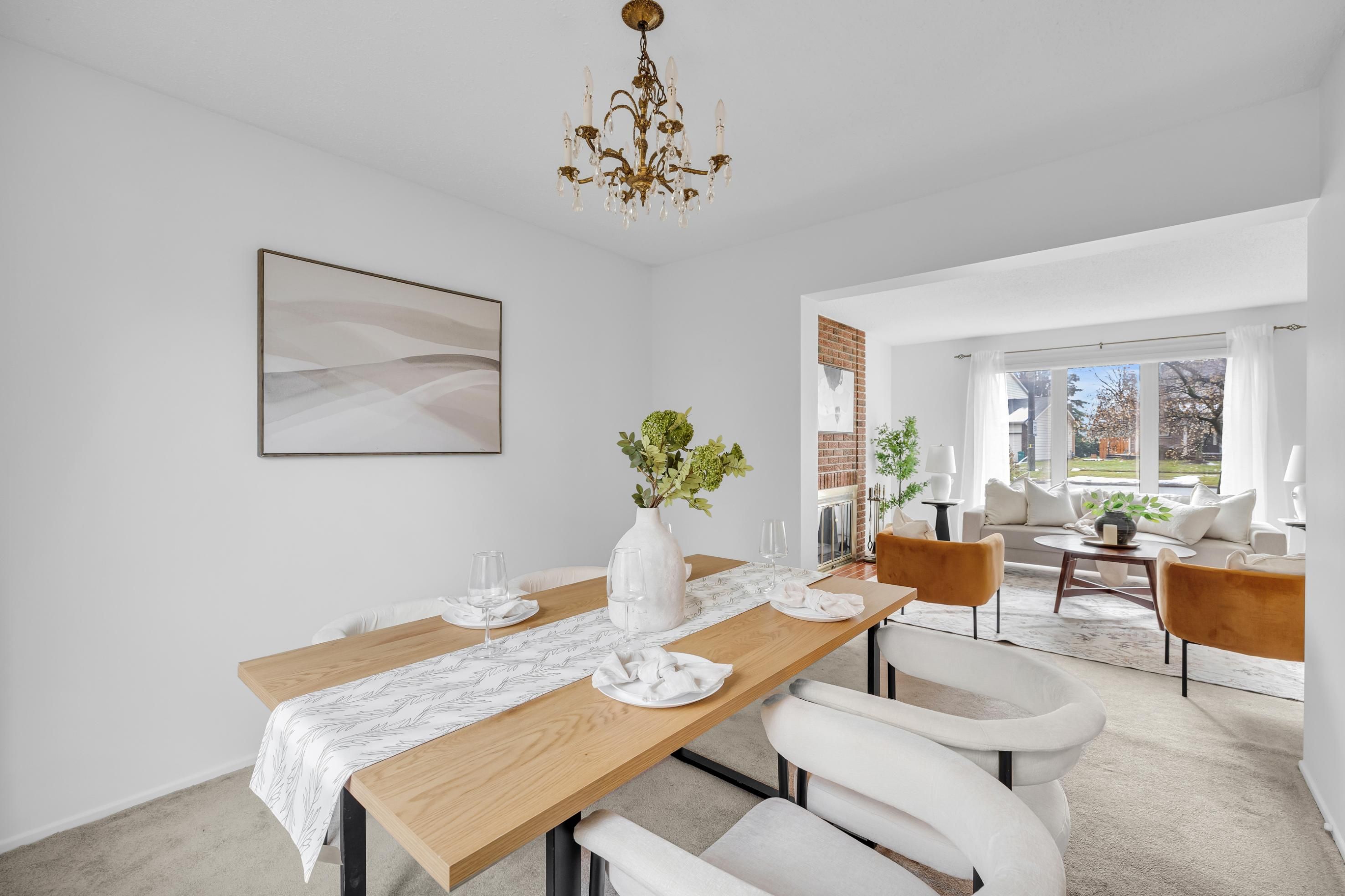 • Large living room with natural light and classic fireplace.
