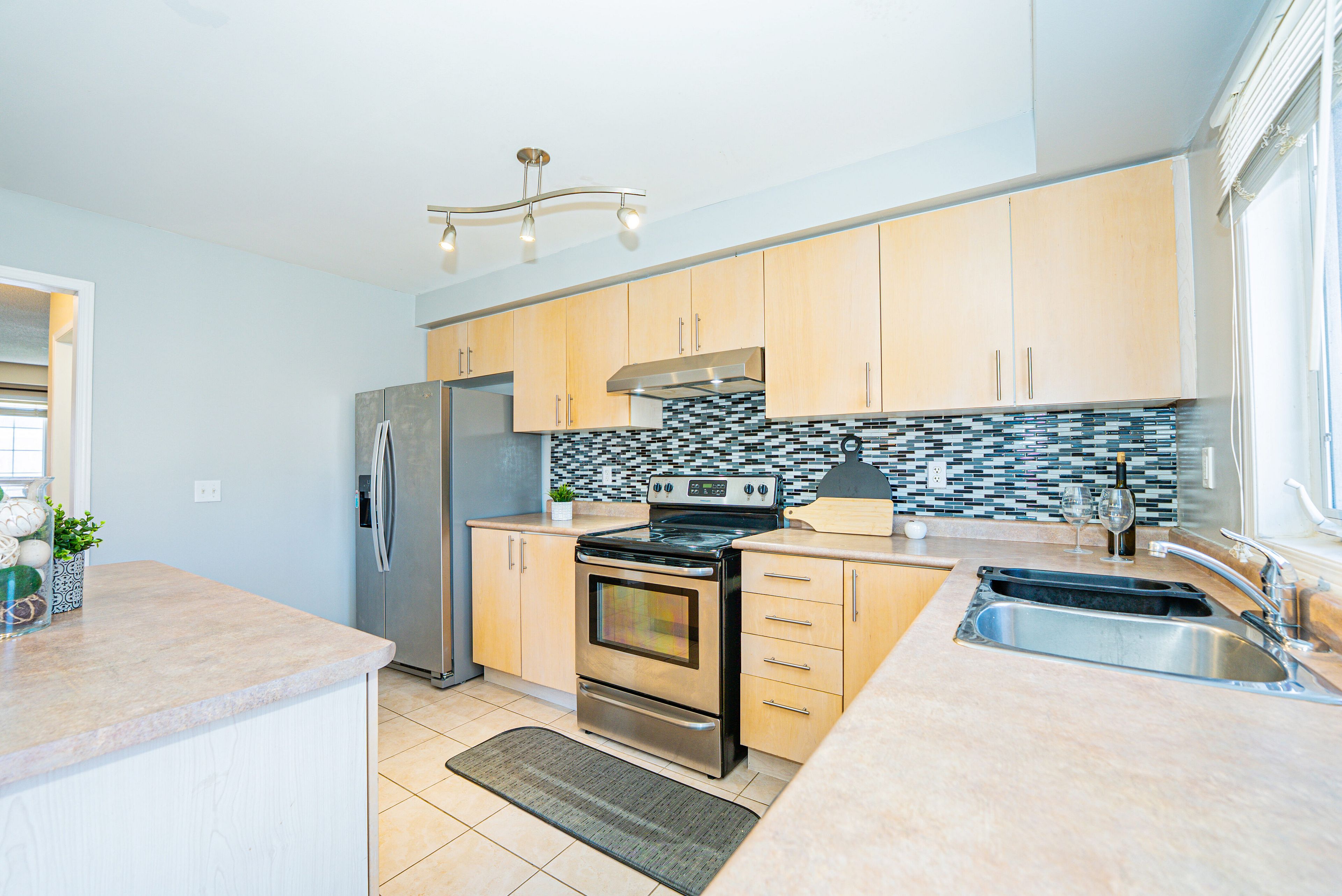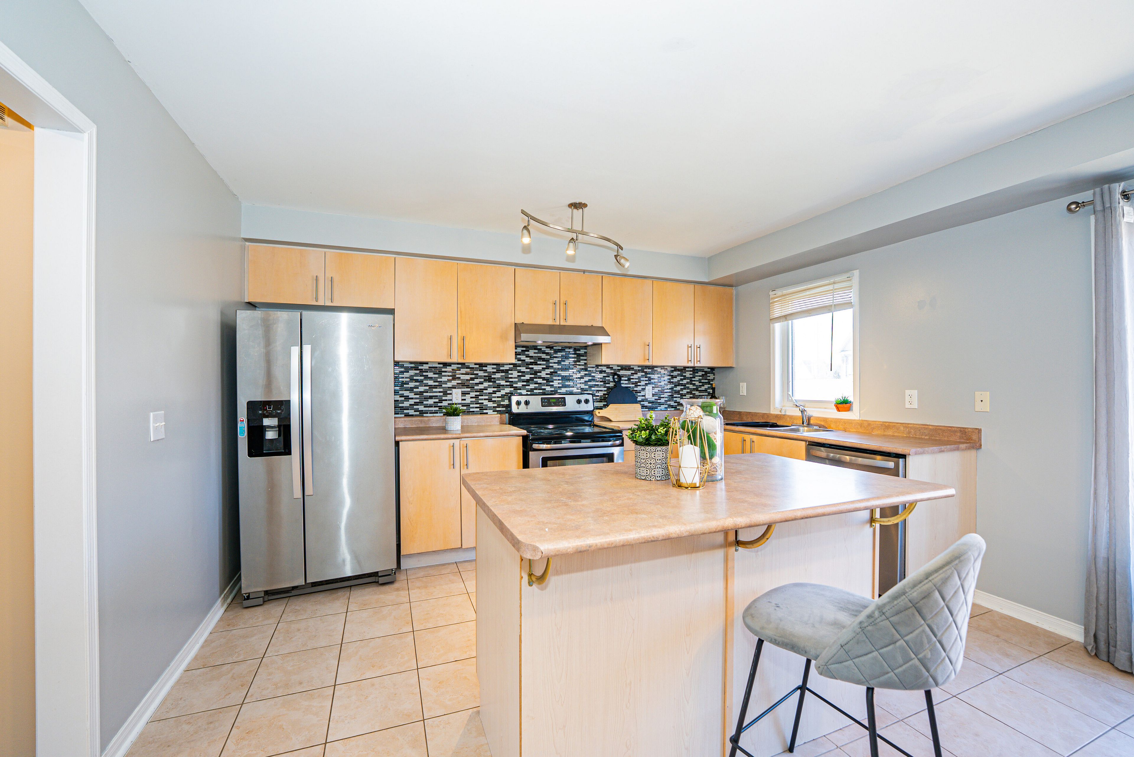 • Family-sized eat-in kitchen with stainless steel appliances.