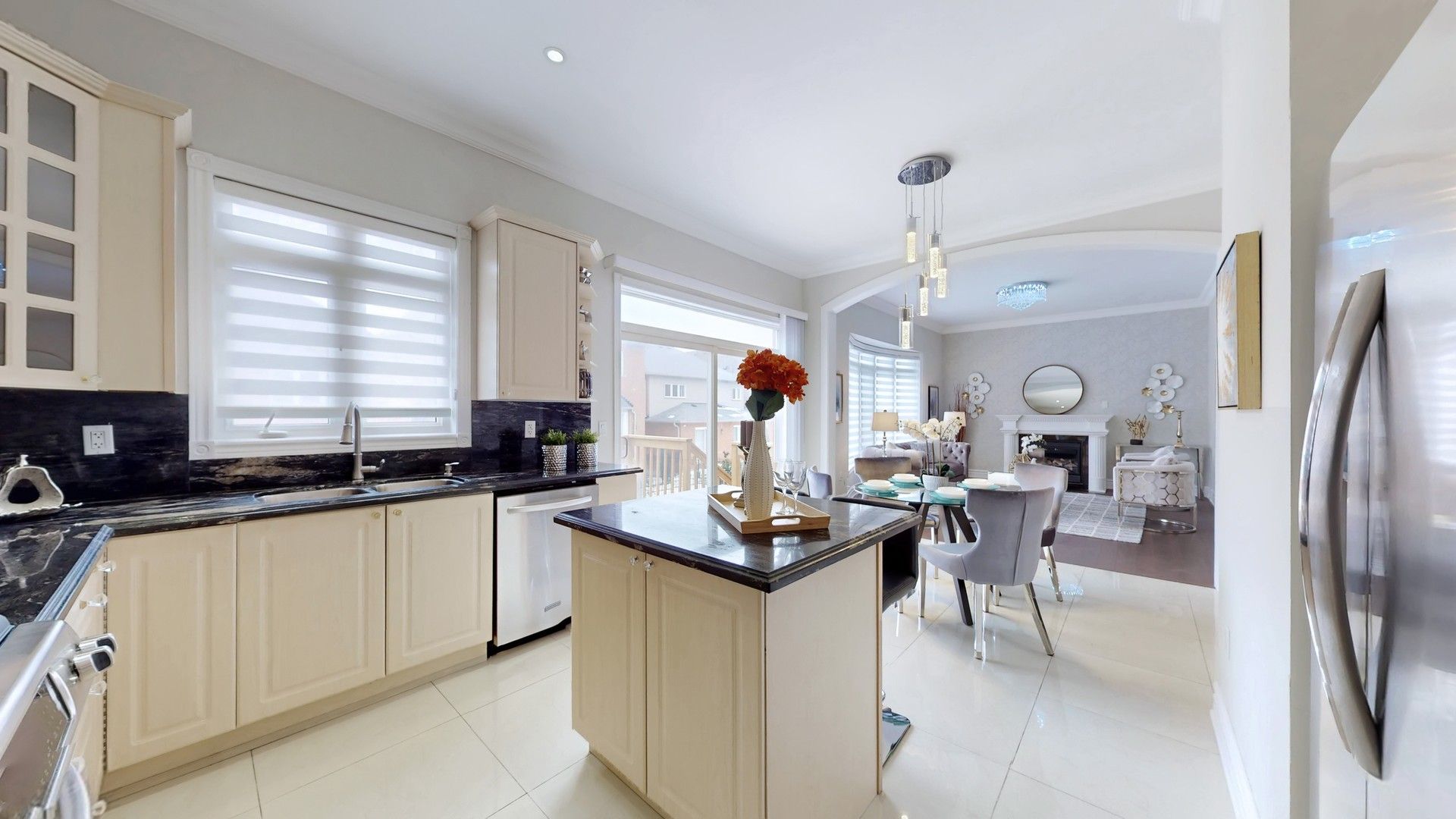 • Functional kitchen with granite counters and stainless steel appliances.