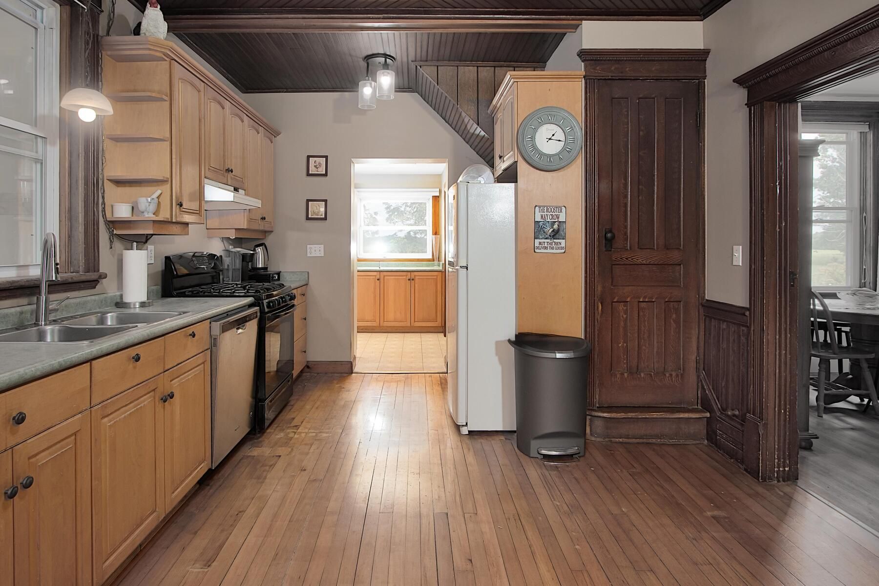 Major update coming this spring: a brand-new weeping bed will be installed, providing a valuable upgrade and added confidence for future owners. Welcome to this classic yellow brick century farmhouse, nestled on a generous 121 x 239 lot that offers exceptional privacy and timeless rural charm. This carpet-free home features 3 bedrooms and 2 full bathrooms, including a 4-piece bath on the upper level and a 3-piece bath on the main floor. The heart of the home is the kitchen, complete with maple cabinetry, maple flooring, a warm wood ceiling, and a gas stove, with dishwasher and fridge included. The adjoining dining room flows into a versatile office, currently used as a bedroom. The main floor also offers a cozy living room with maple flooring and a convenient laundry room (washer and electric dryer included, with gas hookup available). Enjoy the spacious double-plus garage with interior access to the laundry room, plus two included freezers. A unique walk-down entry from the garage leads to a partially finished basement featuring skylights, a rec room, propane heat, and a sump pump. Upstairs, you'll find three bright bedrooms, all with maple flooring, and a full 4-piece bath. Additional updates include a new garage roof (2014), drilled well with new pressure tank (2024), and the septic system pumped in 2022. Outdoor living shines with a front deck and gazebo (2021), a 40' x 16' drive-thru shed (2021), and a distinctive curved-roof shed currently used as a workshop. Fibre optic internet (quadro), mature trees, and quiet country surroundings complete the package - all just a short drive from town. If you're looking for space, character, and country charm, this farmhouse is a must-see.