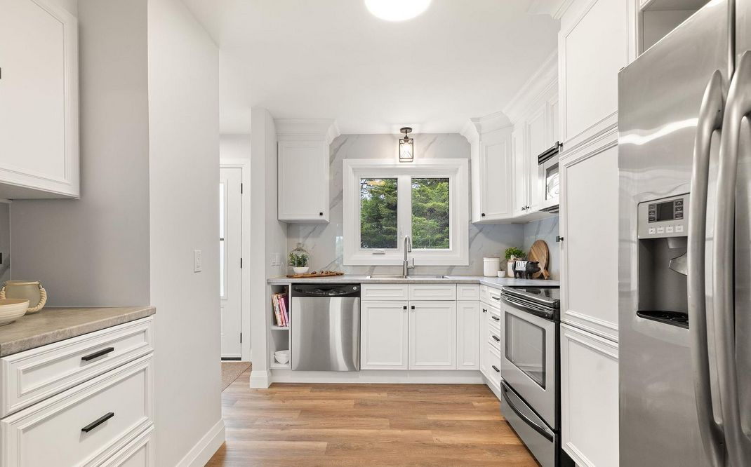 • Modern kitchen with stainless steel appliances and open flow to dining.