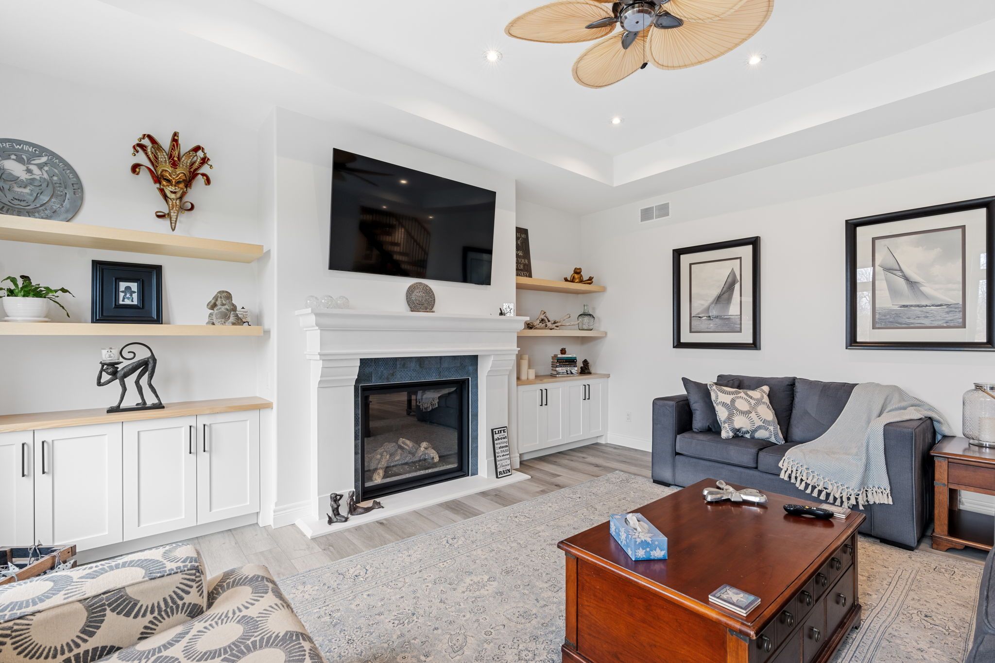 • Spacious family room features a gas fireplace and detailed ceiling.