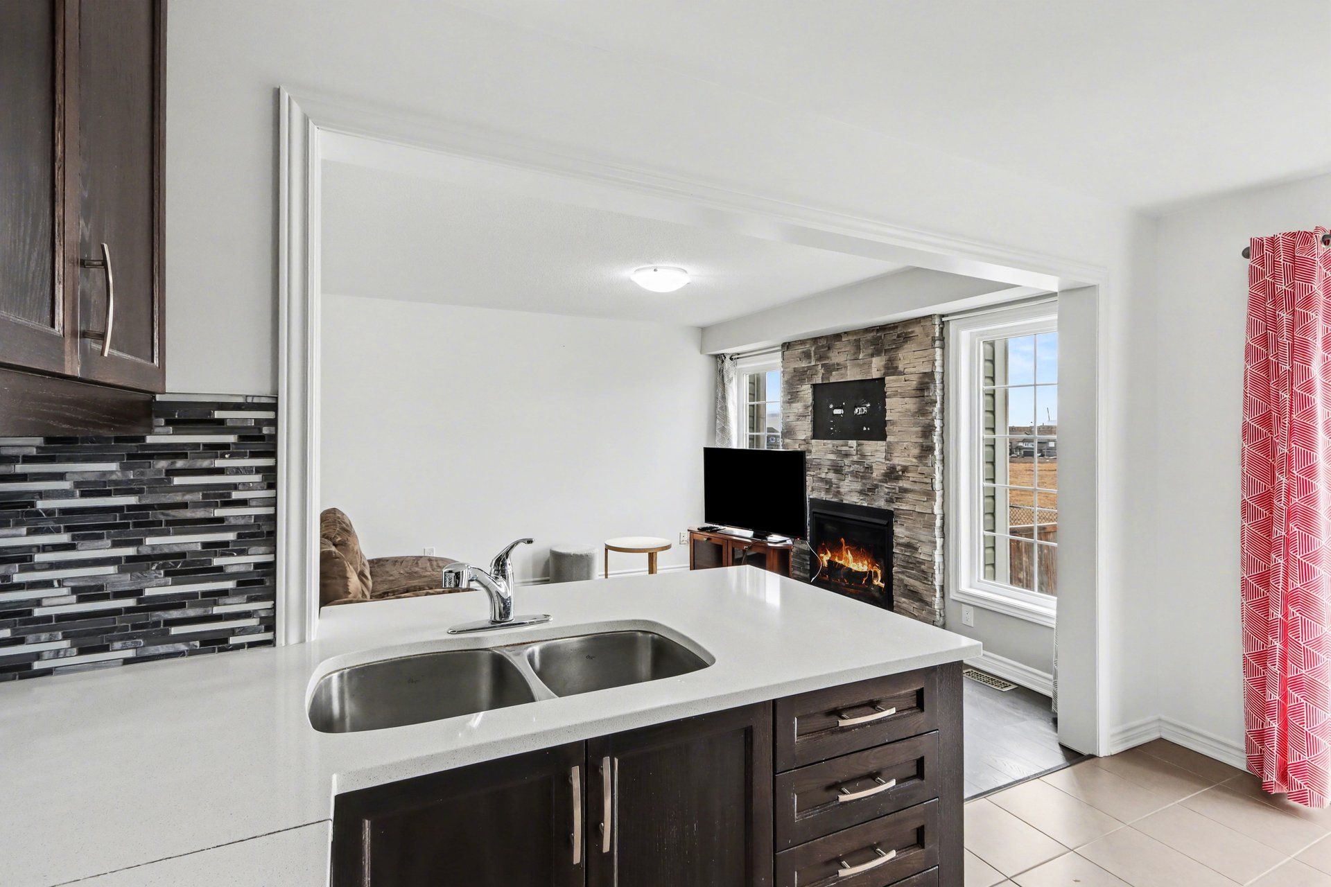 • Bright living and dining area featuring a cozy gas fireplace as a focal point.