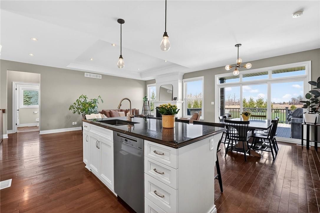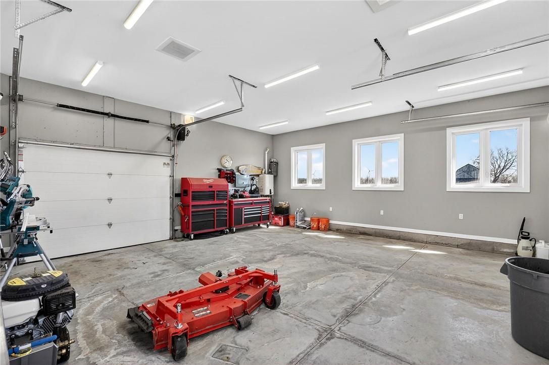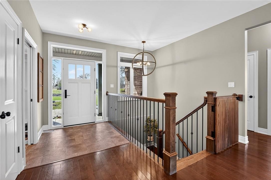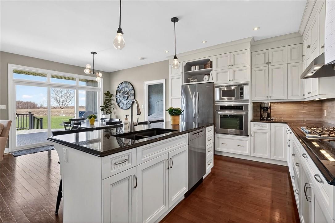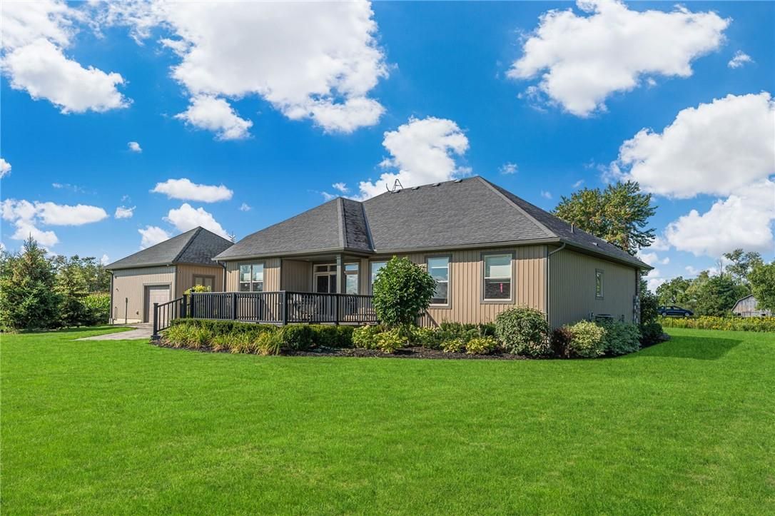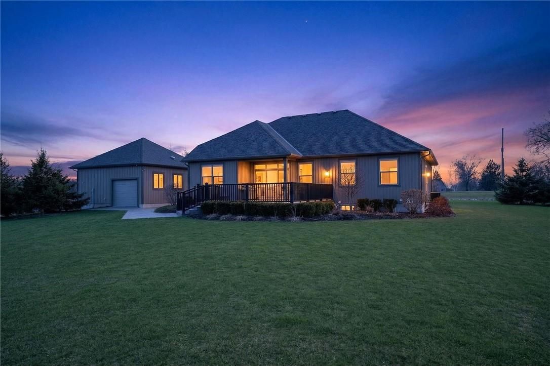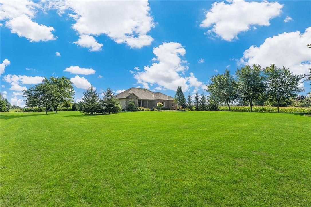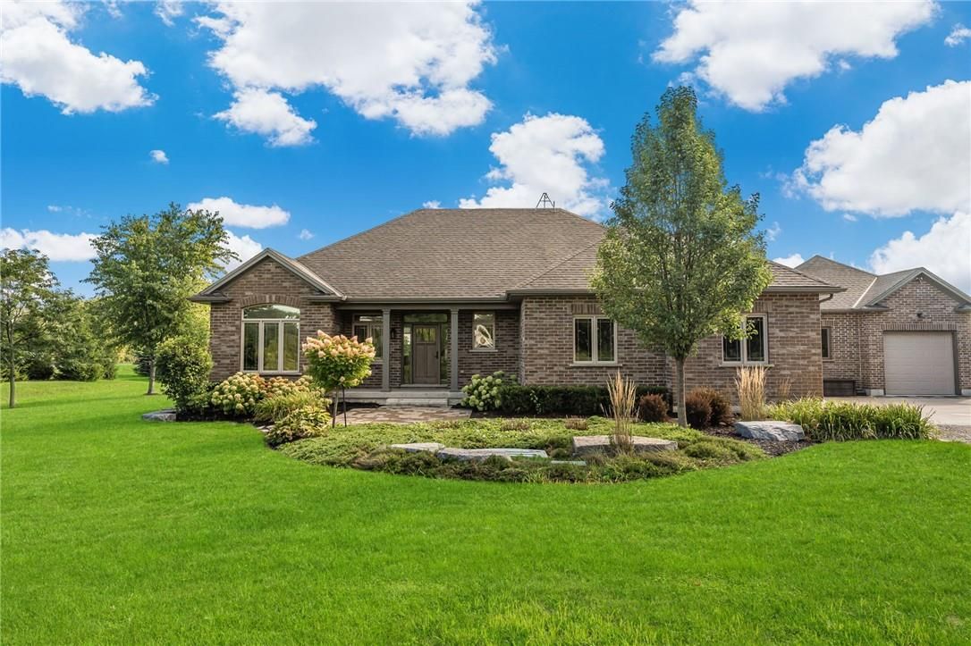 There are homes you walk into, and then there are properties that stop you before you even reach the front door. This 1,617 sqft bungalow showcases a timeless brick façade w/ over 3,000 sqft finished living space on a mature1. 5-acre country lot. A rare 24'x24' detached shop w/ spray foam insulation & in-floor heat delivers the bonus space buyers search years to find. Properties like this aren't easily replicated - everything is already here. Inside, hardwood flooring runs throughout the main level, anchored by a kitchen designed for those who love to cook & entertain. Featuring a gas cooktop, wall oven, granite countertops, ceiling-height white cabinetry w/ under-cabinet lighting, &a large island - this space is as functional as it is striking. The living room offers a gas fireplace & classic white mantel, complemented by a tray ceiling w/ crown moulding. The dining area leads to a covered composite deck w/sweeping views of open farmland. The primary suite is complete w/ a custom walk-in closet & a glass-enclosed ensuite featuring a rain head shower, spray bar, built-in bench, & quartz vanity. 2 additional bedrooms - including one w/ a vaulted ceiling & arched window - are served by a stylish 4-piece bath w/ quartz counters. A mudroom w/built-in storage & a 2-piece powder room adds everyday convenience. The lower level deserves its own spotlight. A sprawling rec room w/ pot lights & a fully equipped wet bar creates the ultimate entertaining space. A separate lounge w/ a stacked stone gas fireplace offers a cozy retreat. W/ a fourth bedroom, 3-piece bath w/ glass shower, spacious laundry room w/ custom cabinetry & oversized sink, & ample storage, this level functions as a complete second living space. Outdoors, the composite deck offers covered & open-air living, stepping down to interlock walkways & a beautifully maintained lot framed by mature trees & uninterrupted farmland views. This is a one-of-a-kind property that truly needs to be experienced in person.
