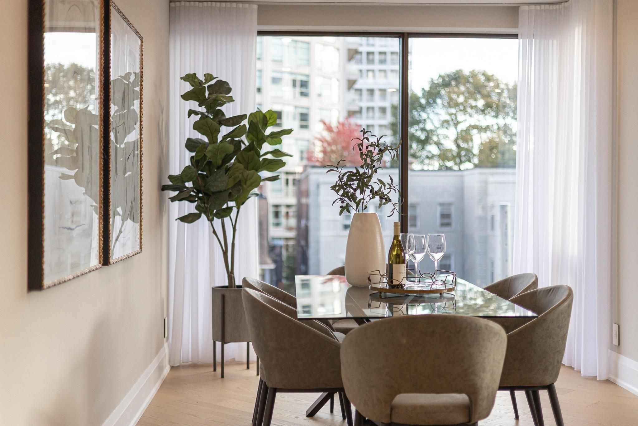 • Natural light floods the space through floor-to-ceiling glass windows.