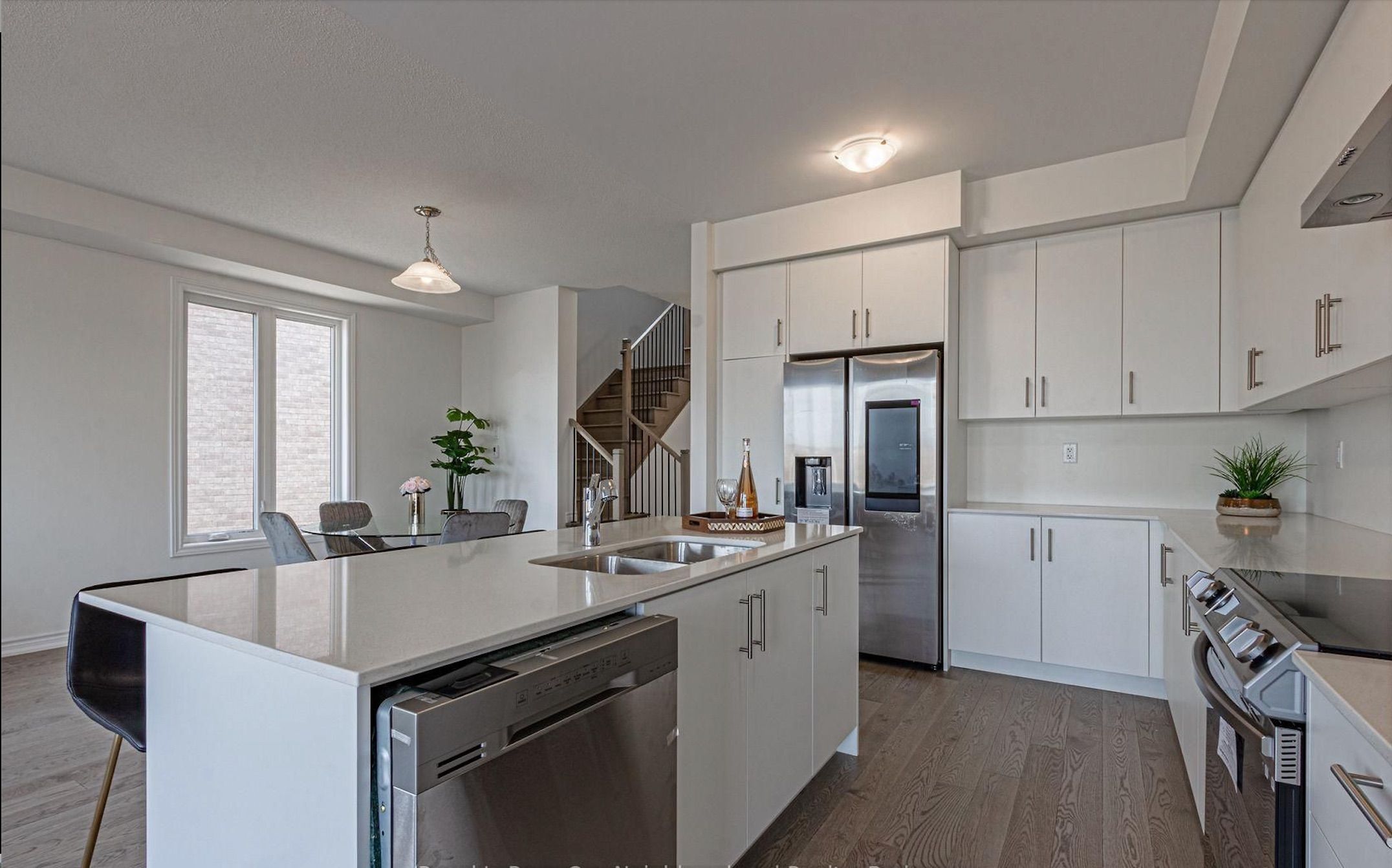 Welcome to 342 thimbleweed crescent, a spacious great gulf-built home offering over 2,000 sq. Ft. Above grade. Featuring 4 bedrooms and 4 bathrooms, this home sits on a premium pie-shaped lot and combines modern upgrades with a functional, family-friendly layout. The property also offers a double driveway with no sidewalk and an extended parking area, providing a total of three parking spaces. The main and upper level showcases upgraded hardwood flooring throughout, complemented by elegant matching hardwood stairs that extend to the basement. The open-concept layout is ideal for both everyday living and entertaining, anchored by a modern kitchen equipped with brand-new, high-end appliances, all covered under warranty. Upstairs, you'll find four generously sized bedrooms along with the convenience of second-floor laundry. The primary suite features a beautifully upgraded ensuite, offering a comfortable and private retreat. This home includes several valuable upgrades, including the installation of a central a/c unit, a fully fenced backyard, and high end appliances. A separate side entrance-an upgrade from the builder-leads to the basement, where a bathroom has already been completed. With the existing side entrance, walkout access, and completed bathroom, the basement offers excellent potential to be finished as a full legal rental suite with a relatively small additional investment. Located in a growing and family-friendly community close to parks, schools, shopping, and everyday amenities, this property presents an exceptional opportunity for families and investors alike.