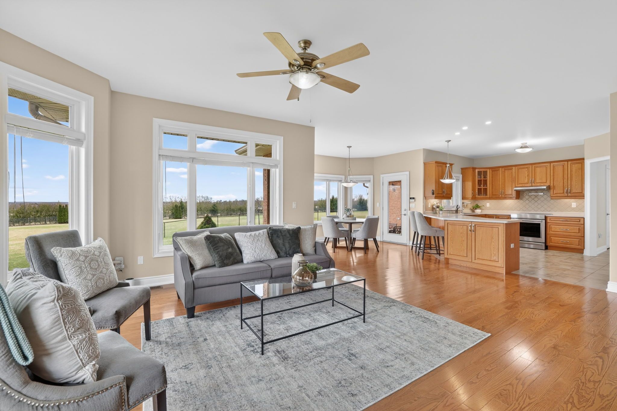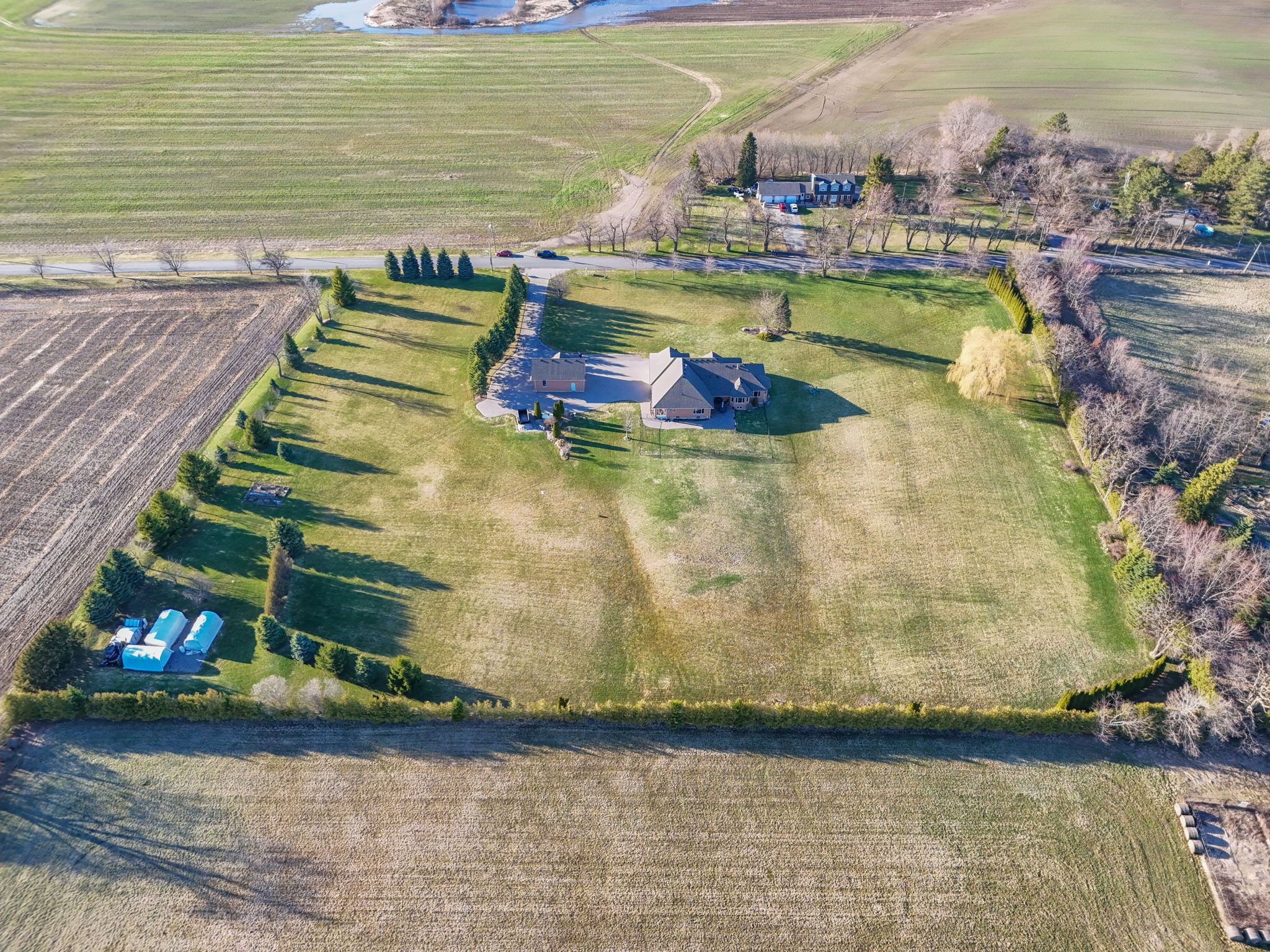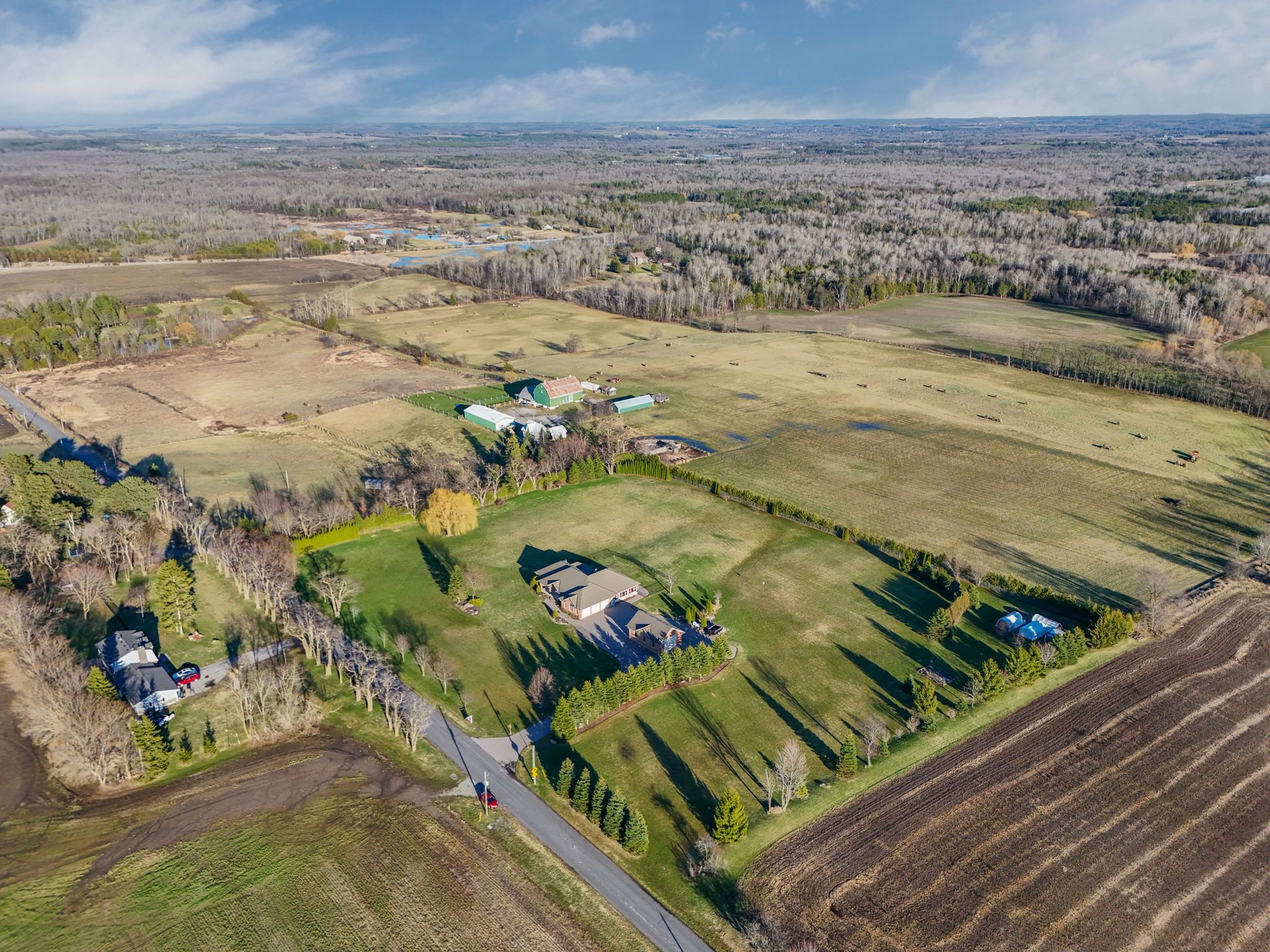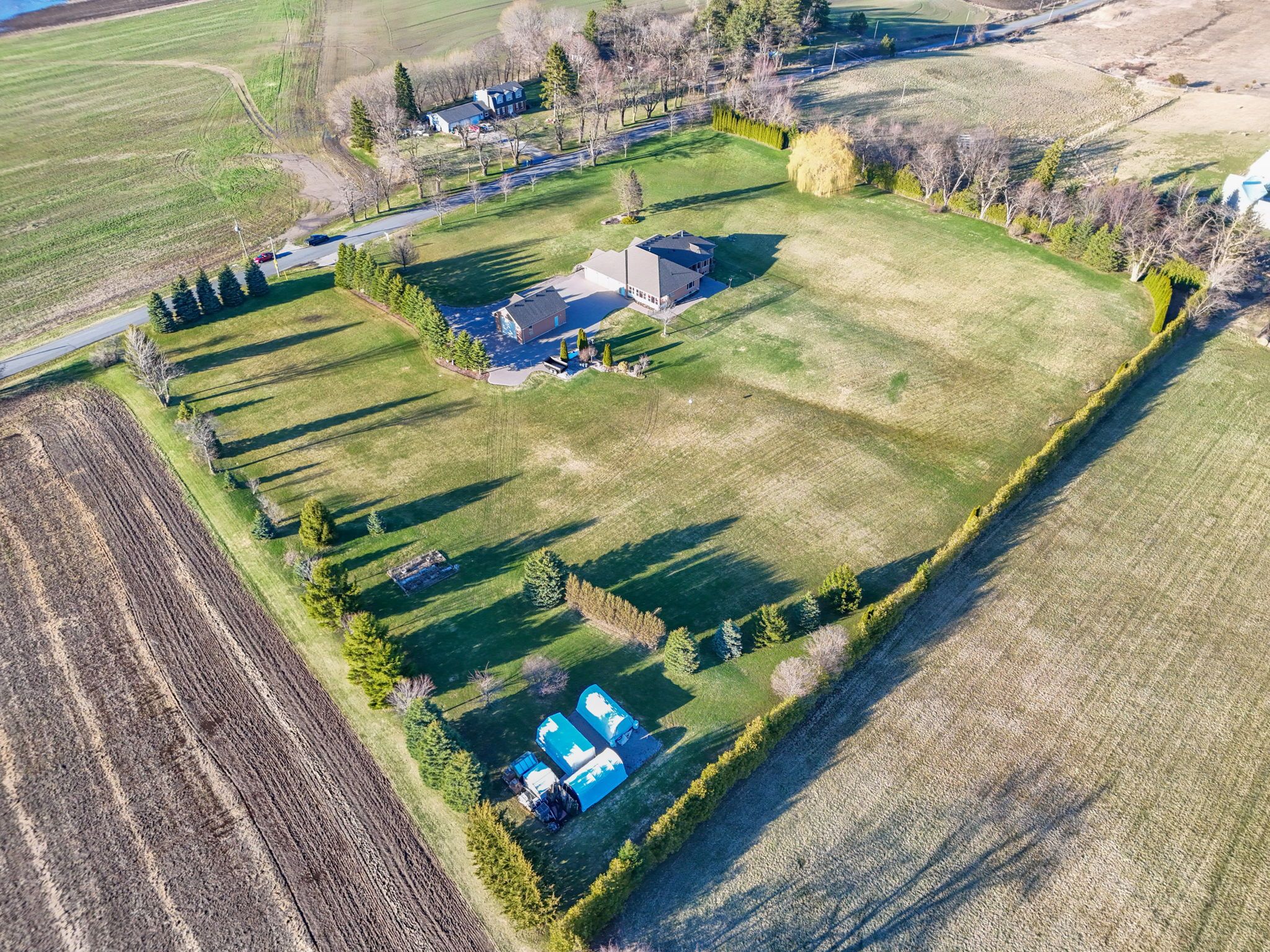 If you've been waiting for a property that offers real privacy, space for the whole family, room for all of your recreational equipment and a home built to a standard you simply can't replicate today, this is it. Set on 6. 60 acres of flat, open land with unobstructed views for miles in every direction, this custom-built bungalow by fifthshire homes is a rare offering for buyers who understand quality and refuse to compromise. With over 5,000 sq ft of finished living space, this home was built well beyond typical standards. Constructed to r-2000 specifications for superior energy efficiency, built with intention, key features include spray foam insulation, triple-glazed windows, engineered steel beam construction, and a high-efficiency hvac system with hrv, creating a home that is quieter and more efficient. This is a property where quality is felt in every detail. On the main level, you'll find 9-ft ceilings, an open-concept great room, 3 spacious bedrooms, including 2 primary bedrooms with en-suites and walk-in closets, hardwood flooring, solid oak staircases, a 2-sided gas fireplace, and a 3-season room. The fully finished lower level features 2 additional bedrooms, a full kitchen, 3-pc bath, large family room, and above-grade windows - ideal for multi-generational living or extended family. Positioned on a high and dry lot, the land is flat, usable, and completely private, offering endless potential. Enjoy your morning coffee while taking in breathtaking sunrises, and end your day with a glass of wine and sunset views that stretch for miles. Extra-deep 3-car garage plus a detached 860 sq ft garage. Located just 5 minutes to hwy 404 and 15 minutes to the eg go station. This is more than a home; it's a property for someone who values space, understands quality, and knows you don't wait when something like this comes along.
