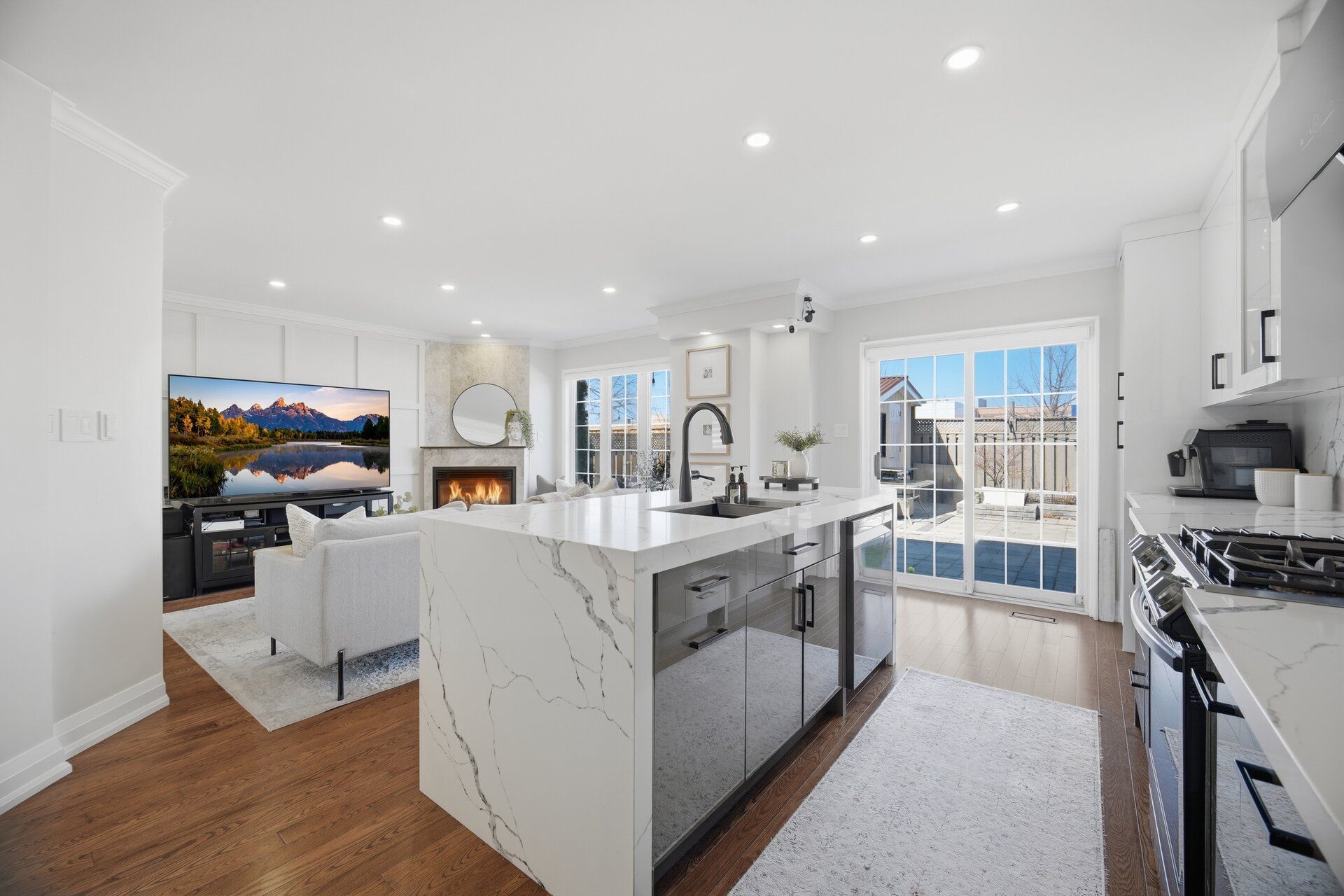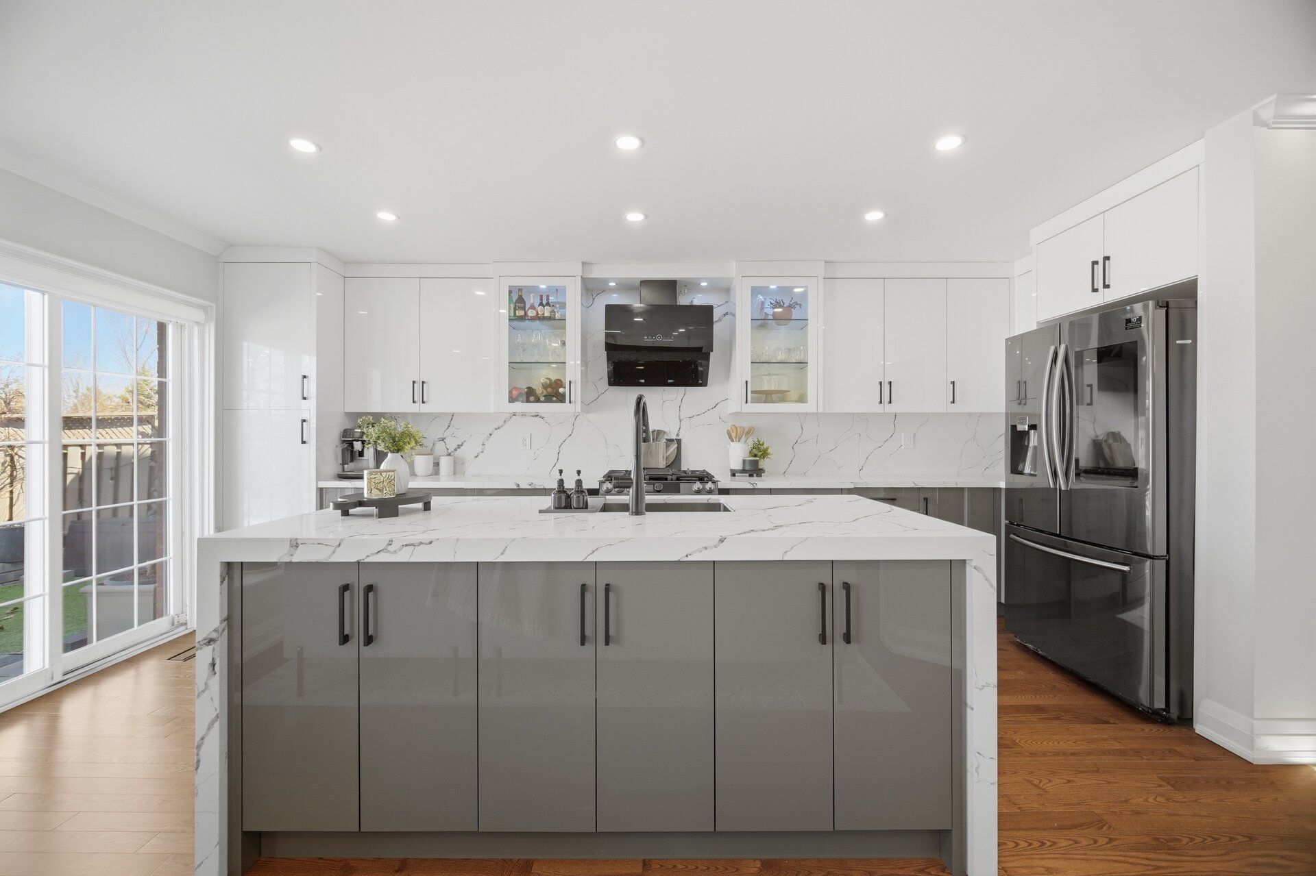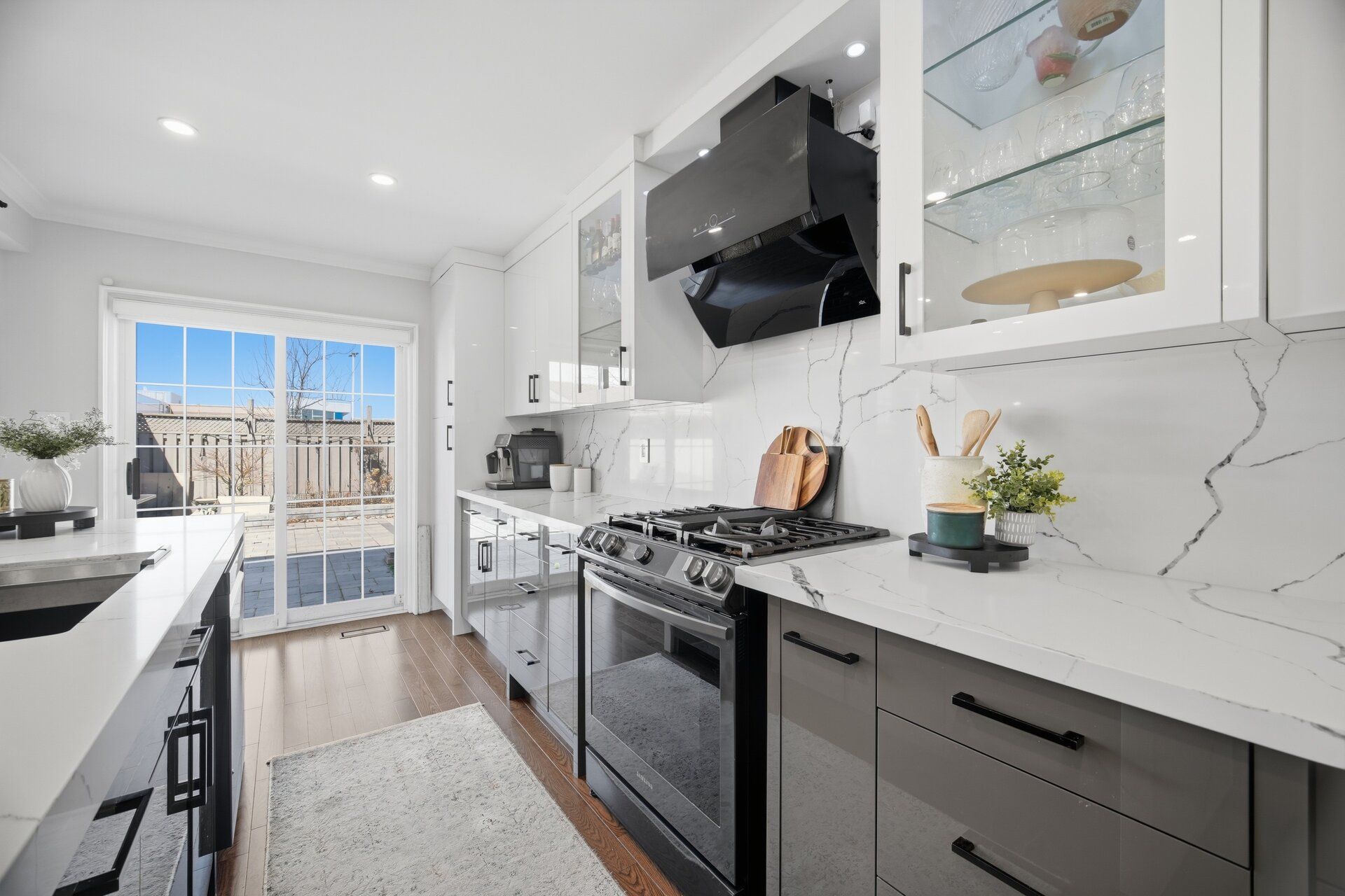 • Stylish kitchen features quartz island and walkout to landscaped backyard.