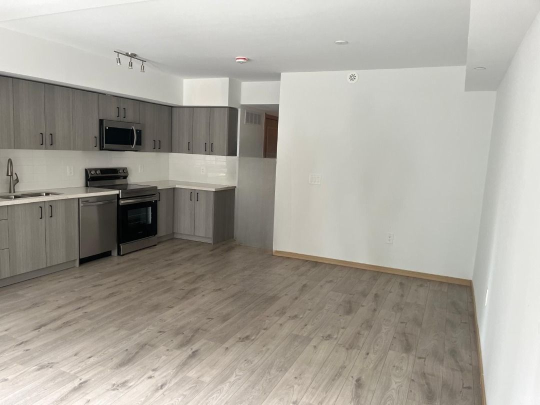 Modern 2 bedroom + den, 2 full bath condo townhouse in a prime location with direct access to public transit, medical clinic, and physiotherapy services. Features include spacious bedrooms, a den large enough to function as a third bedroom, two upgraded bathrooms, a gourmet kitchen with quartz countertops and stainless steel appliances, engineered hardwood laminate flooring, and large windows throughout. Enjoy outdoor living on your private patio. Building amenities include 24/7 concierge, fitness centre, underground parking, party room, and landscaped terrace. A rare opportunity to lease in one of the city's most desirable communities. Ev parking